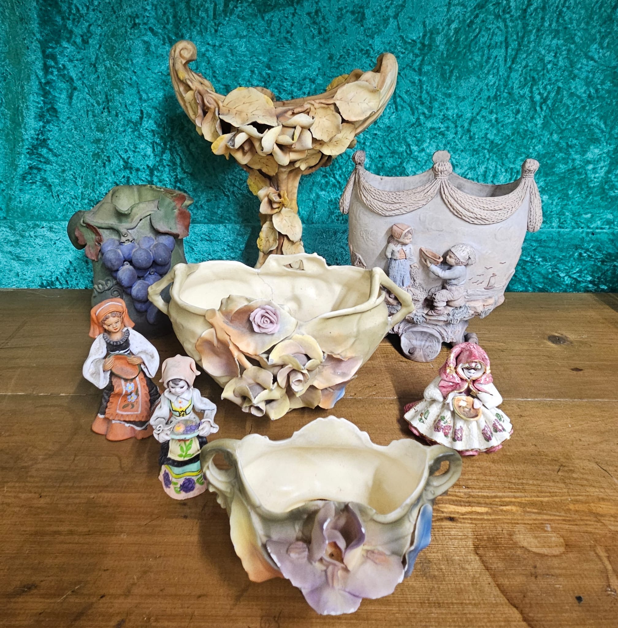 A Collection of Eight Decorative Ceramic and Resin Objects, including Planters, Vases, and Figurines