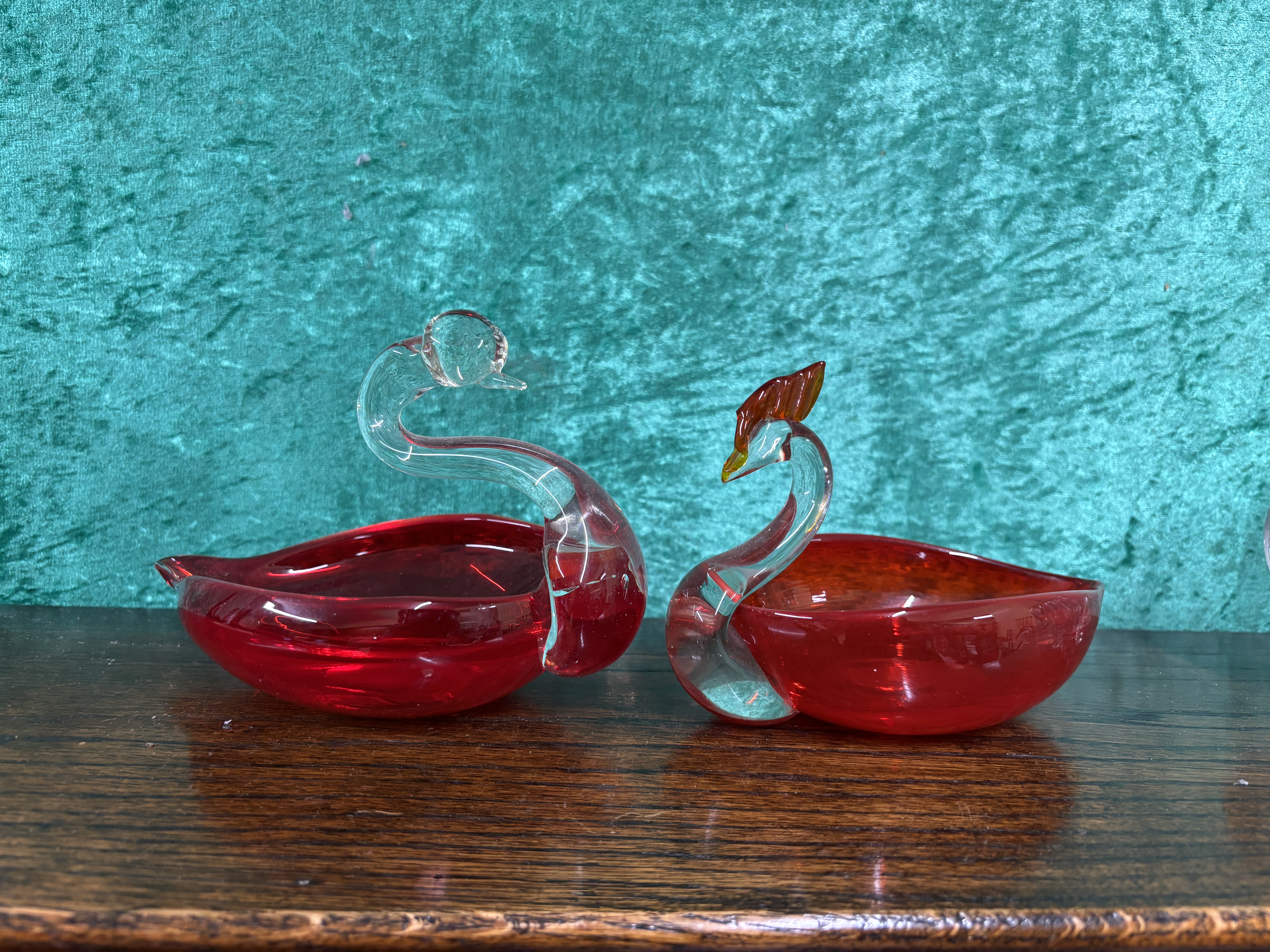 A Pair of Duncan Miller Ruby Red Art Glass Swan Candy Dishes