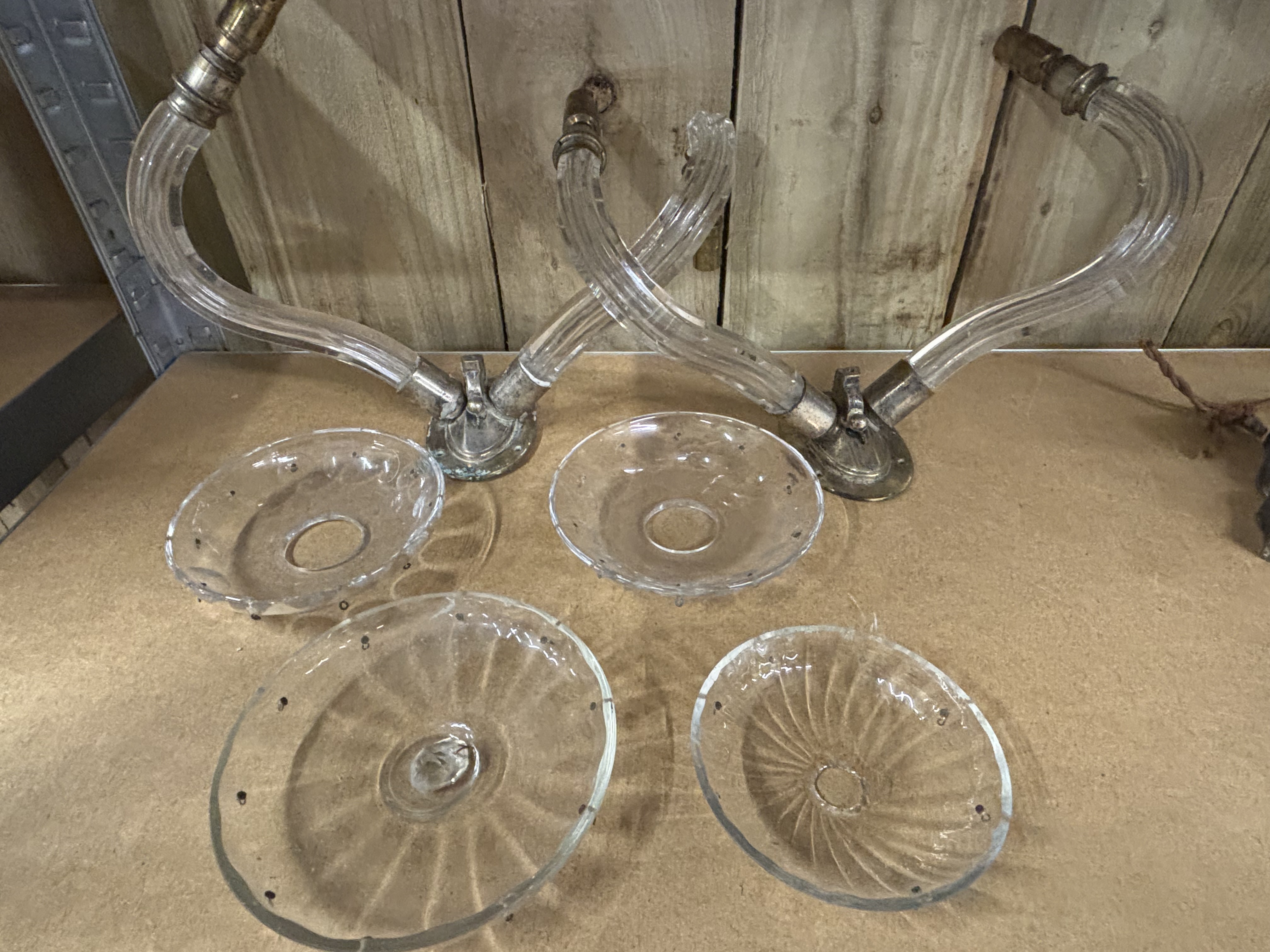 A Group of Late 19th / Early 20th Century Chandelier or Sconce Parts, comprising Two S-Curve Fluted Glass Arms and Four Pressed Glass Bobeches