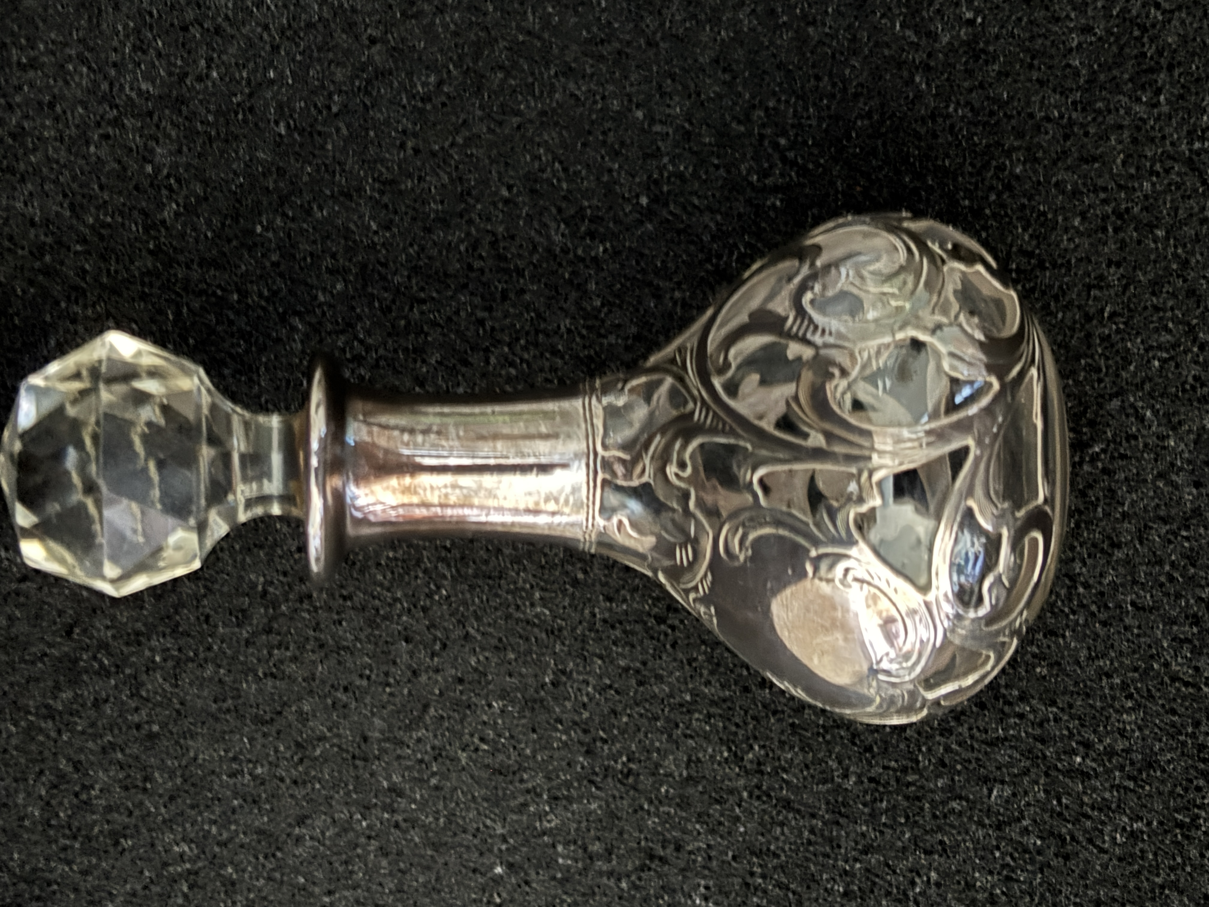 A glass scent bottle with white metal overlay...