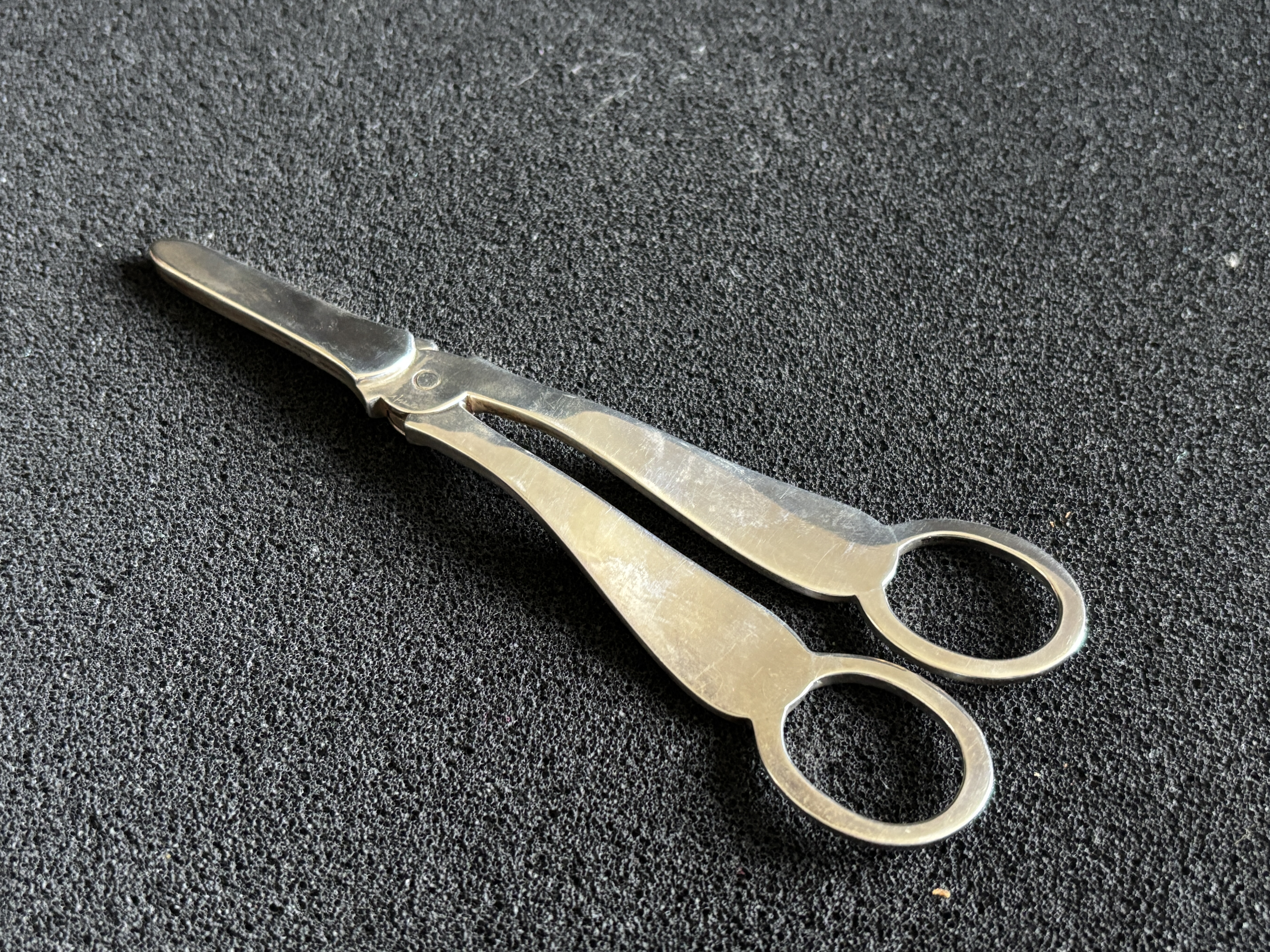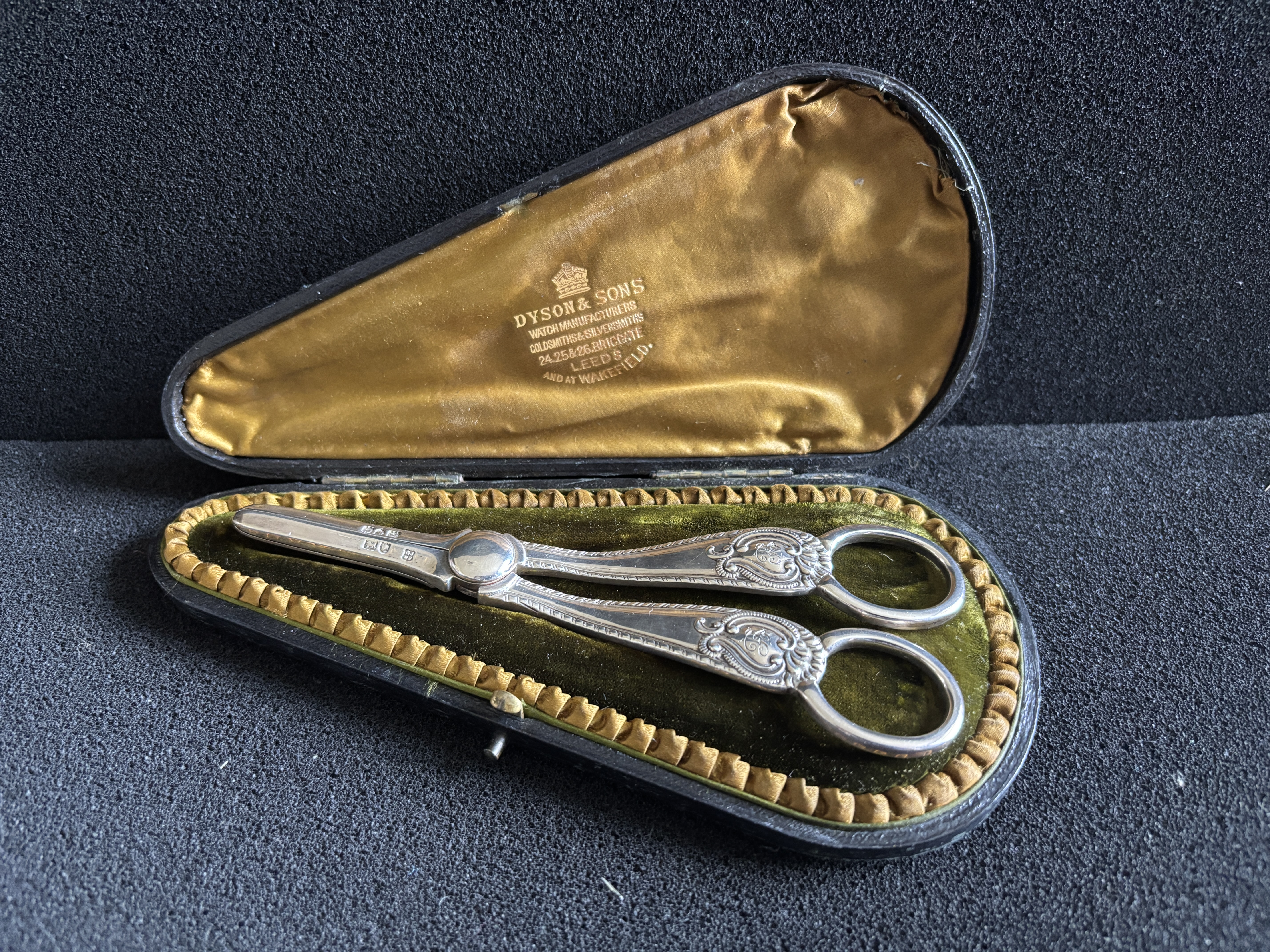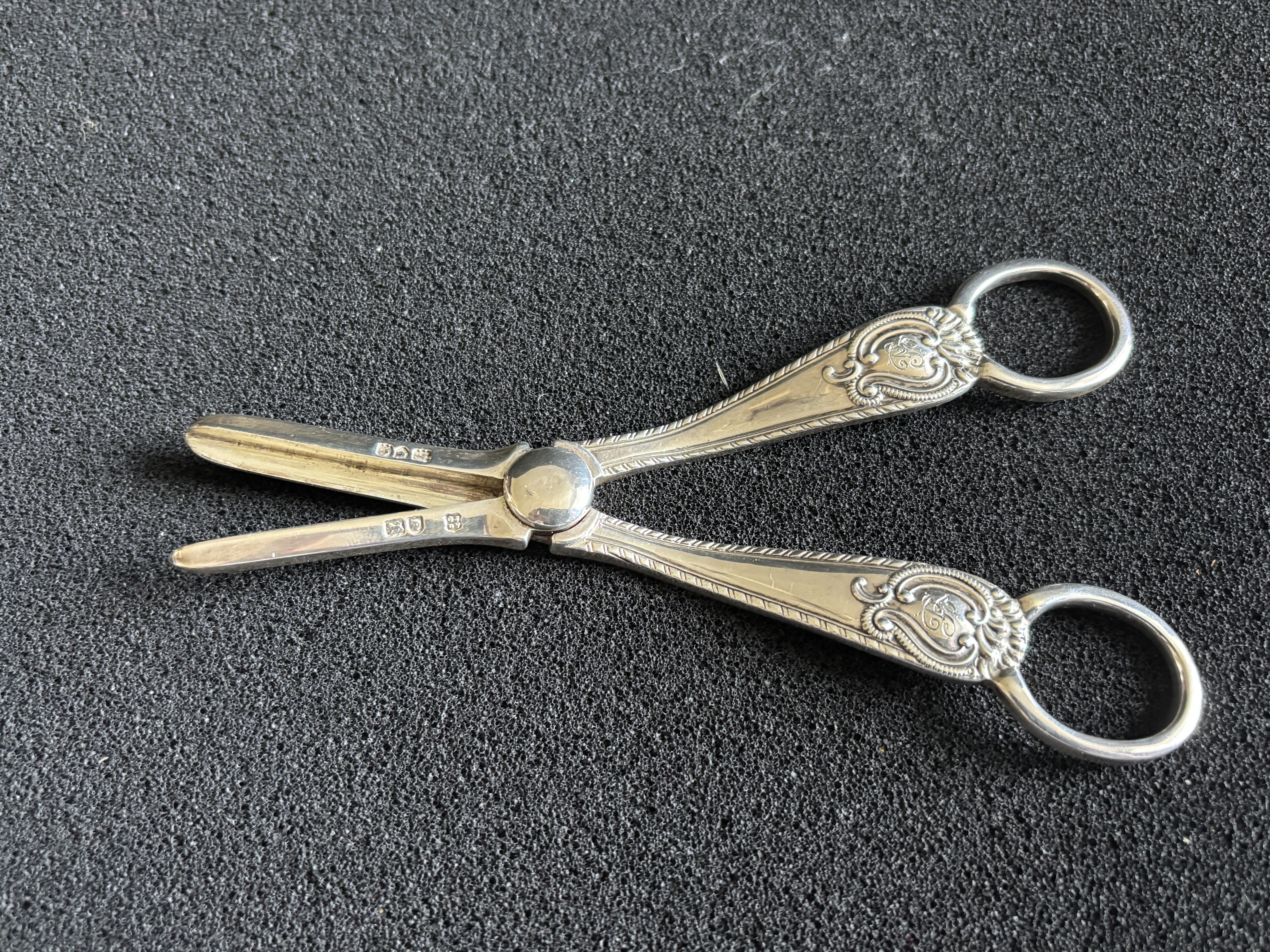 A fabulous pair of HM Silver grape scissors in original fitted box