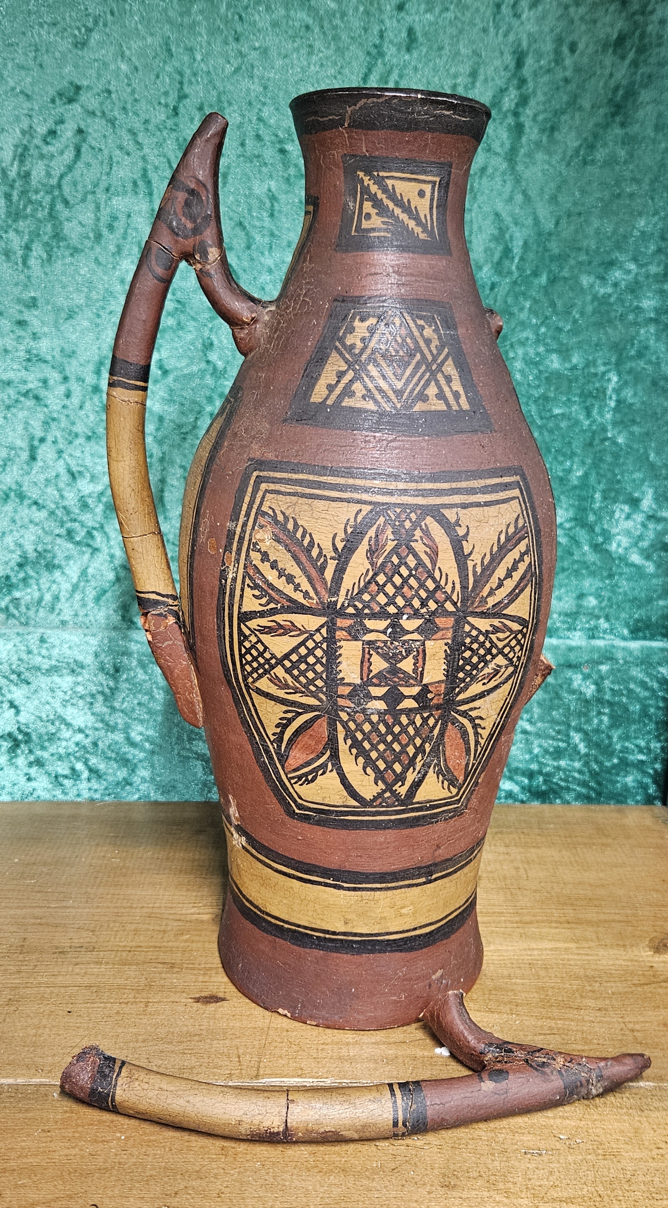 A vintage North African Berber Kabyle style earthenware 2 handled (broken) amphora vase, Height 34cm