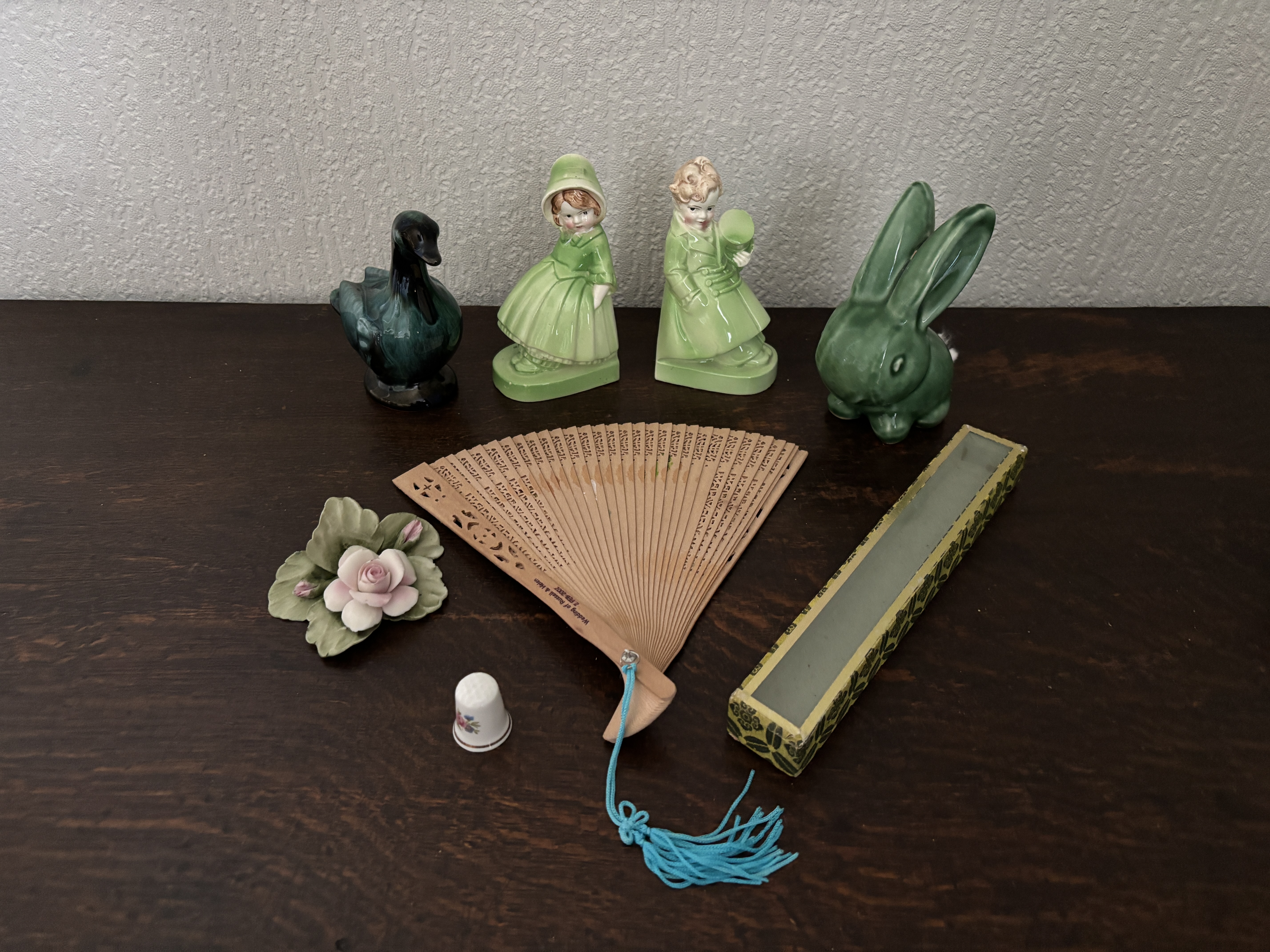 An assortment of ceramics together with a wooden fan in original box