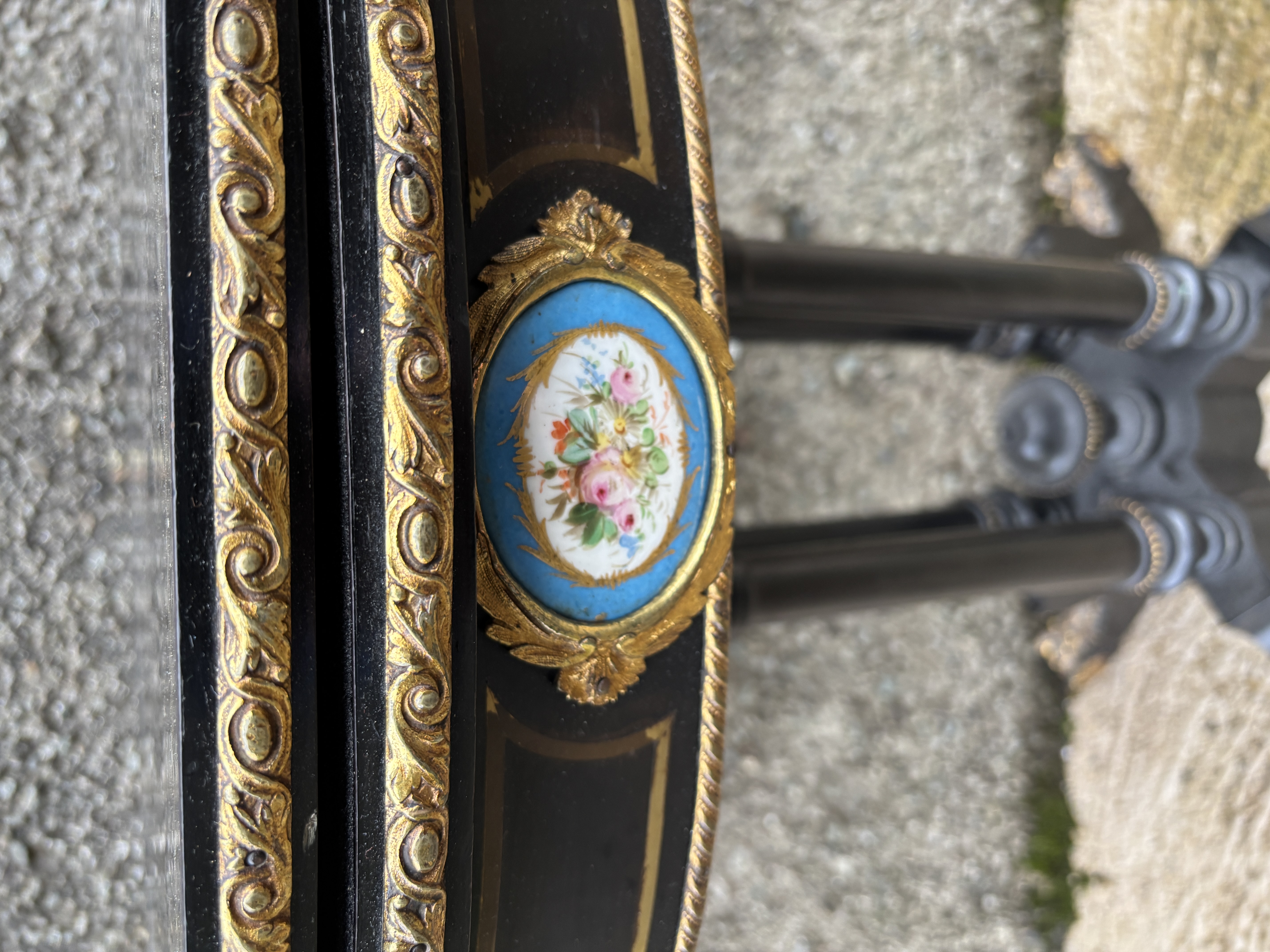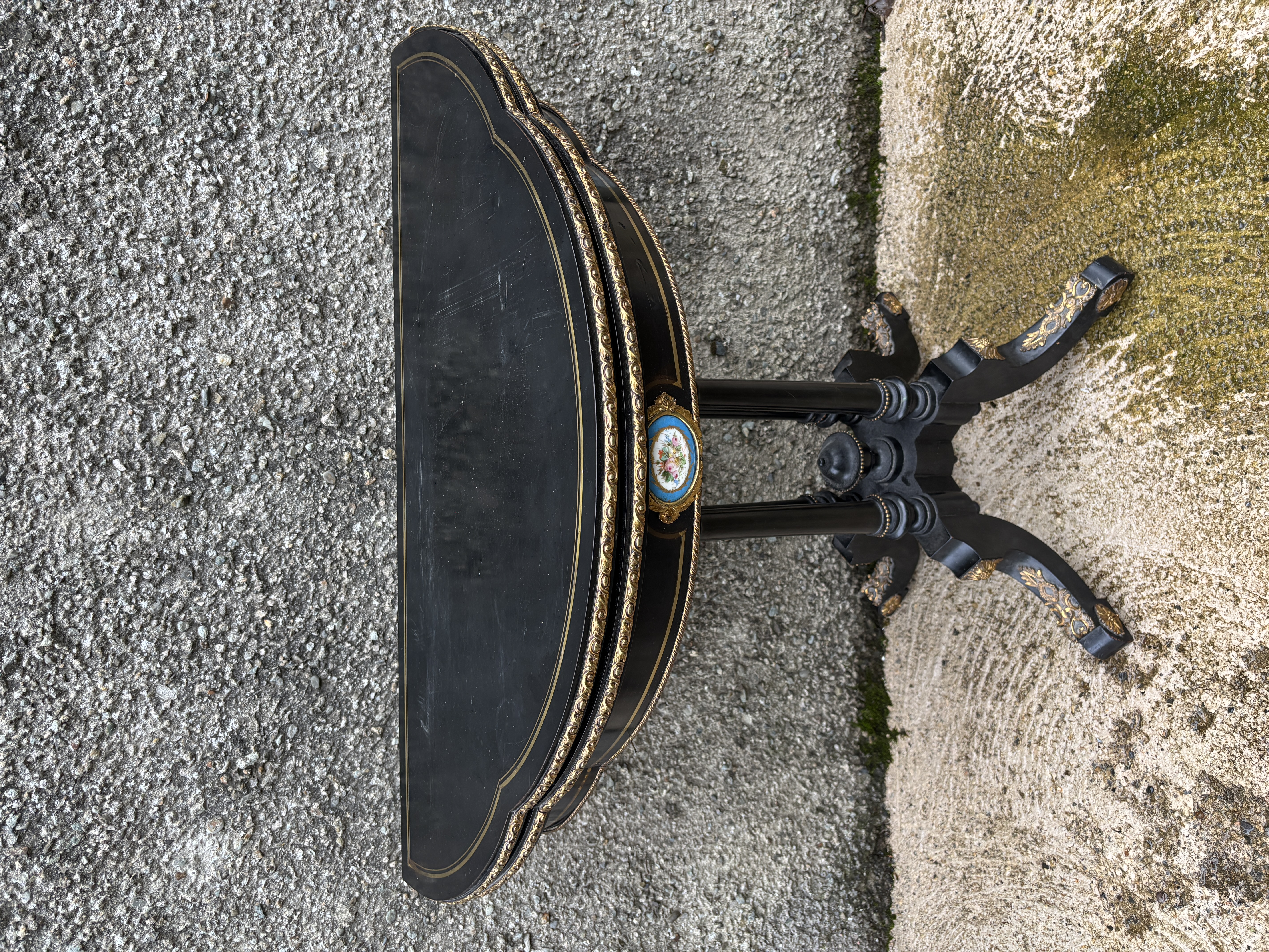 A Victorian, demi lune, fold over card table with gilding and a painted floral panel