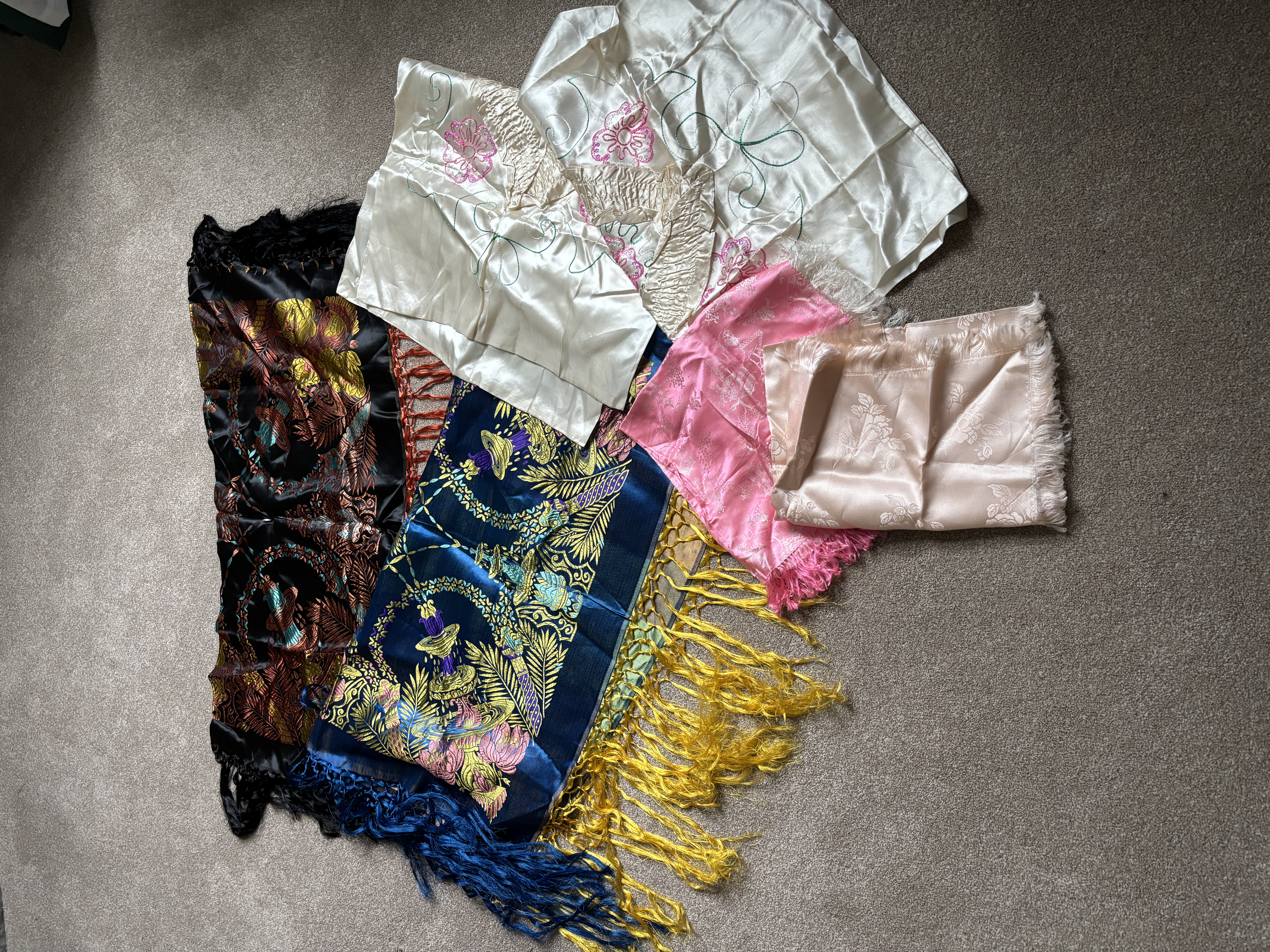 Two silk fringed cloths and two silk cream pillow cases