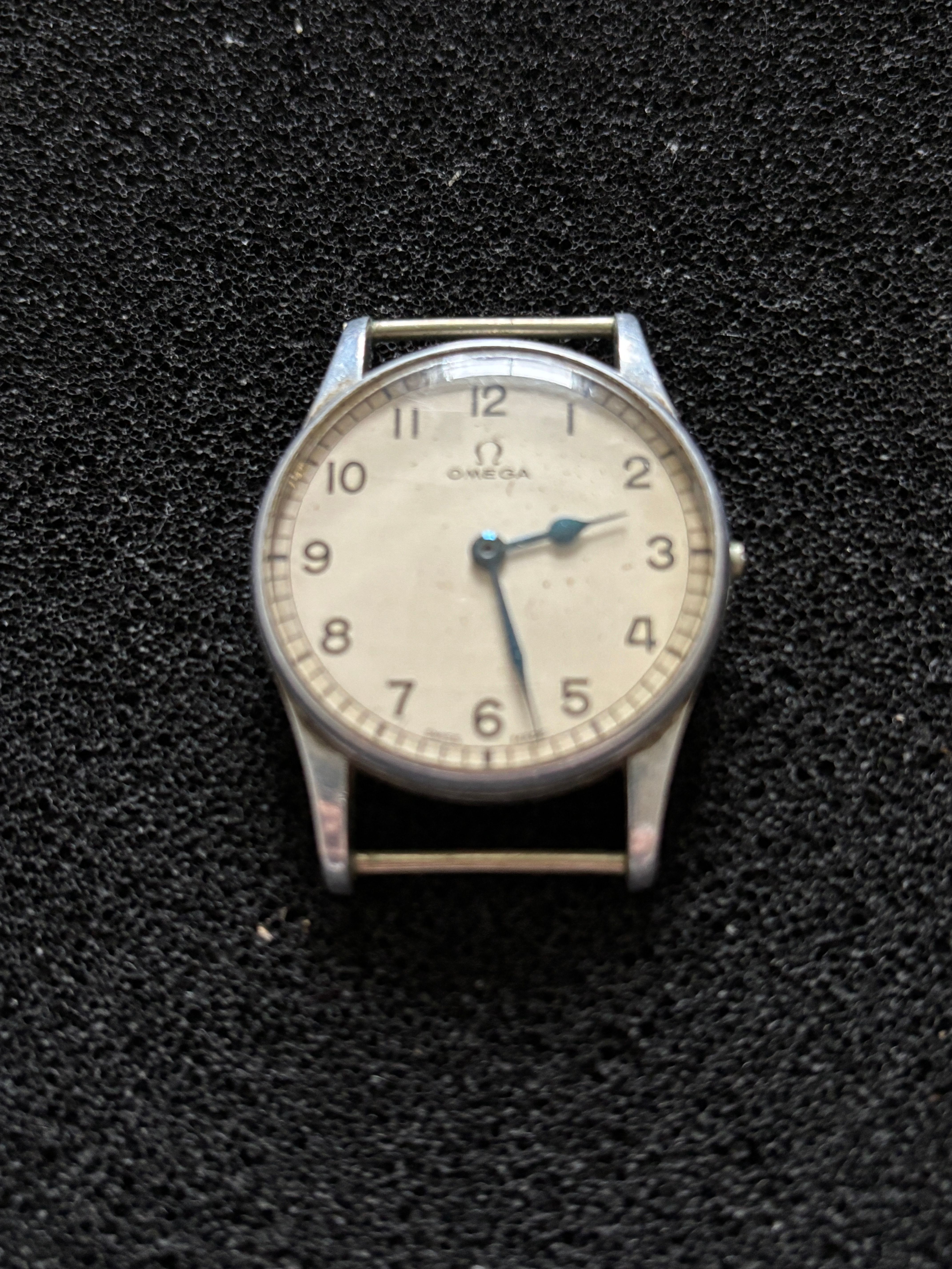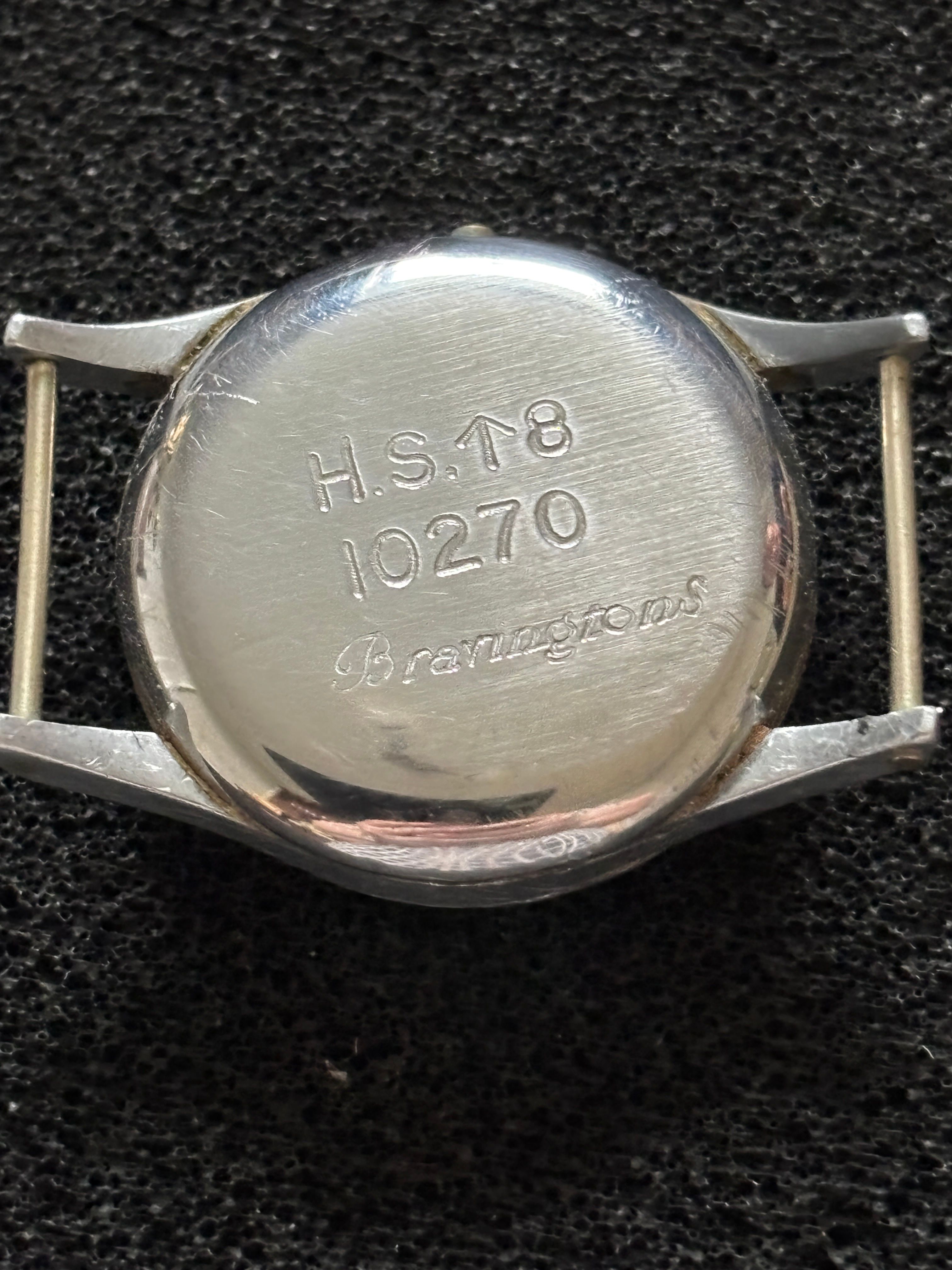 An Omega military watch with Broad arrow, HS 8 10270 and Bravington’s engraved on back. A/f diameter of face 30mm (missing winder)