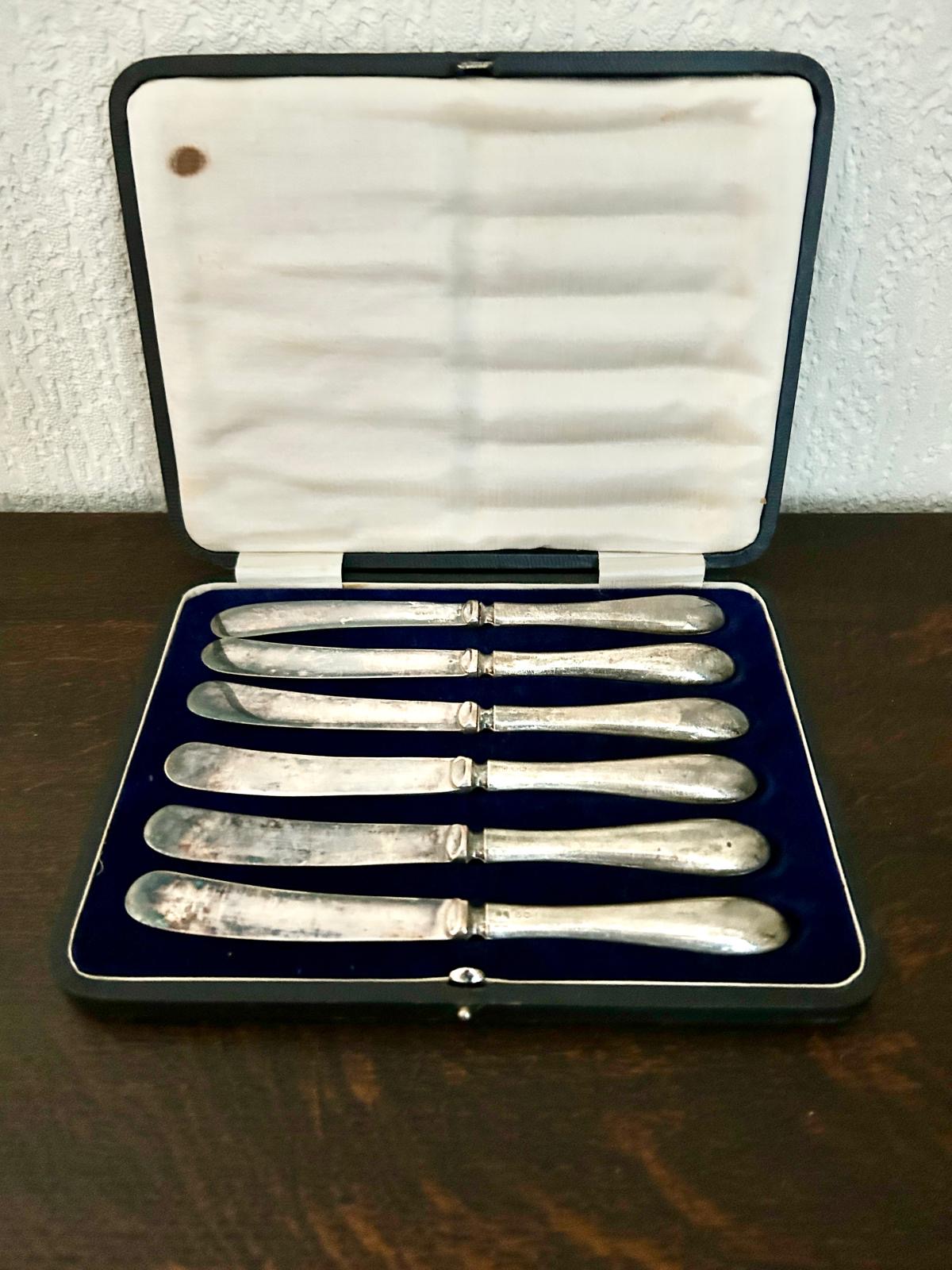 A boxed set of HM silver handled butter knives in original fitted box weighing 166 gm overall