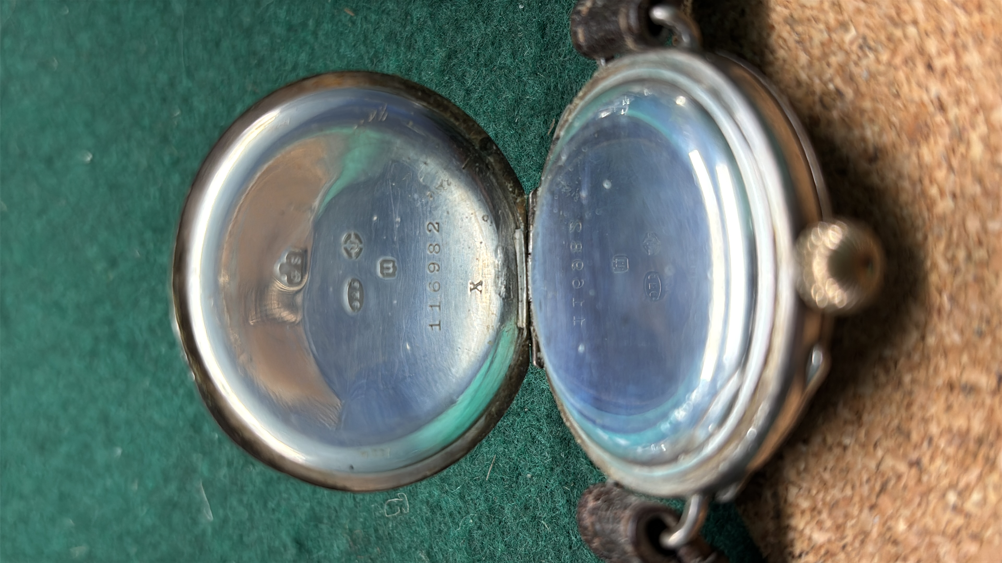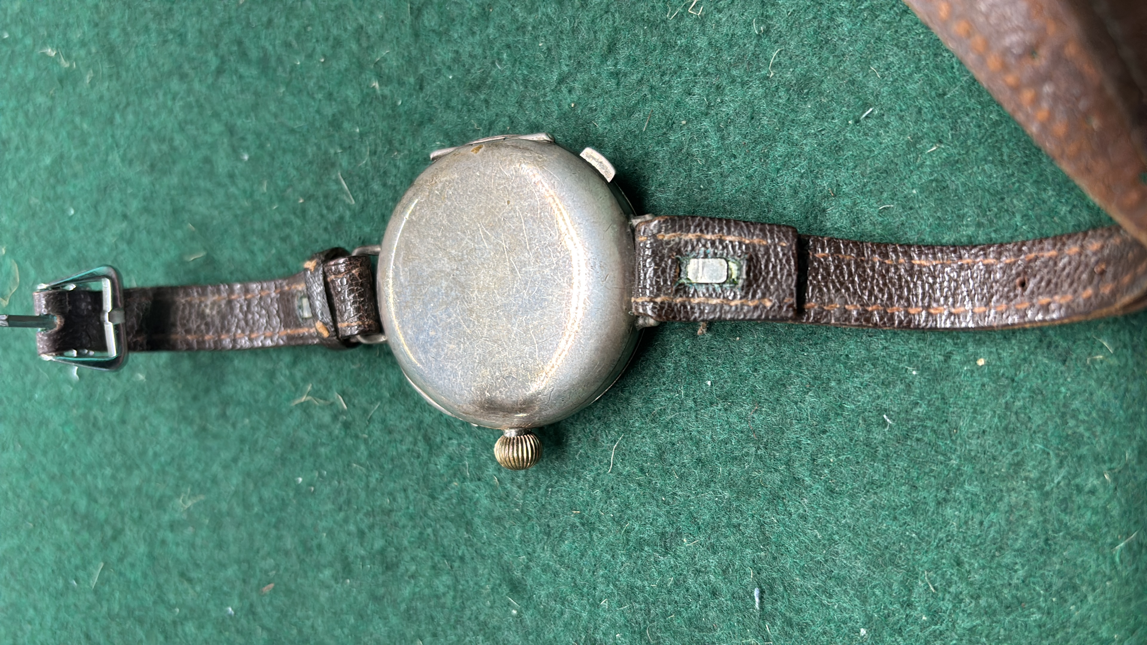An antique half hunter trench style silver watch with black face with brown leather strap a/f (missing glass)
