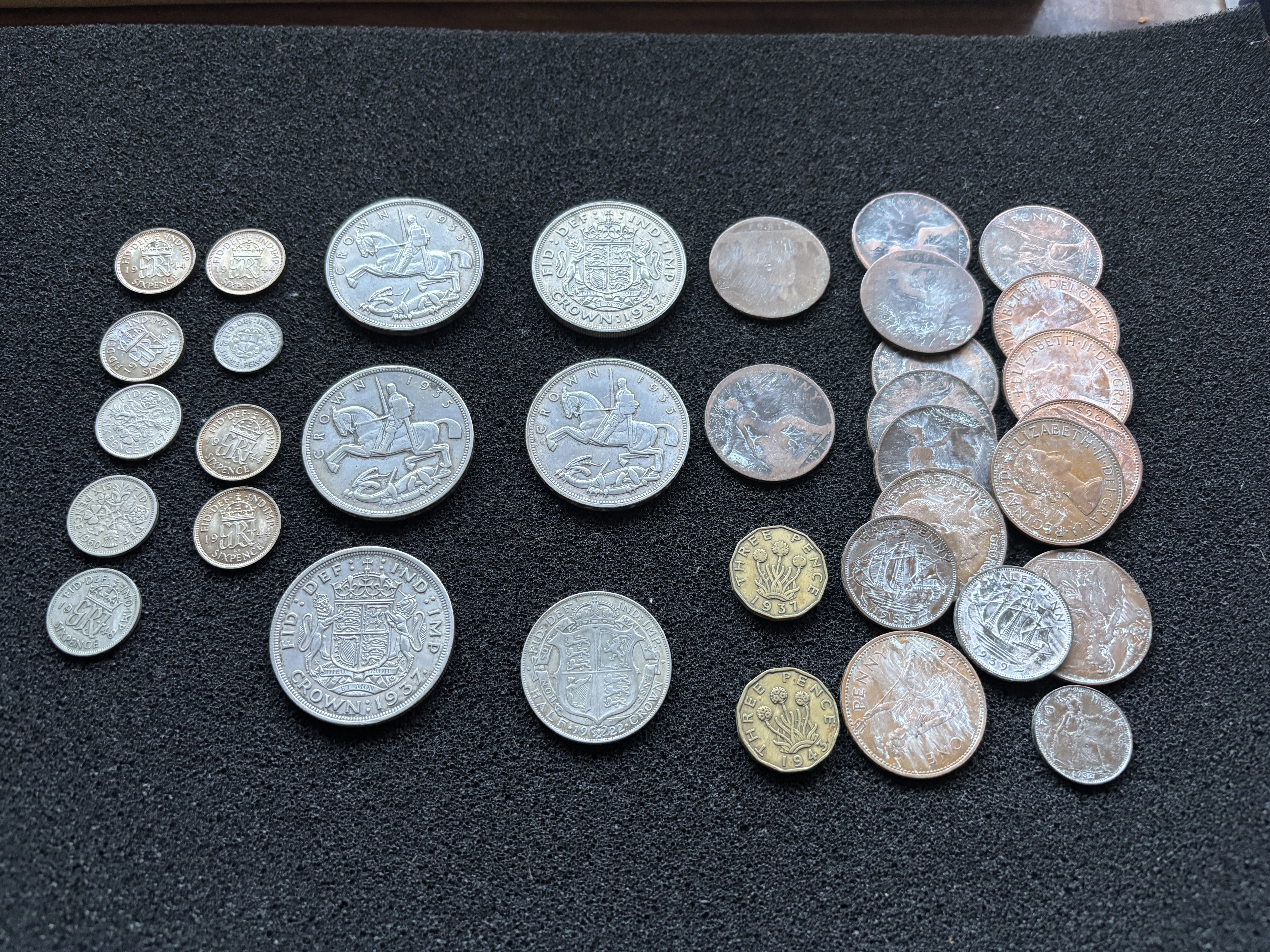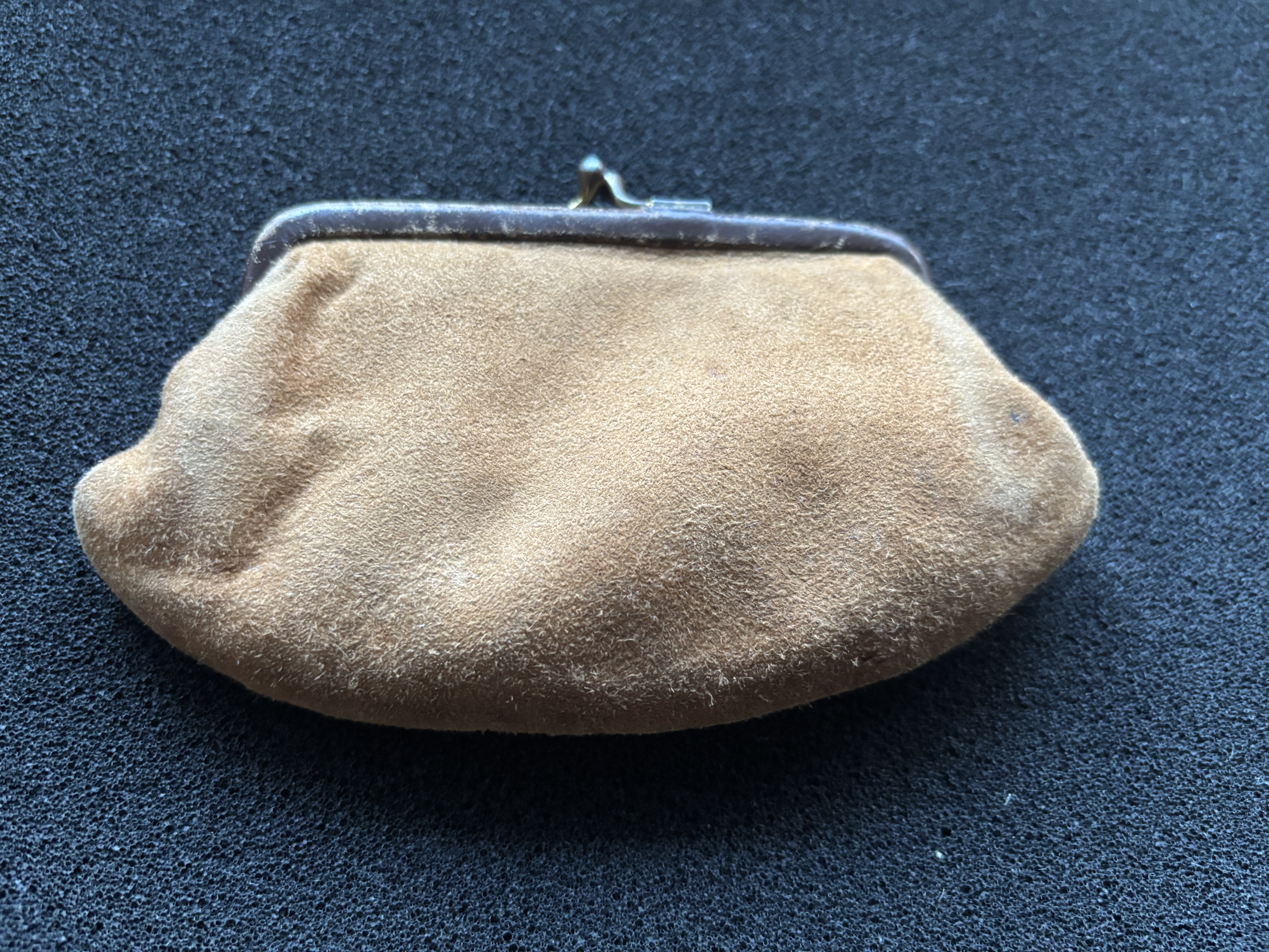 A purse containing assorted coins to include five silver crowns (1935/7), a half crown and some pennies.