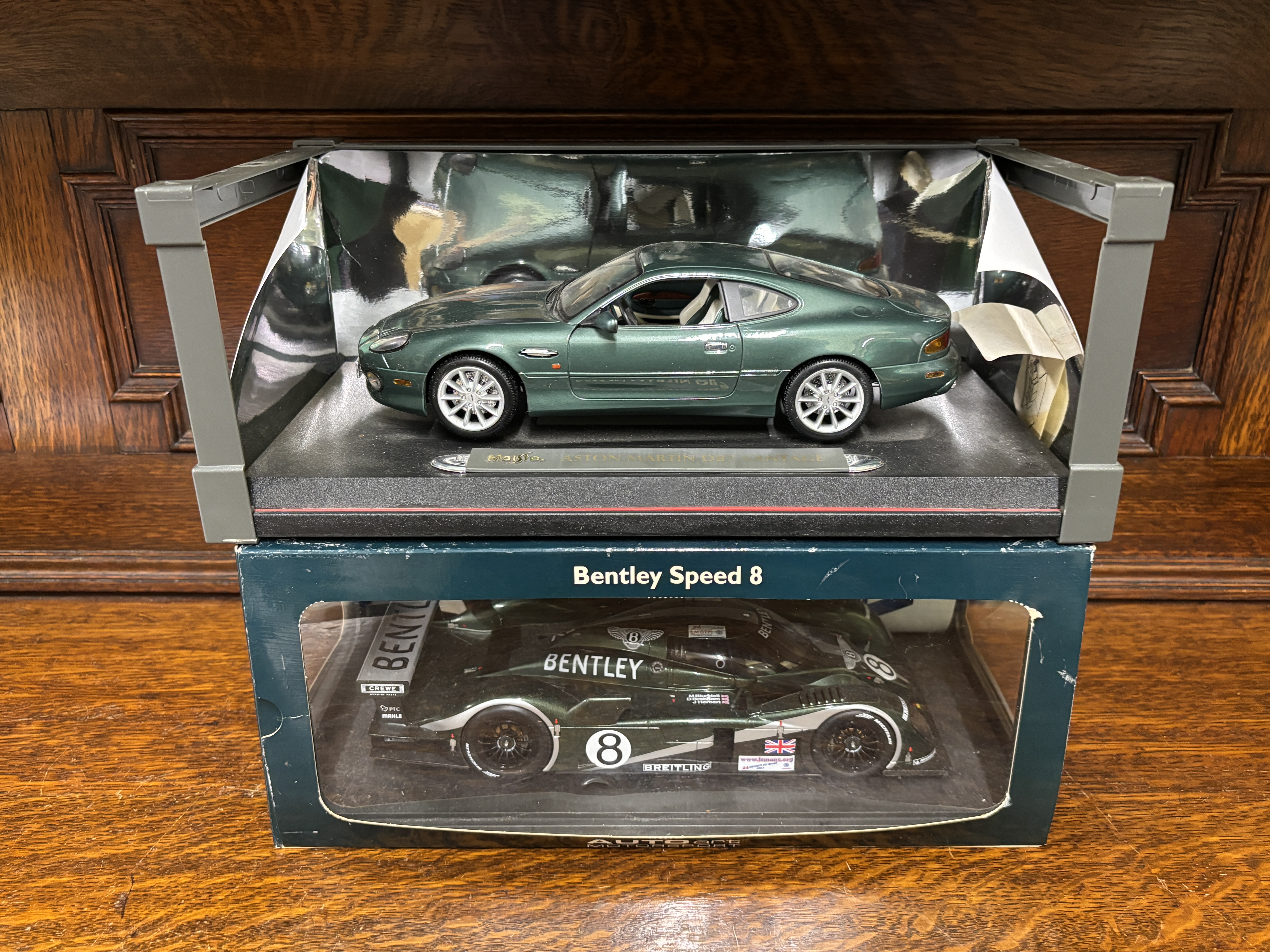 Two 1:18 scale cars of an Aston Martin DB7 and a Bentley Speed 8