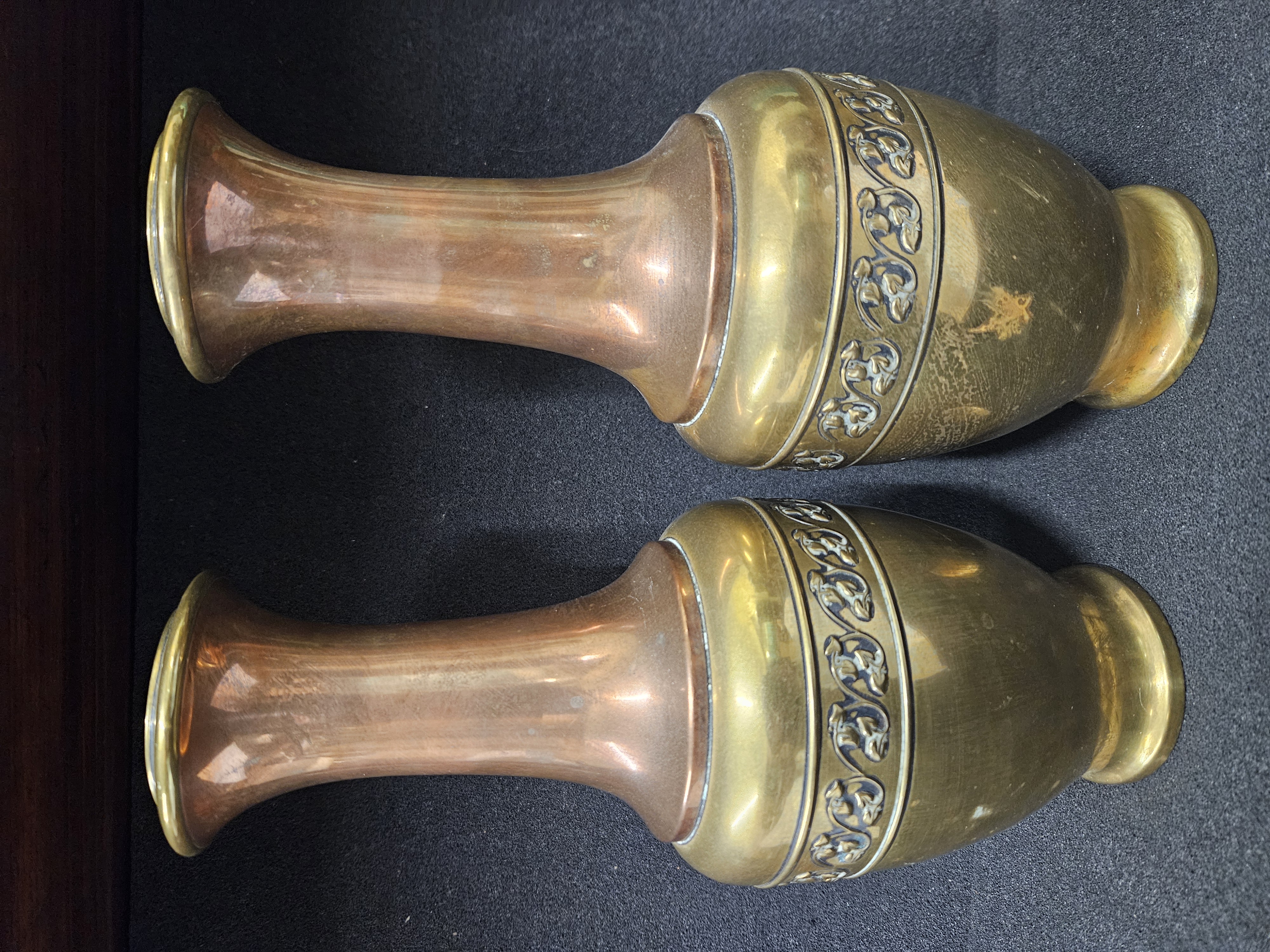 A pair of early 20th century brass and copper bulbous vases, having embossed foliate band, Height 29cm