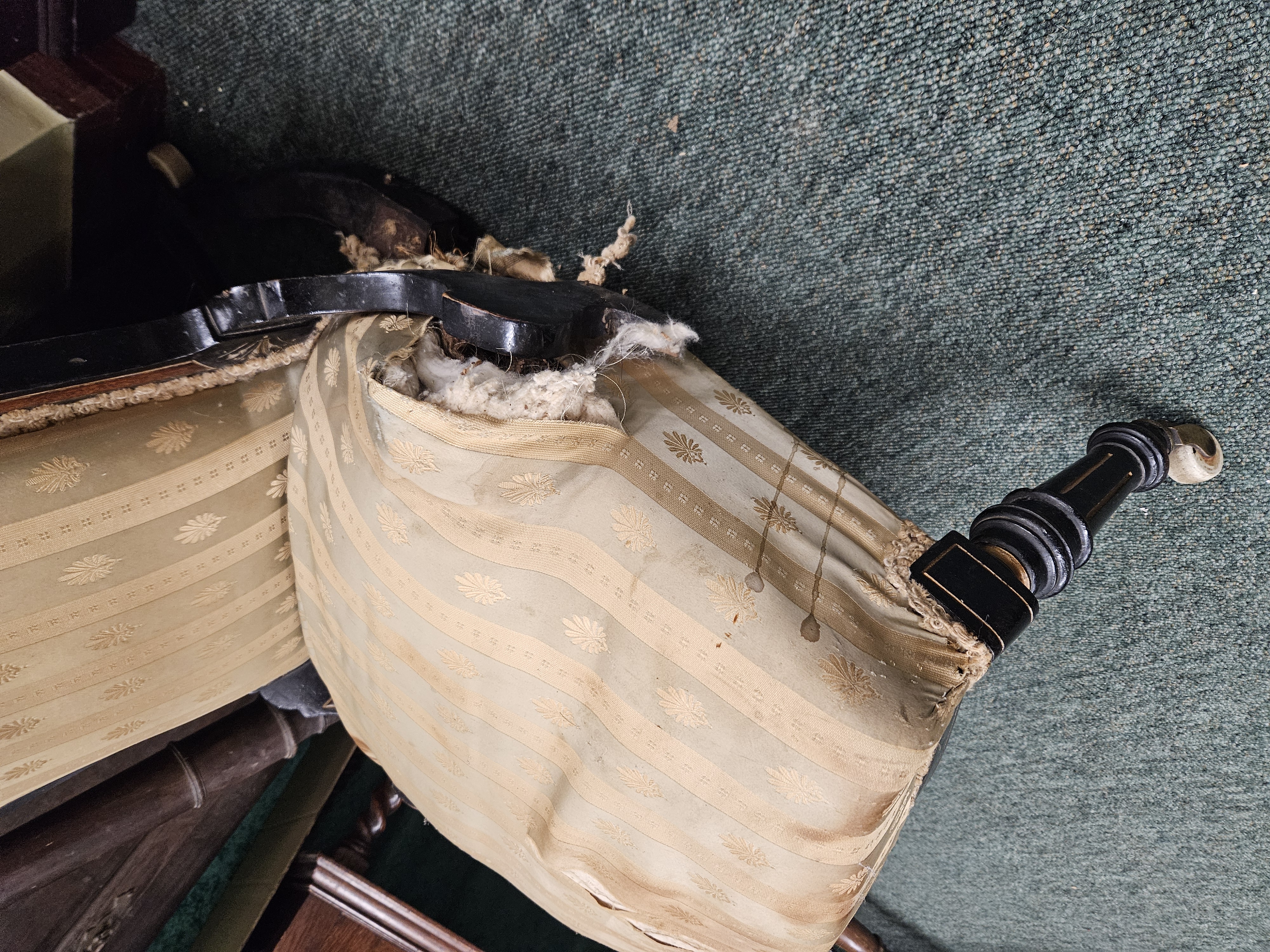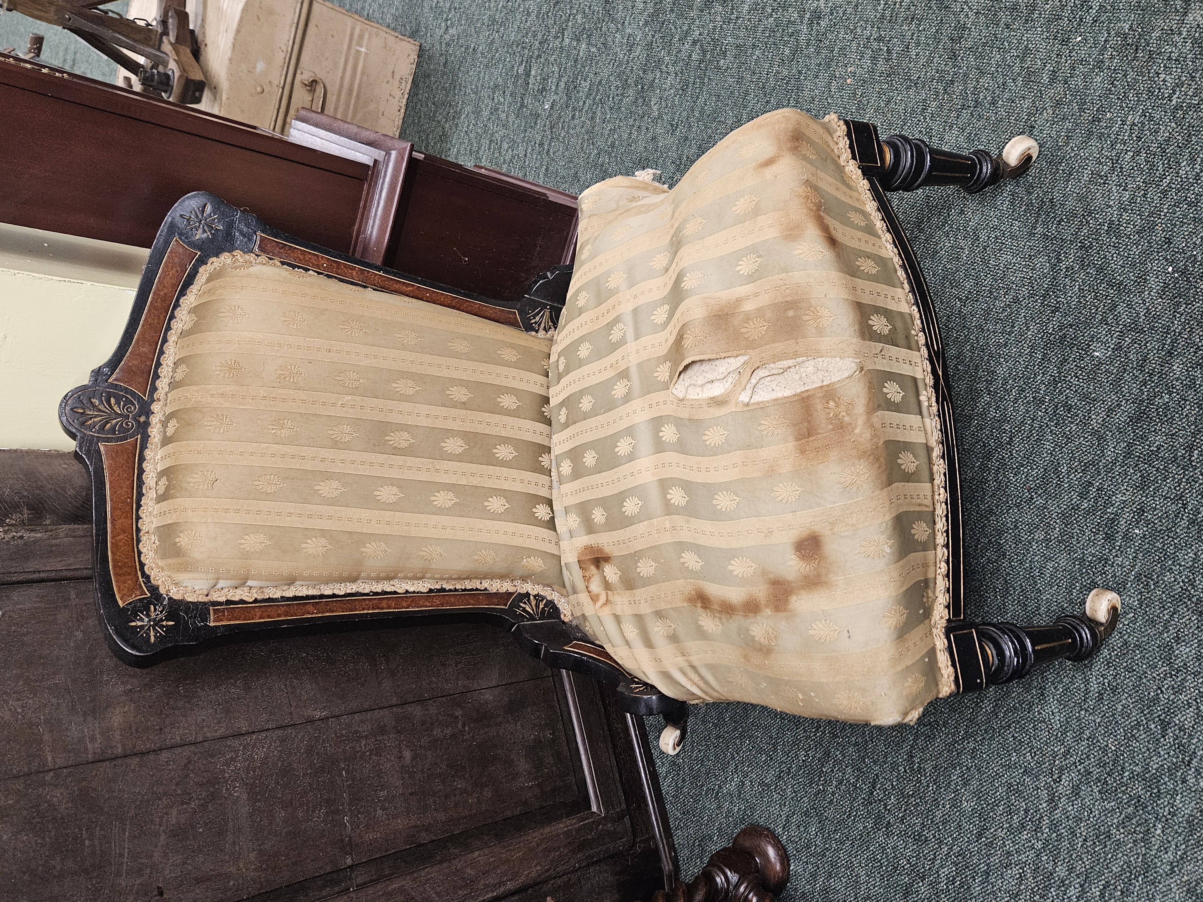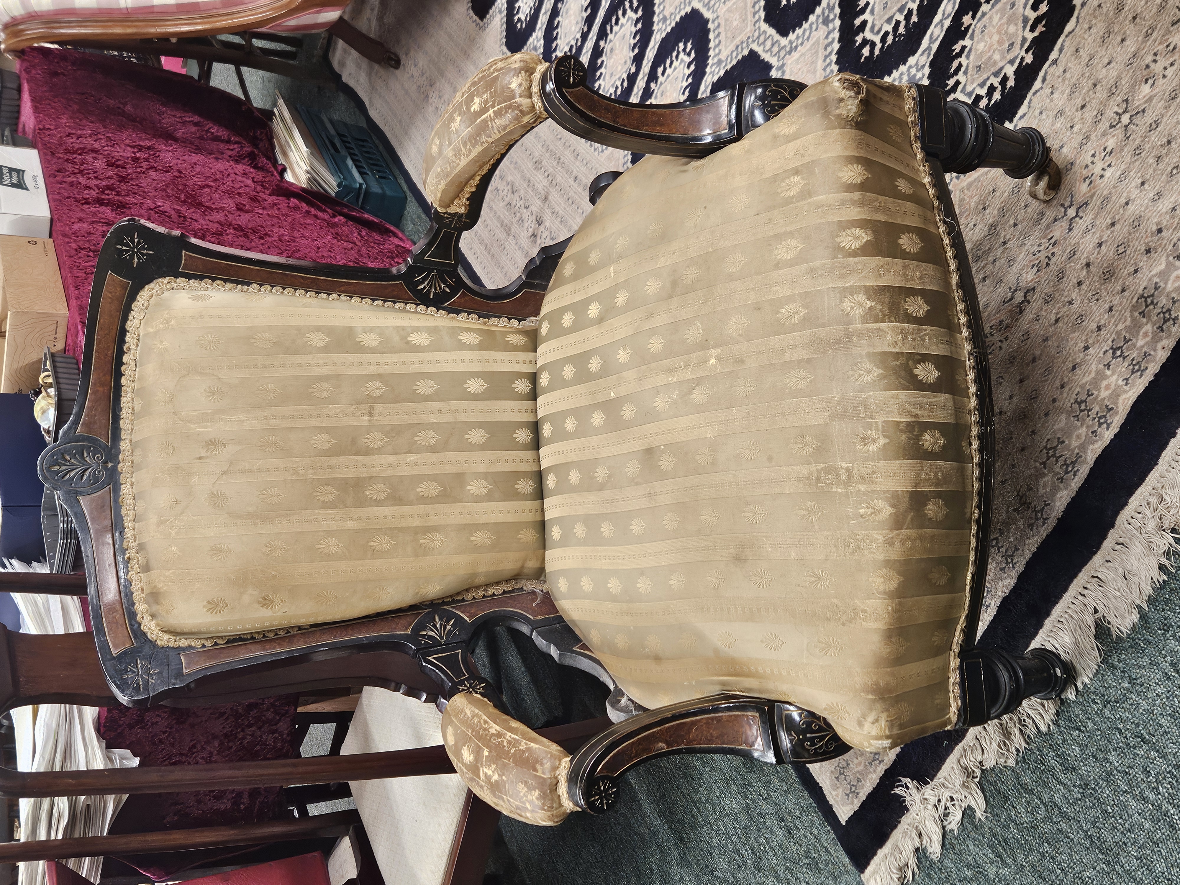 Two Victorian ebonized frame salon chairs, with amboyna...