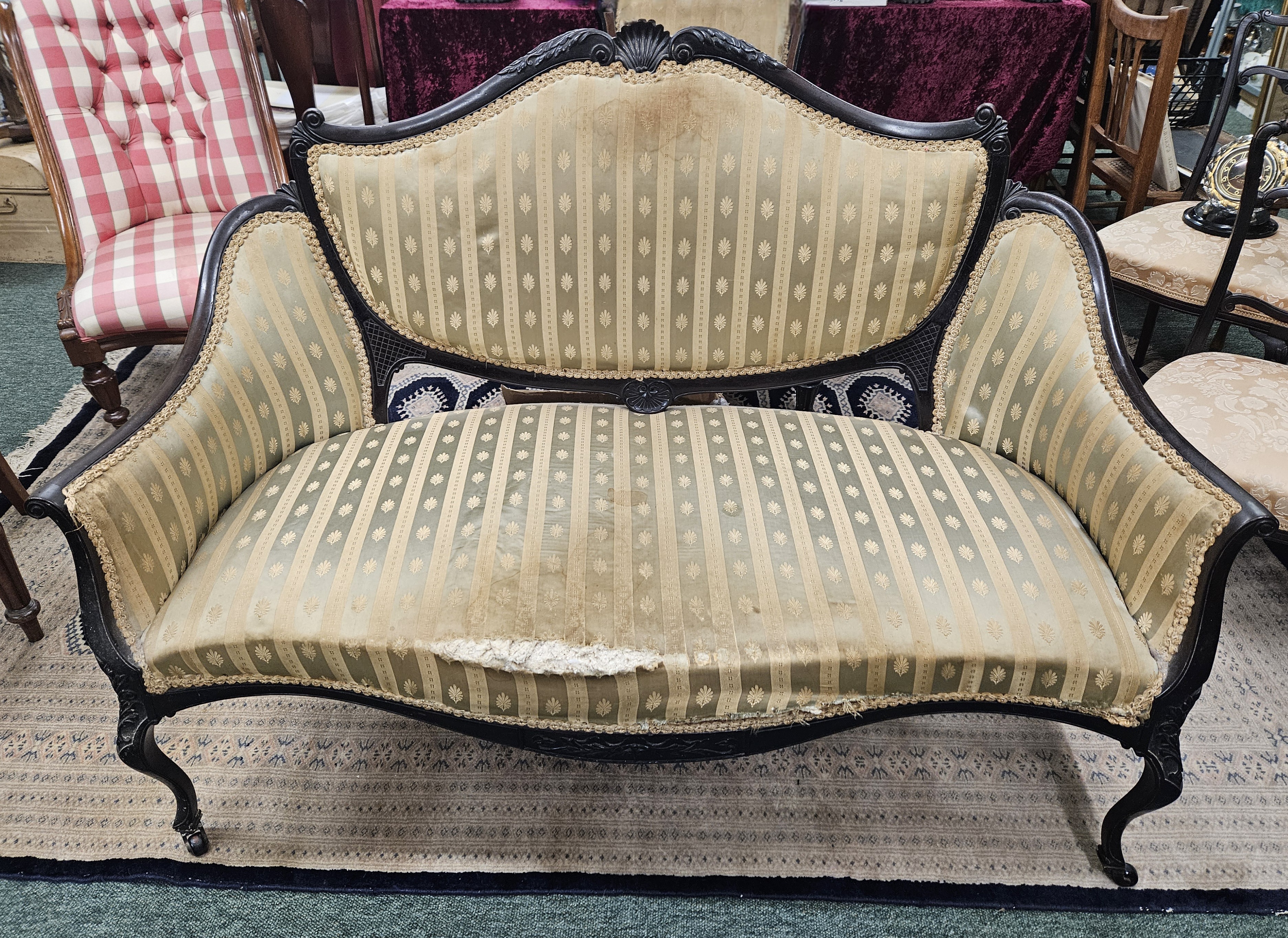 A late Victorian mahogany frame salon settee, having shell crest and swept frame, on cabriole legs with later Regency stripe upholstery, width 144cm