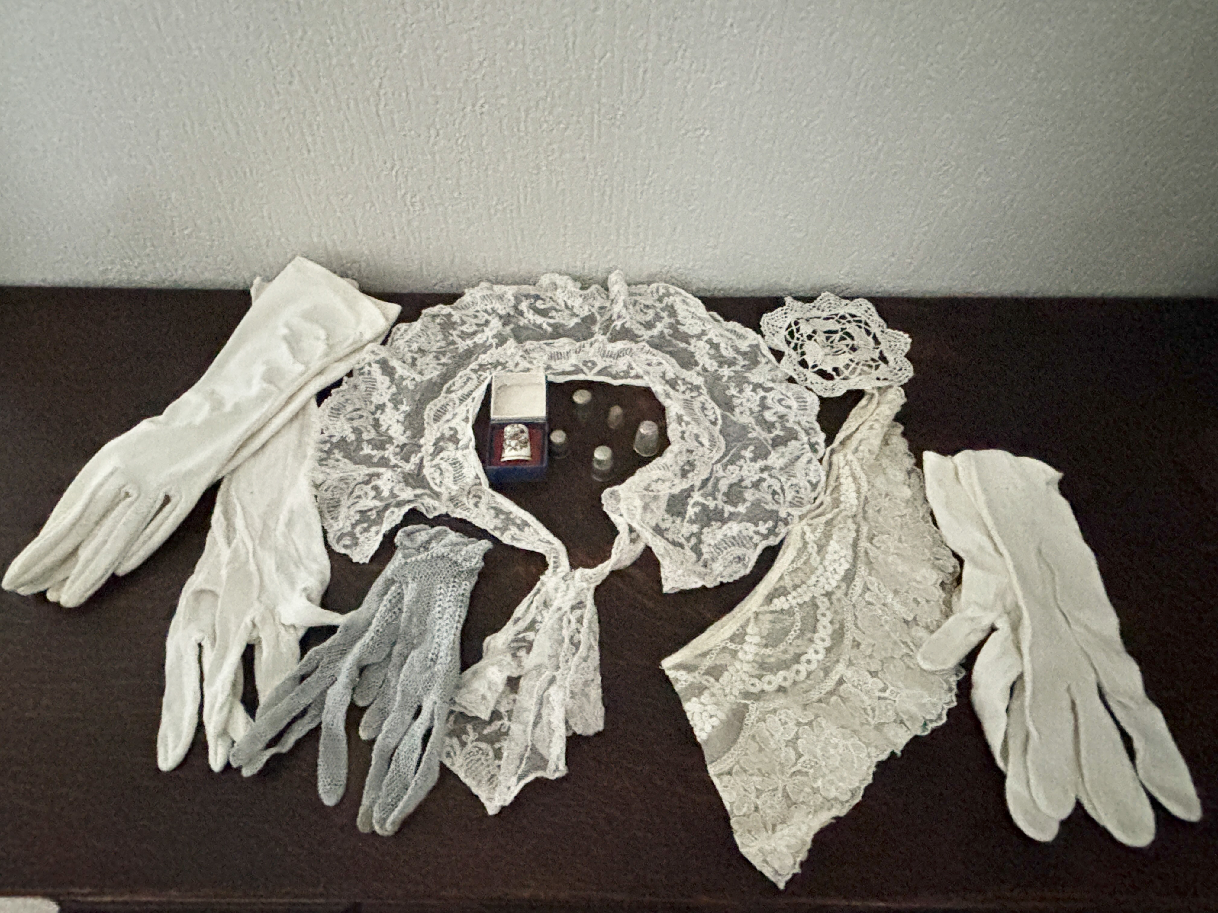 A quantity of lace to include two collars, four pairs of gloves, a boxed ceramic thimble and five white metal thimbles