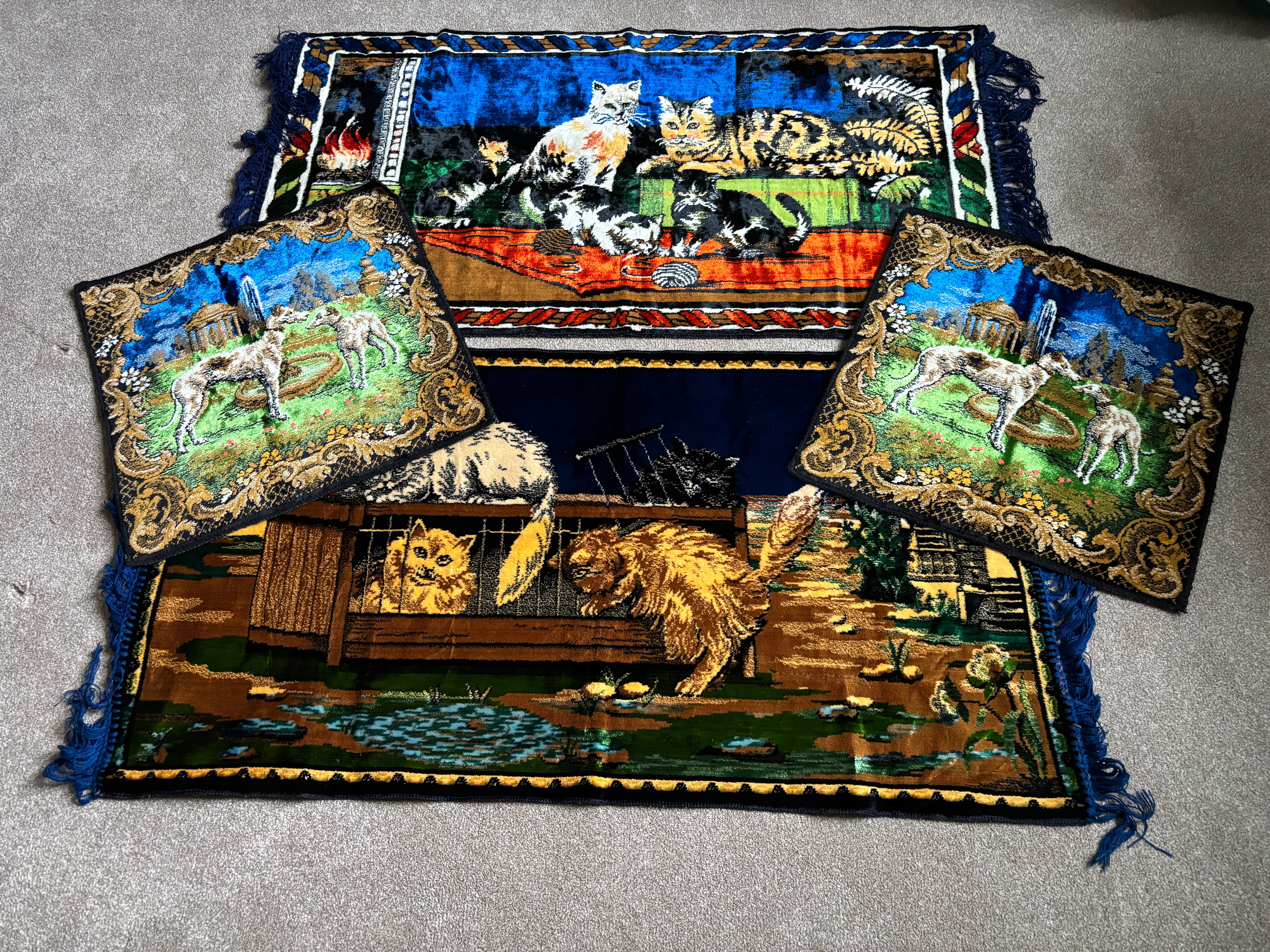Two silk woven rugs together with two woven...