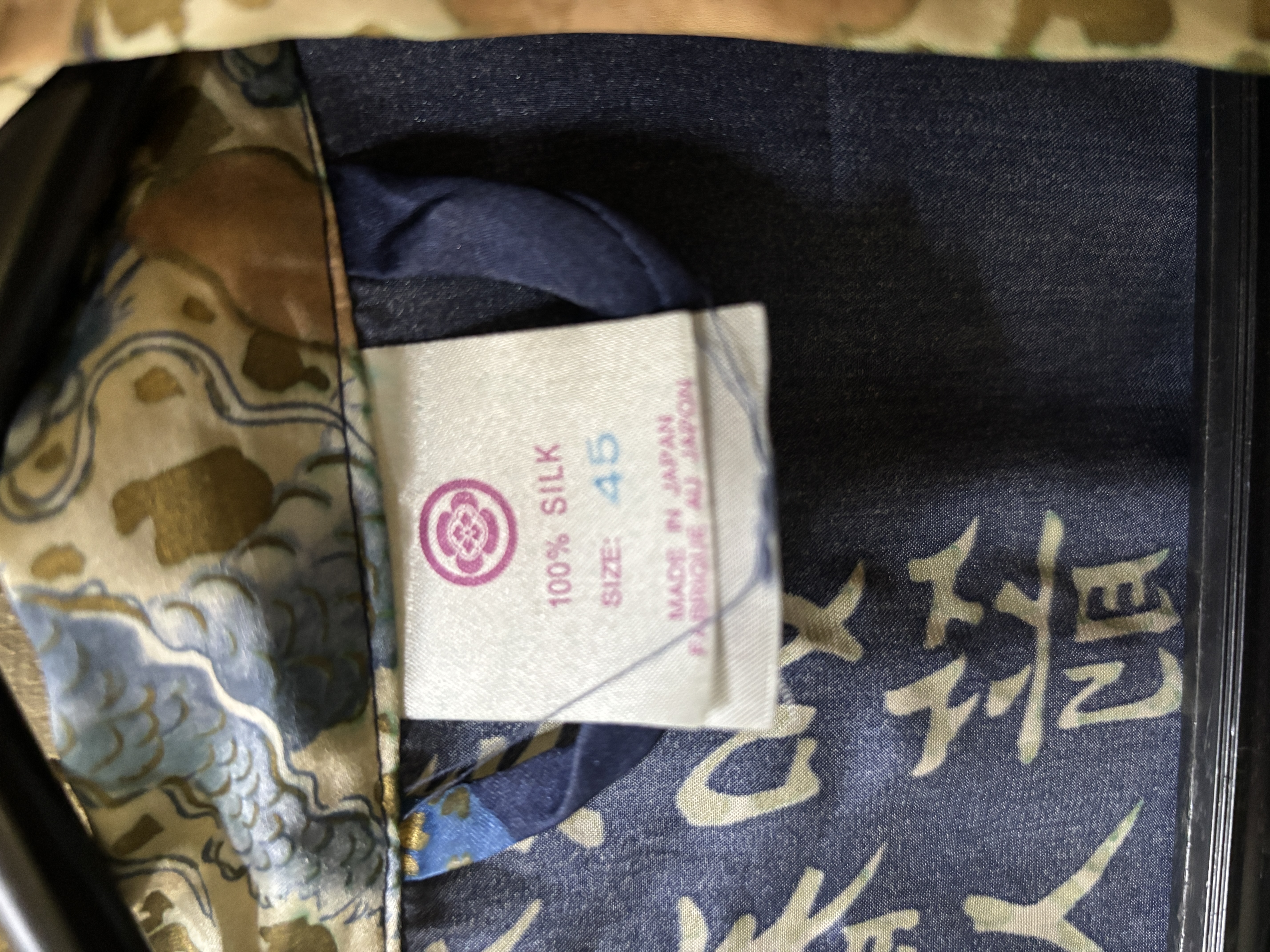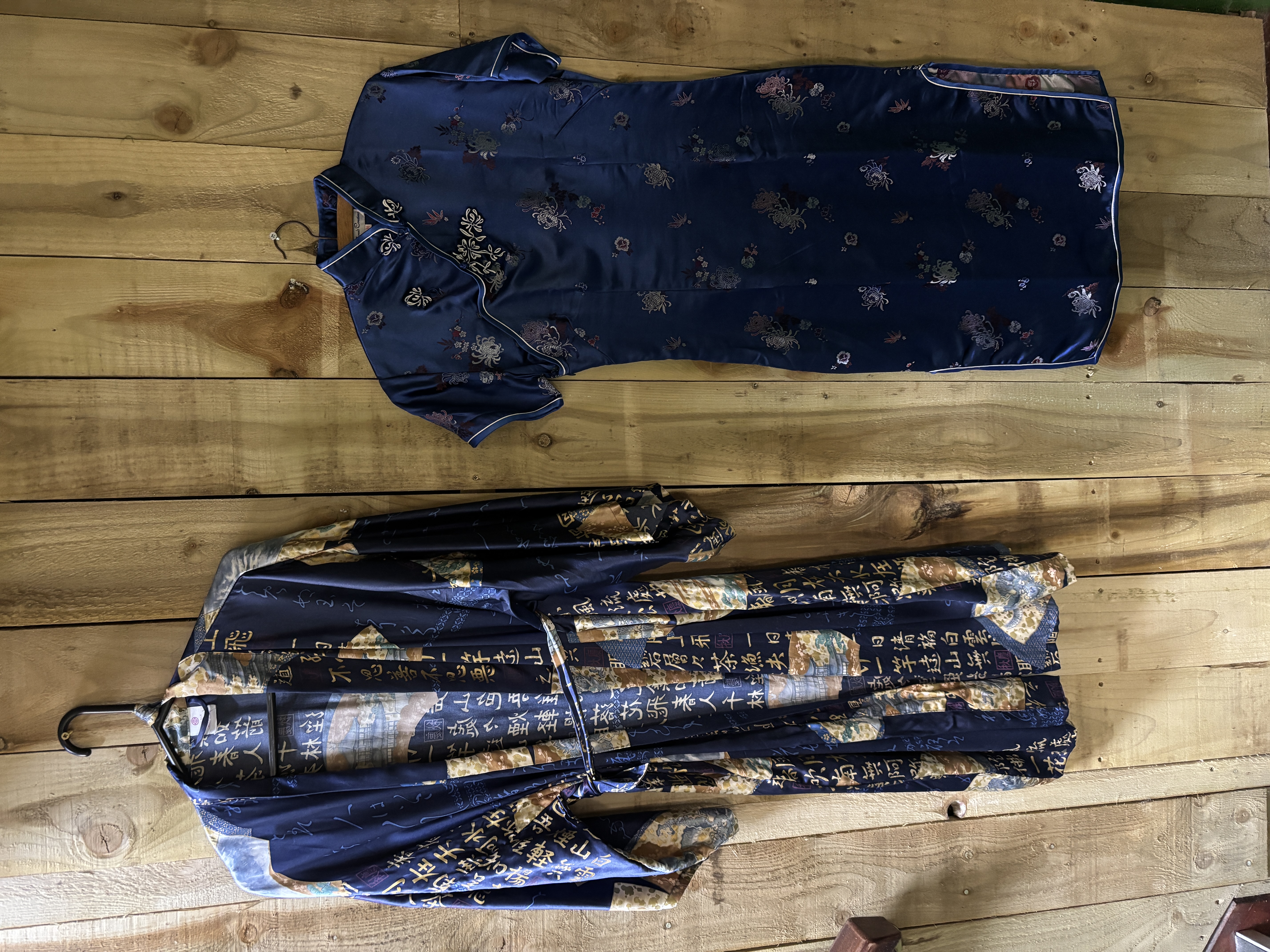 A Japanese silk dressing gown together with a blue traditional Chinese silk Cheongsam or Qipao.
