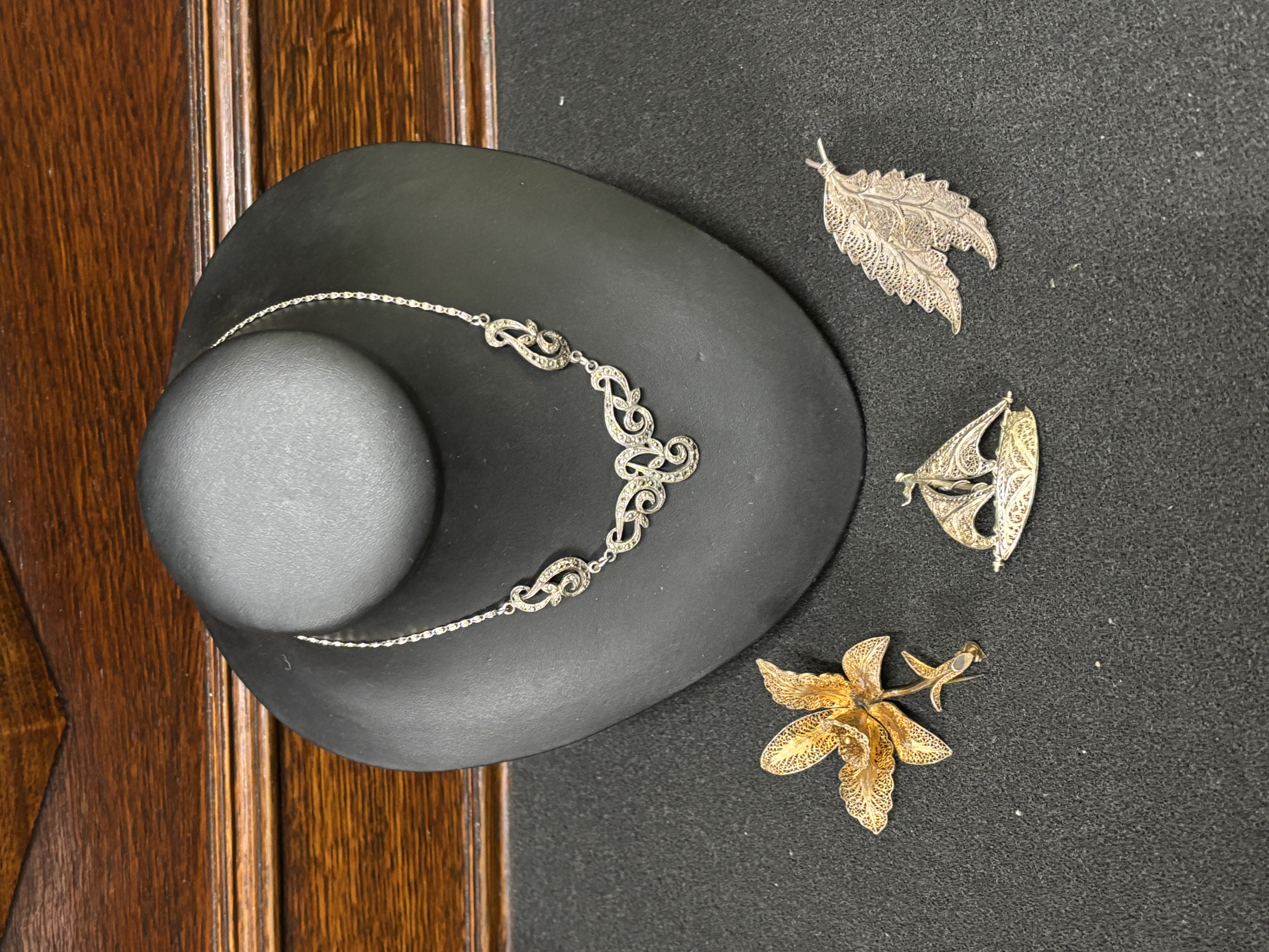 A marcasite necklace together with three filigree brooches