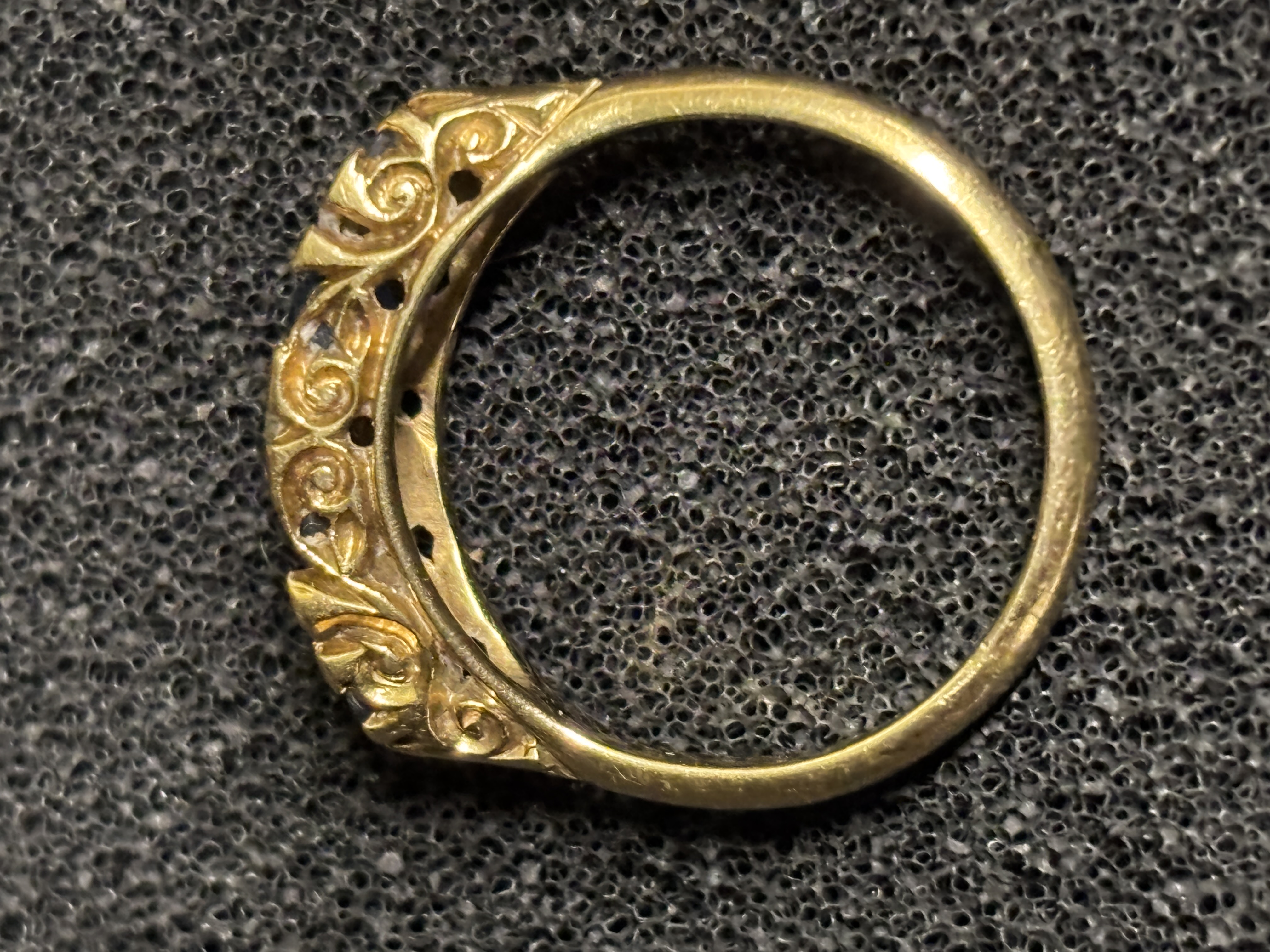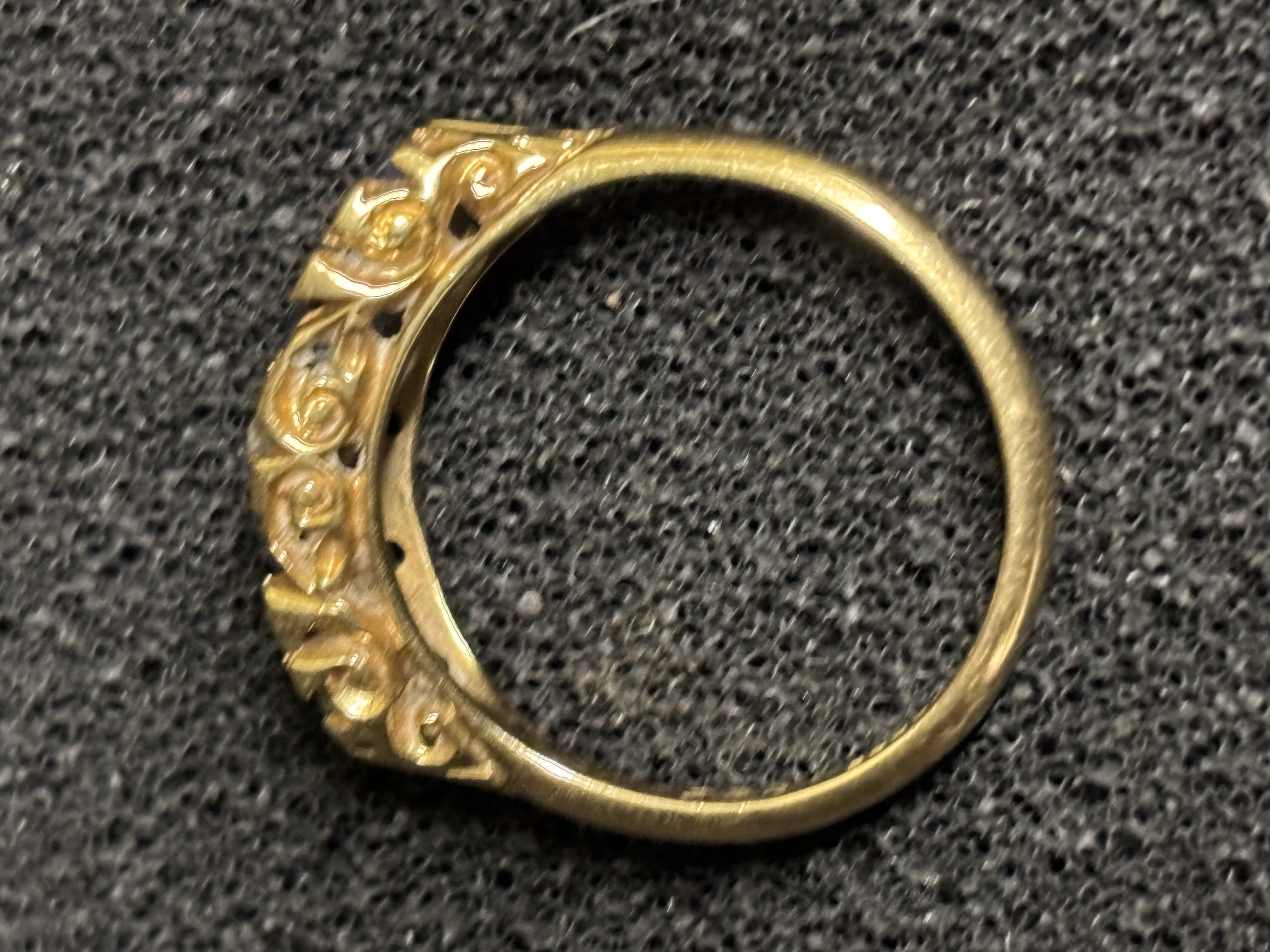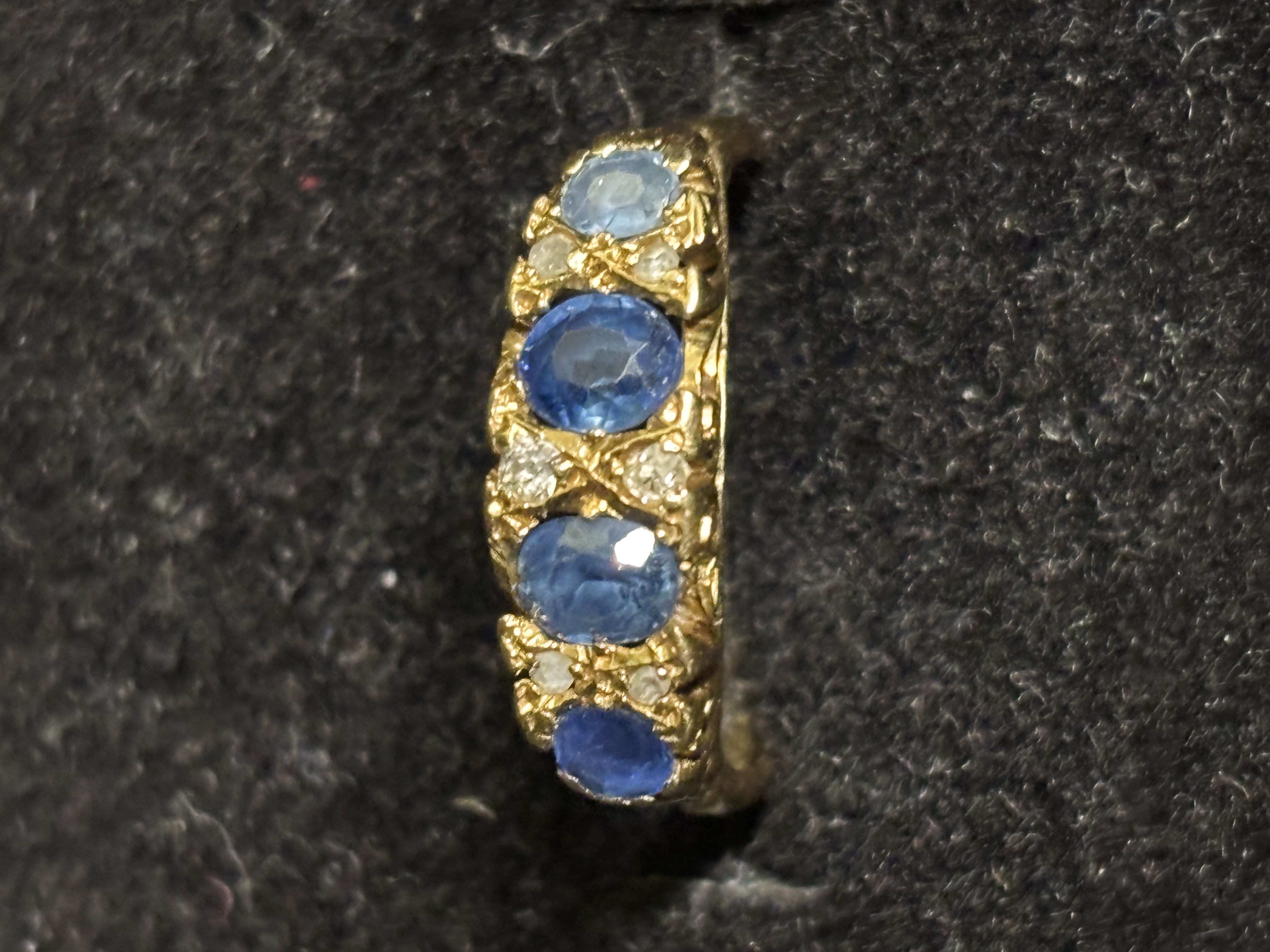 An 18 ct gold gem set ring set (one stone is a slightly different colour). Size M 1/2 and weighing 3.33 gm