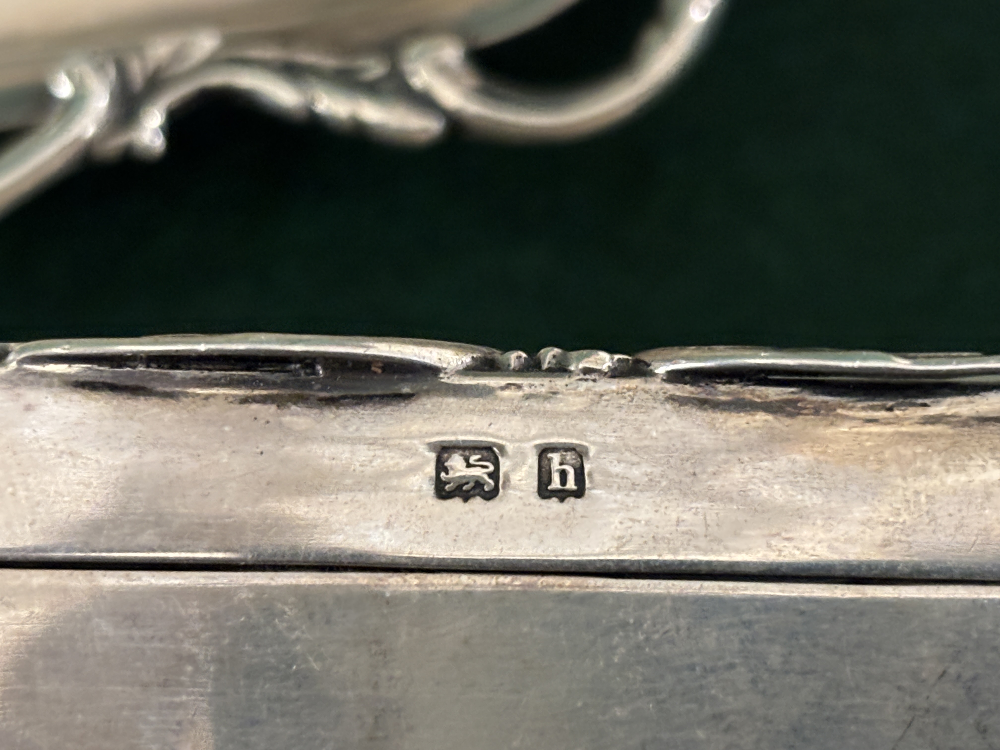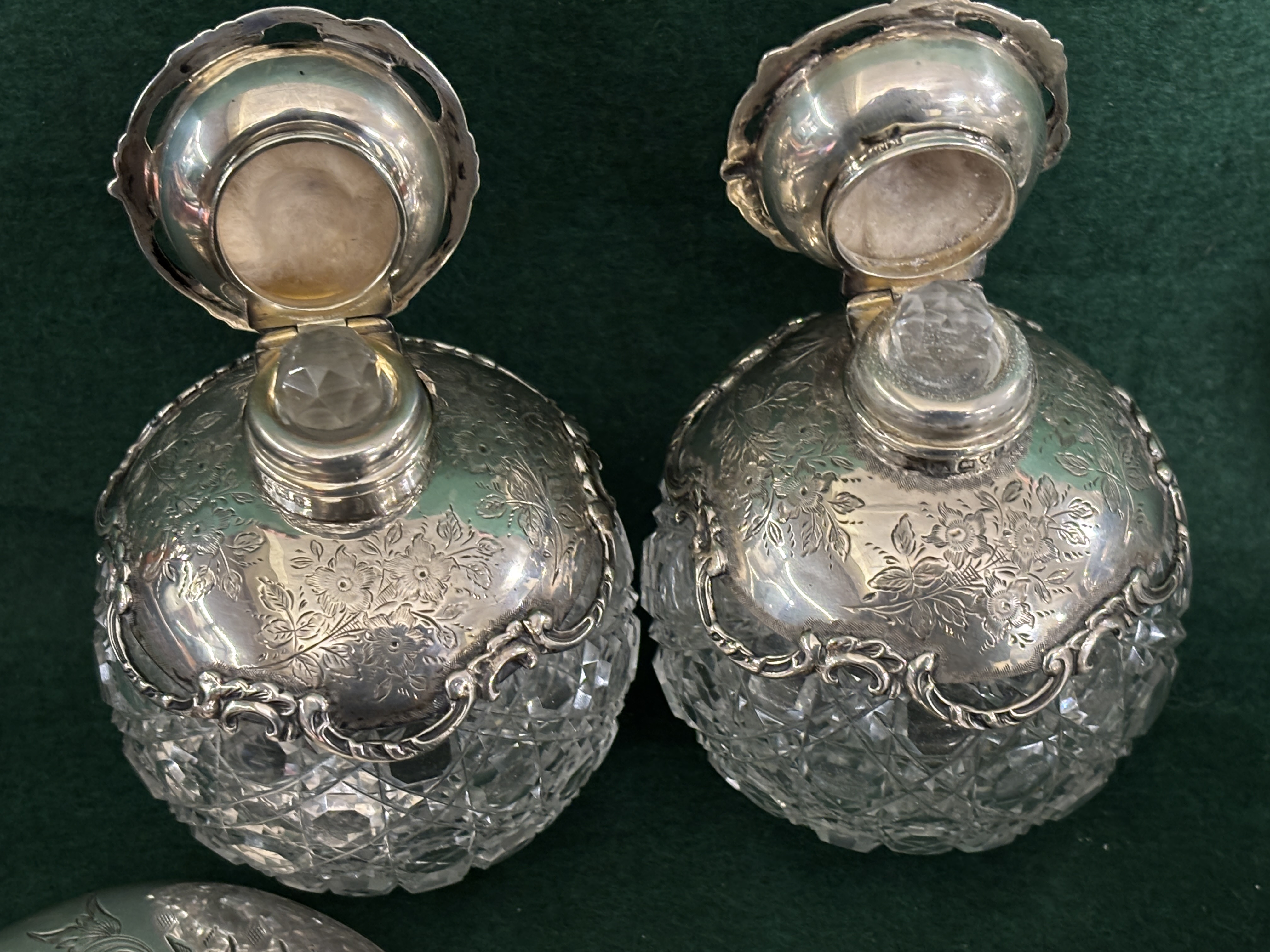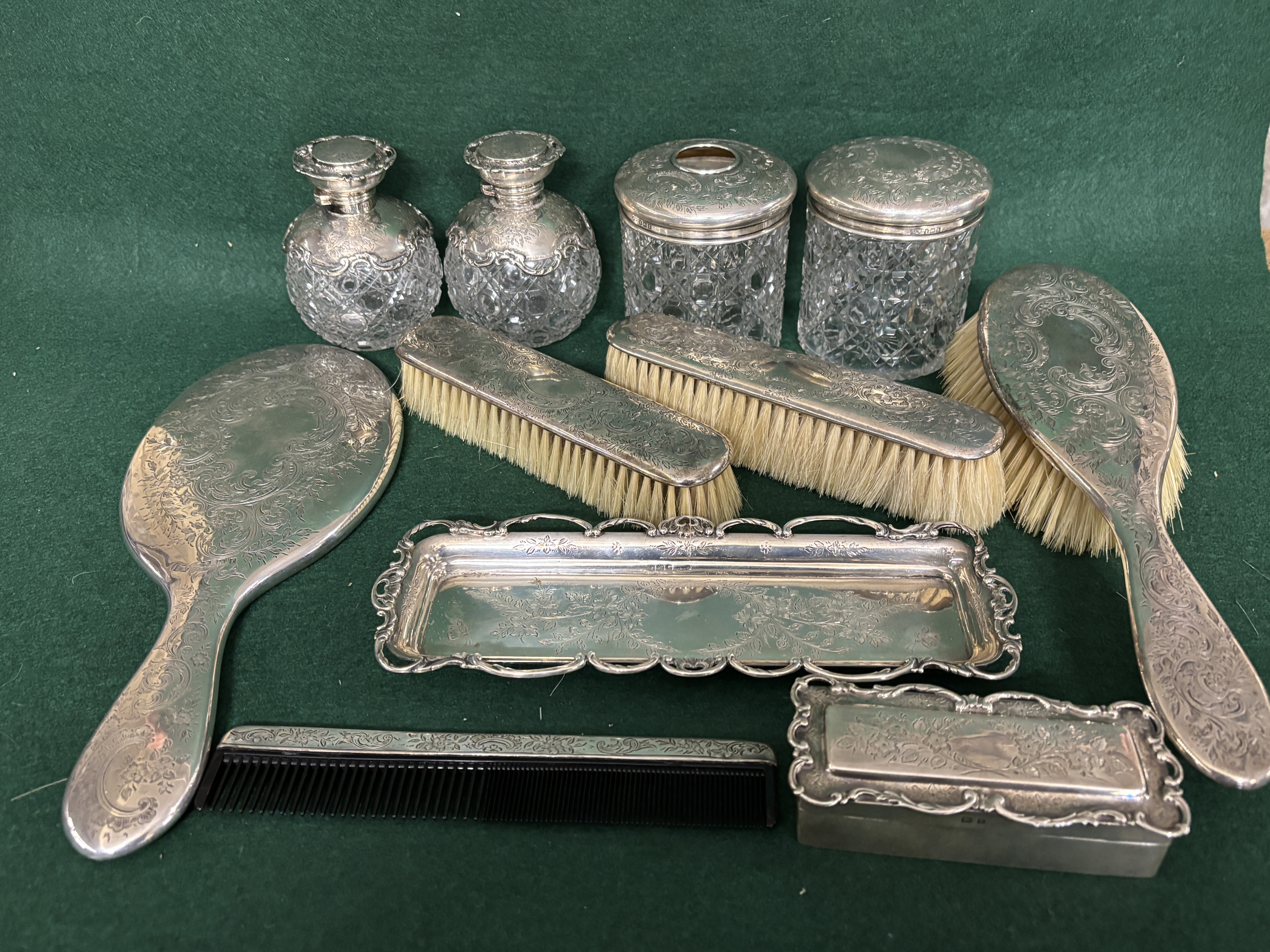 An eleven piece HM silver dressing table set comprising two scent bottles, two lidded jars, hand mirror, brush, comb, pin tray, silver box and two clothes brushes. This set has not been monogrammed