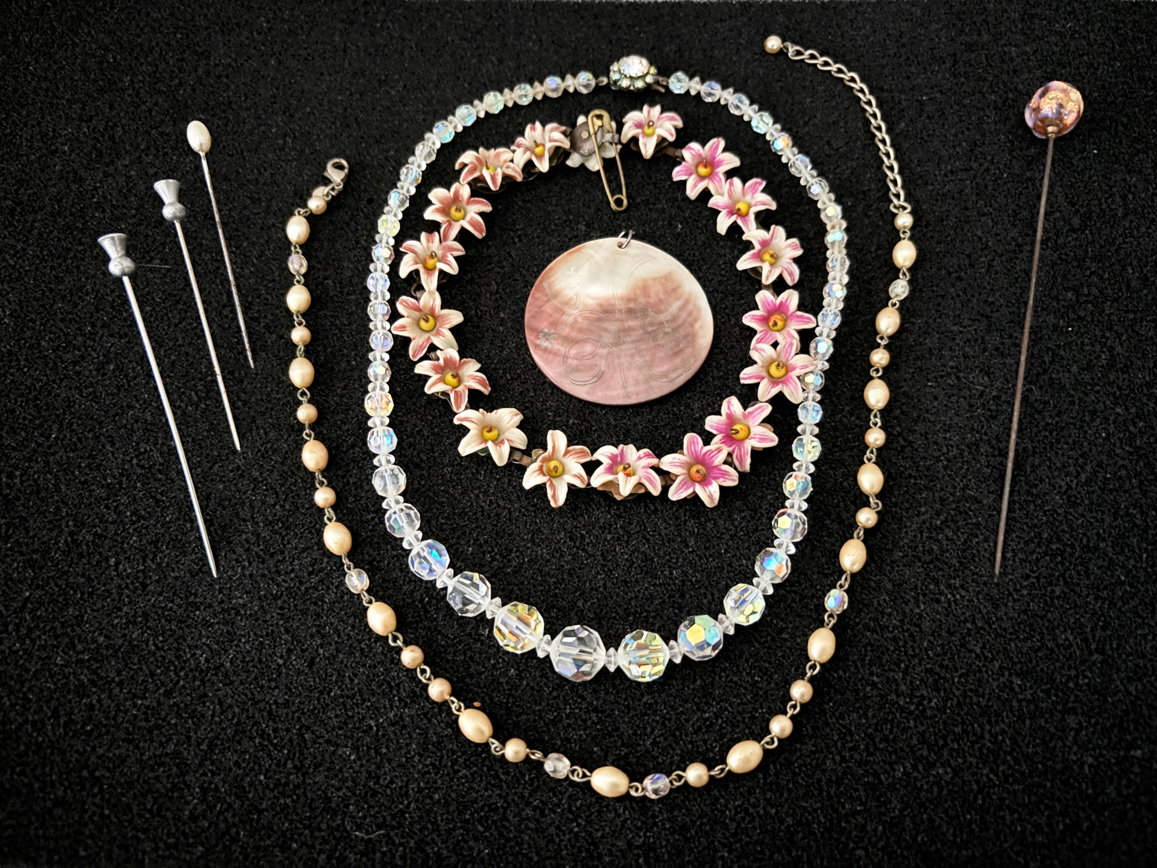 An Aurora Borealis and delicate flower necklace together with an engraved shell and bead necklace and four hat pins