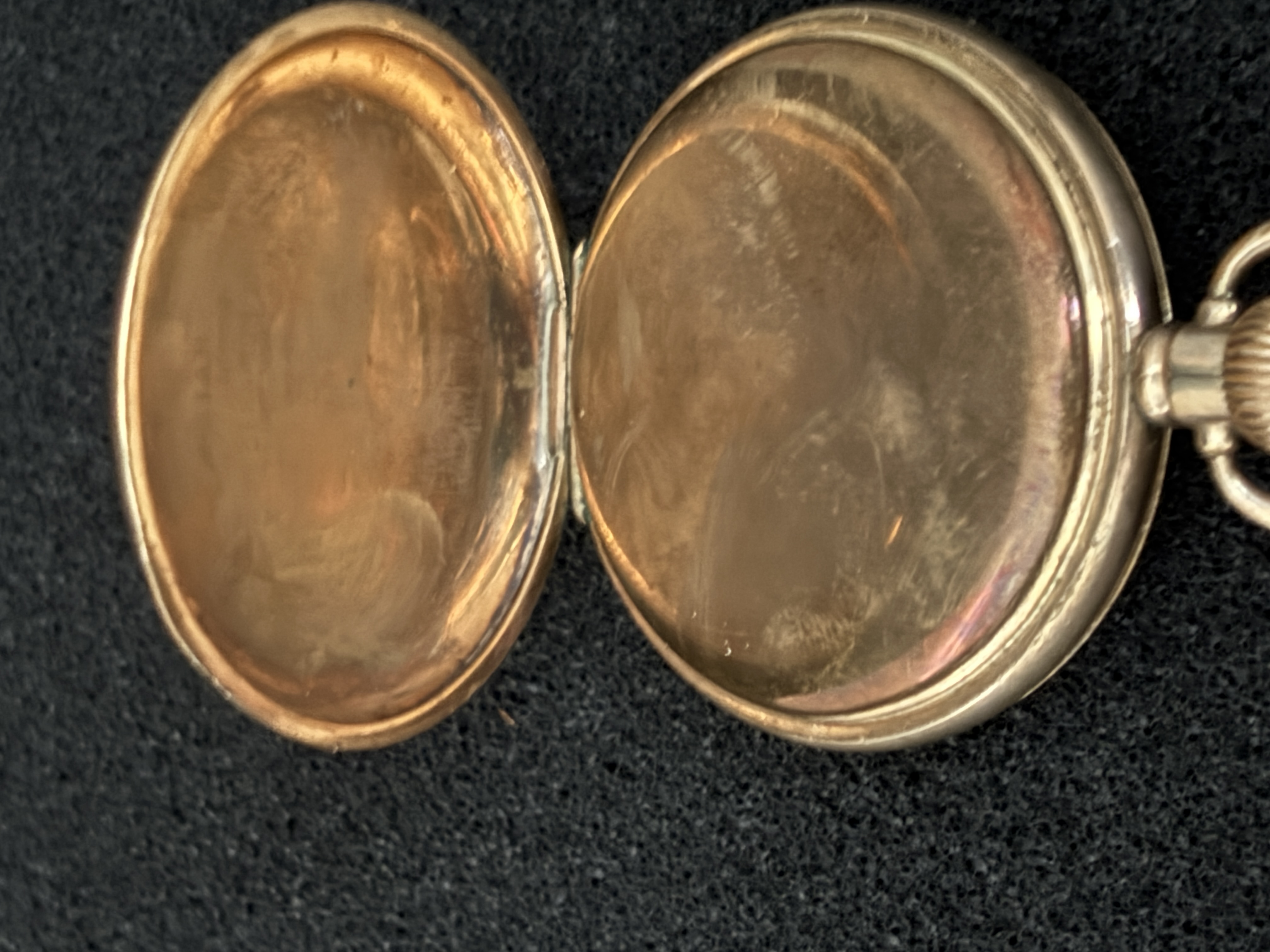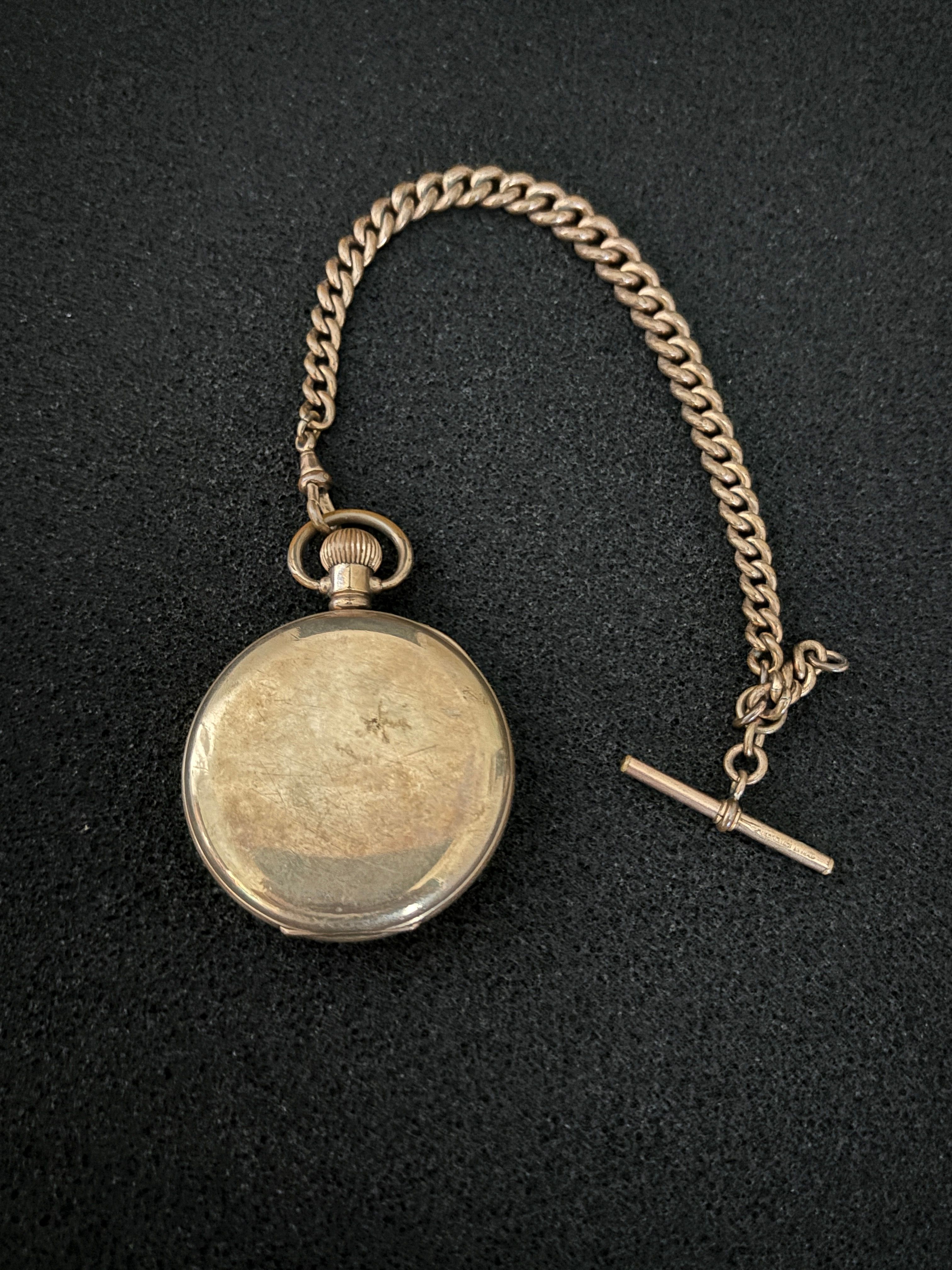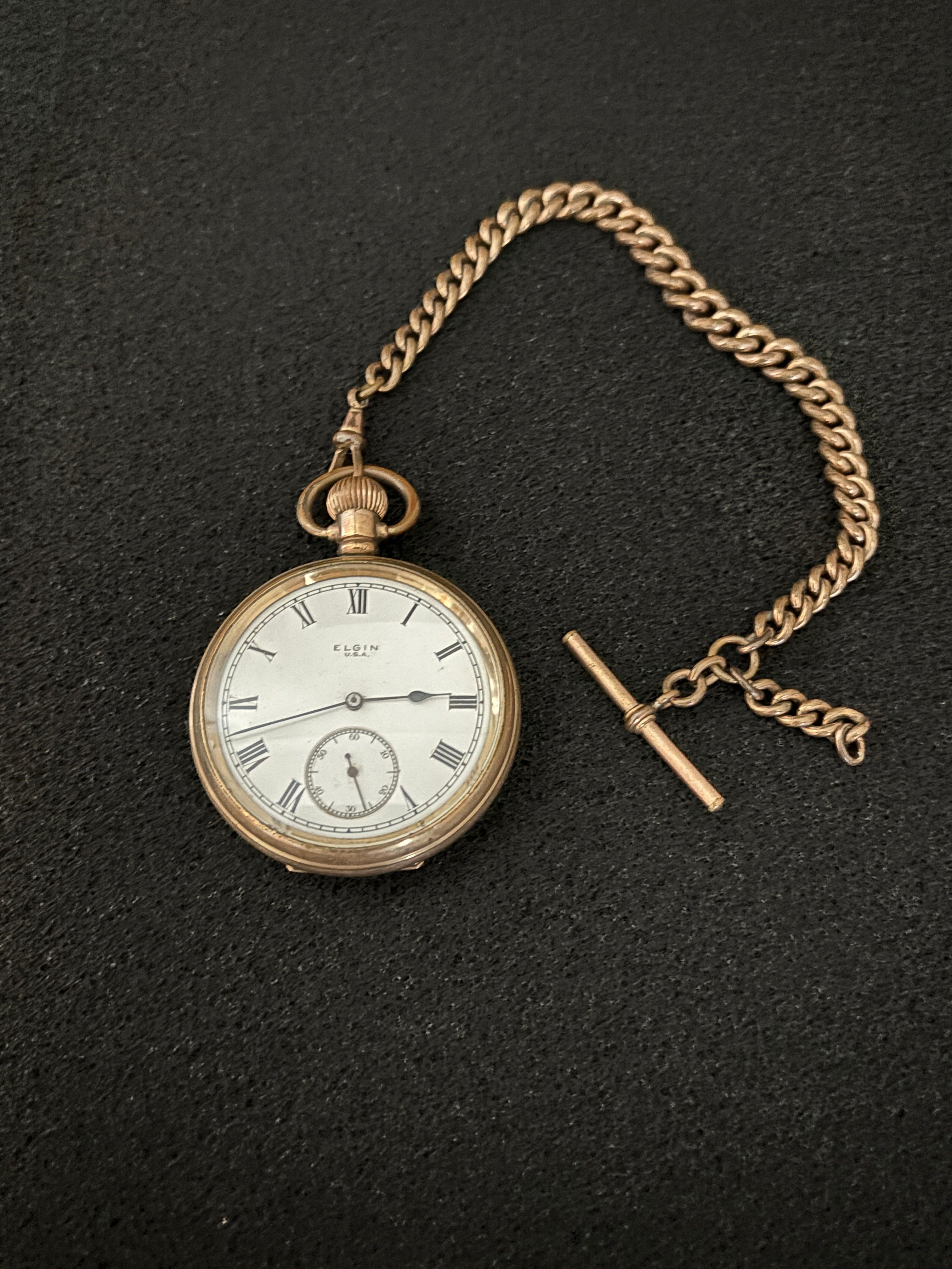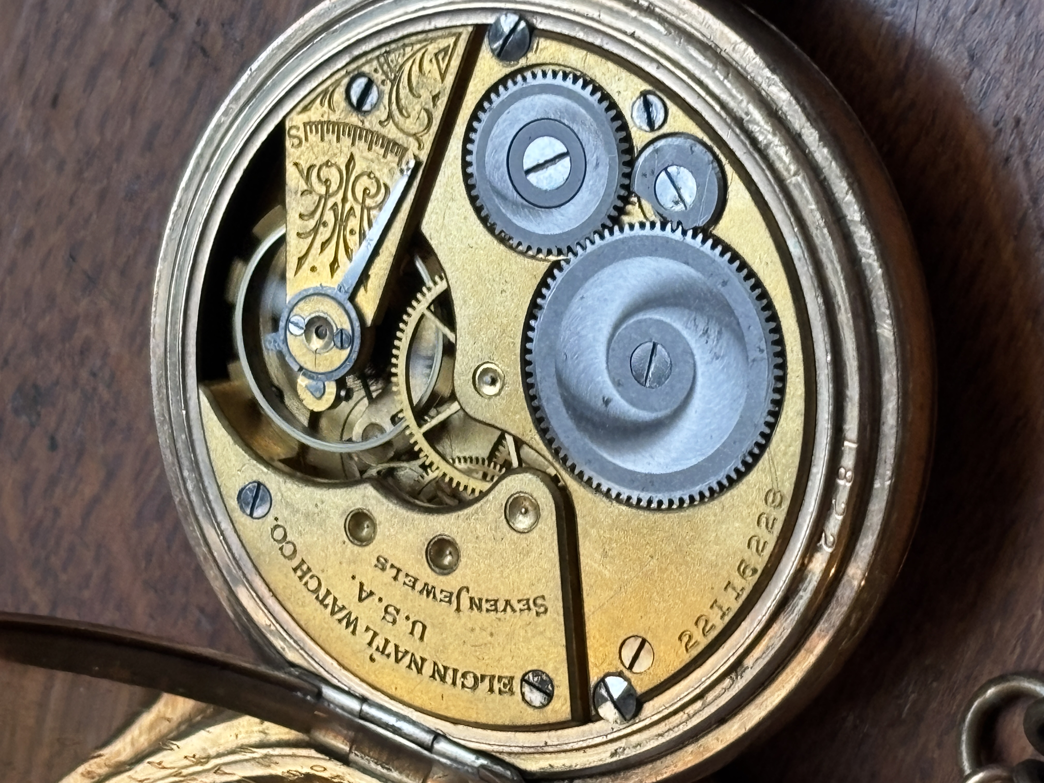 An Elgin and Co yellow metal Pocket watch, with chain (seen working)