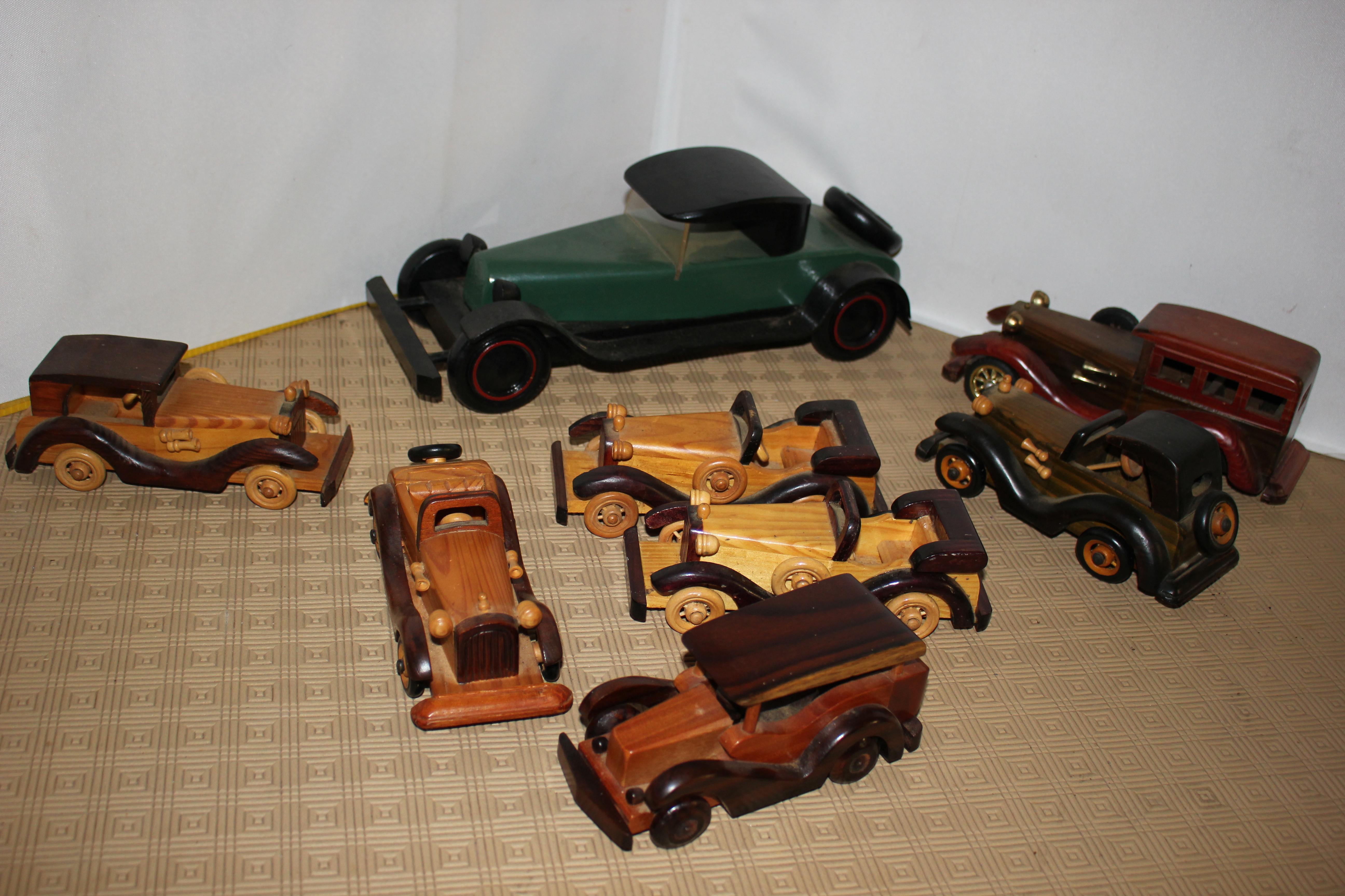 Eight wooden car ornaments