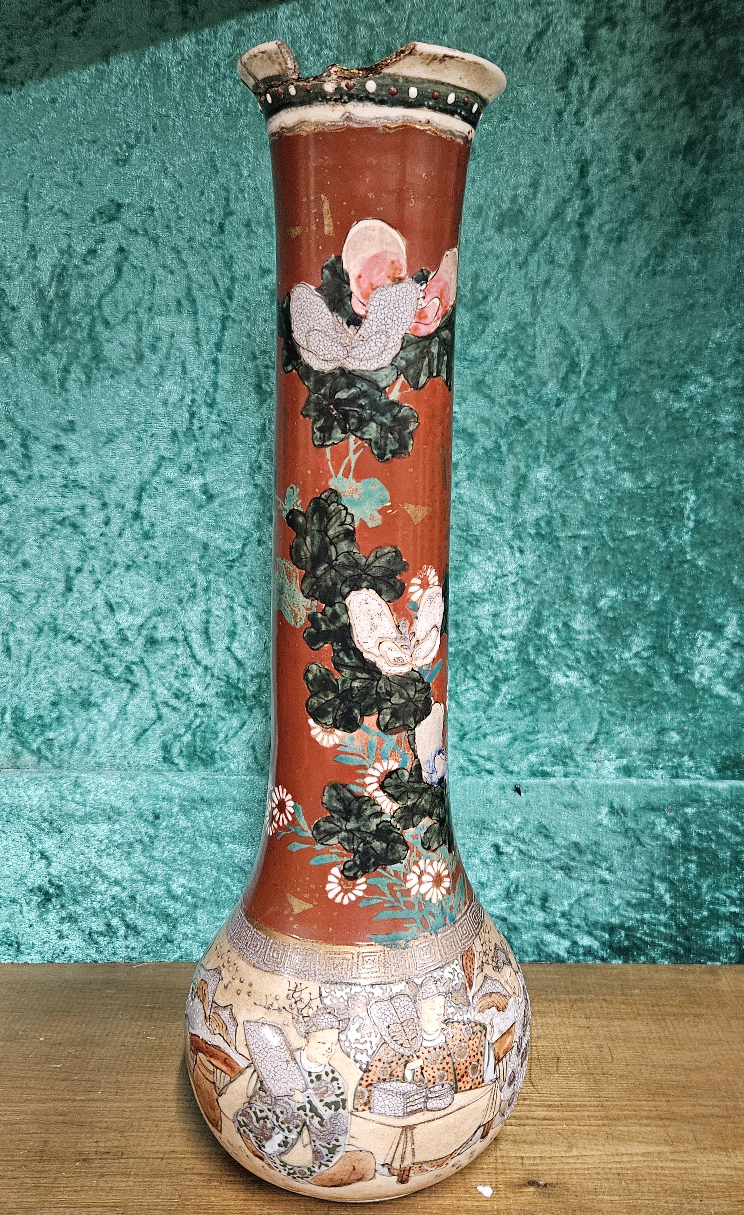 A late 19th century Japanese Satsuma bottle vase, having typical decoration, Height 38cm, damaged