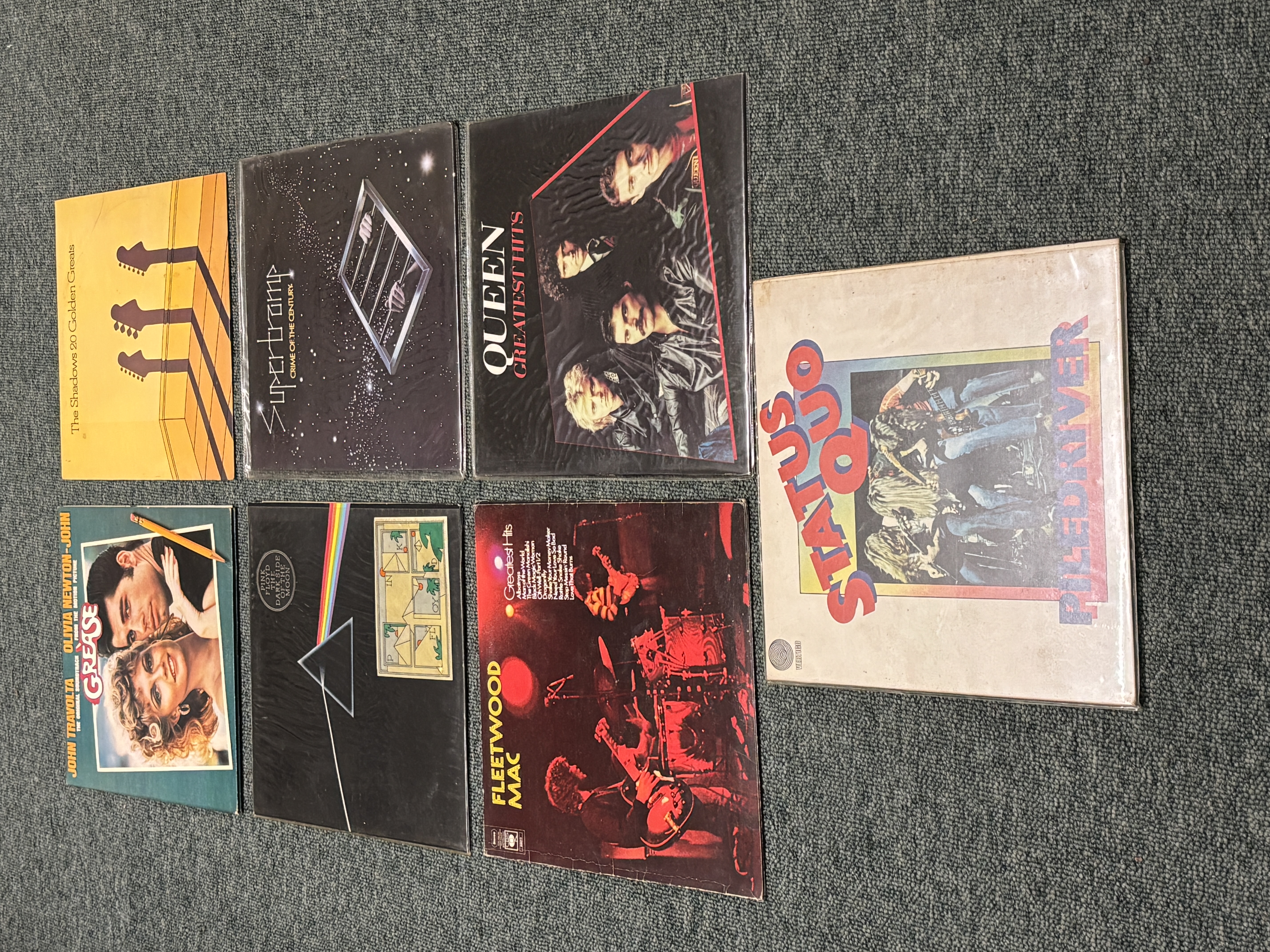 Seven LP records to include Pink Floyd Dark Side of the Moon, Status Quo, Queen, Shadows, Fleetwood Mac, Supertramp and the Grease Soundtrack