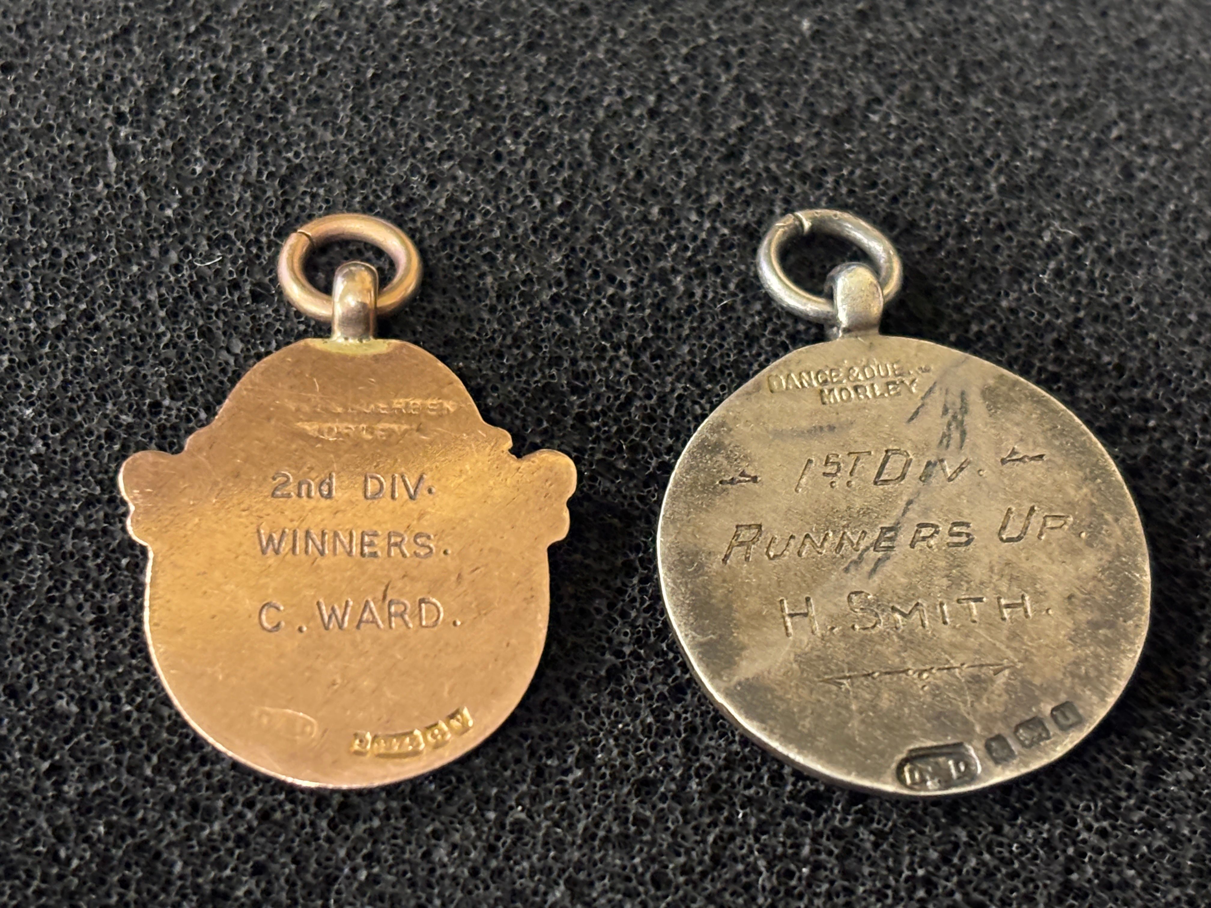 A Silver medal presented to the Runners up of the FDF League first Division 1919-20 (7.99 gm) together with a 9ct gold football medal (by Dance & Duerden weighing 4.43 gm) presented by the FDF League 1920-21 to the 2nd Division winners. Going by the dates, and crest, the team appears to be Blackpool FC
