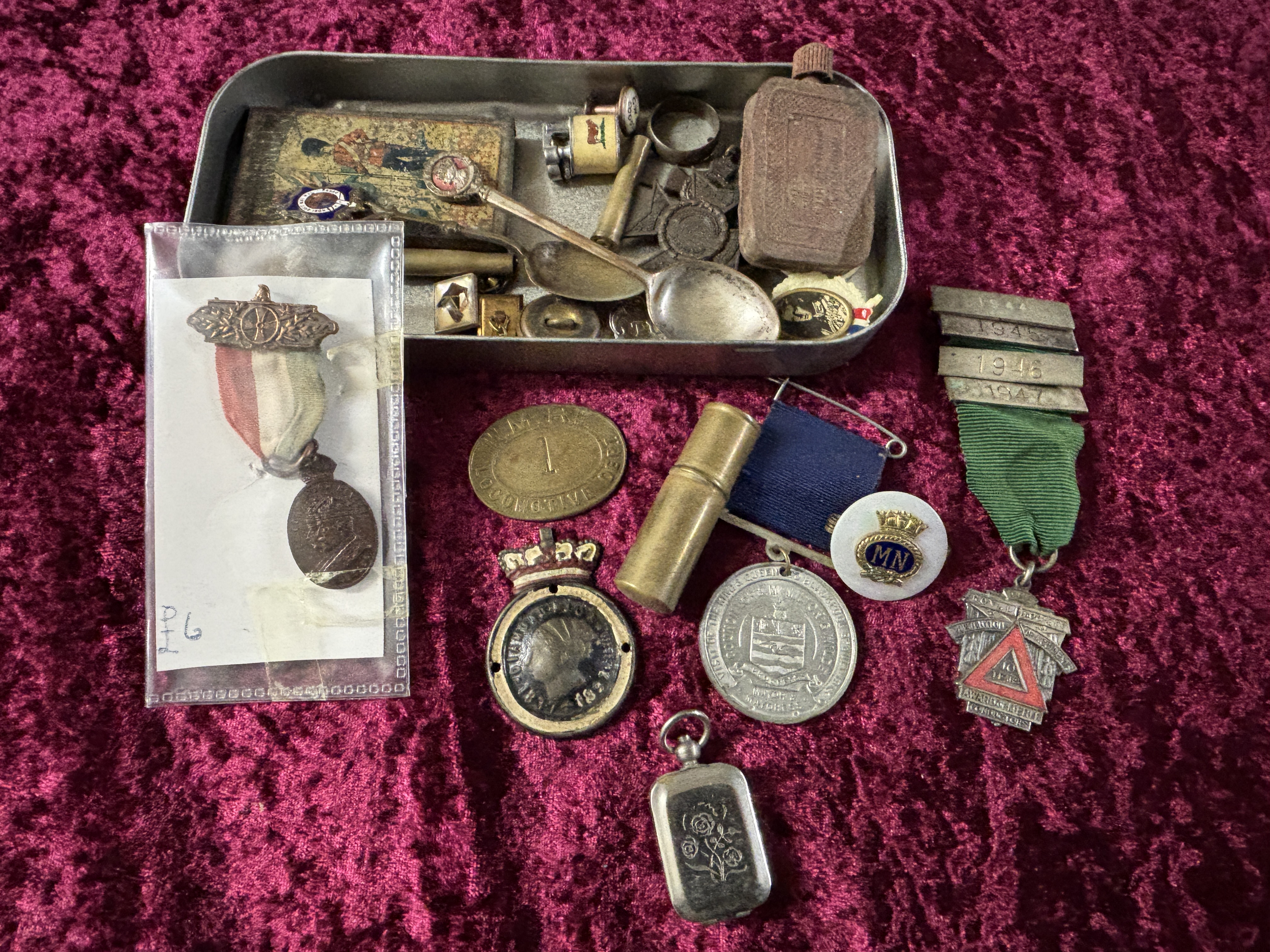 A metal tin with a mixed lot of items to include medals etc