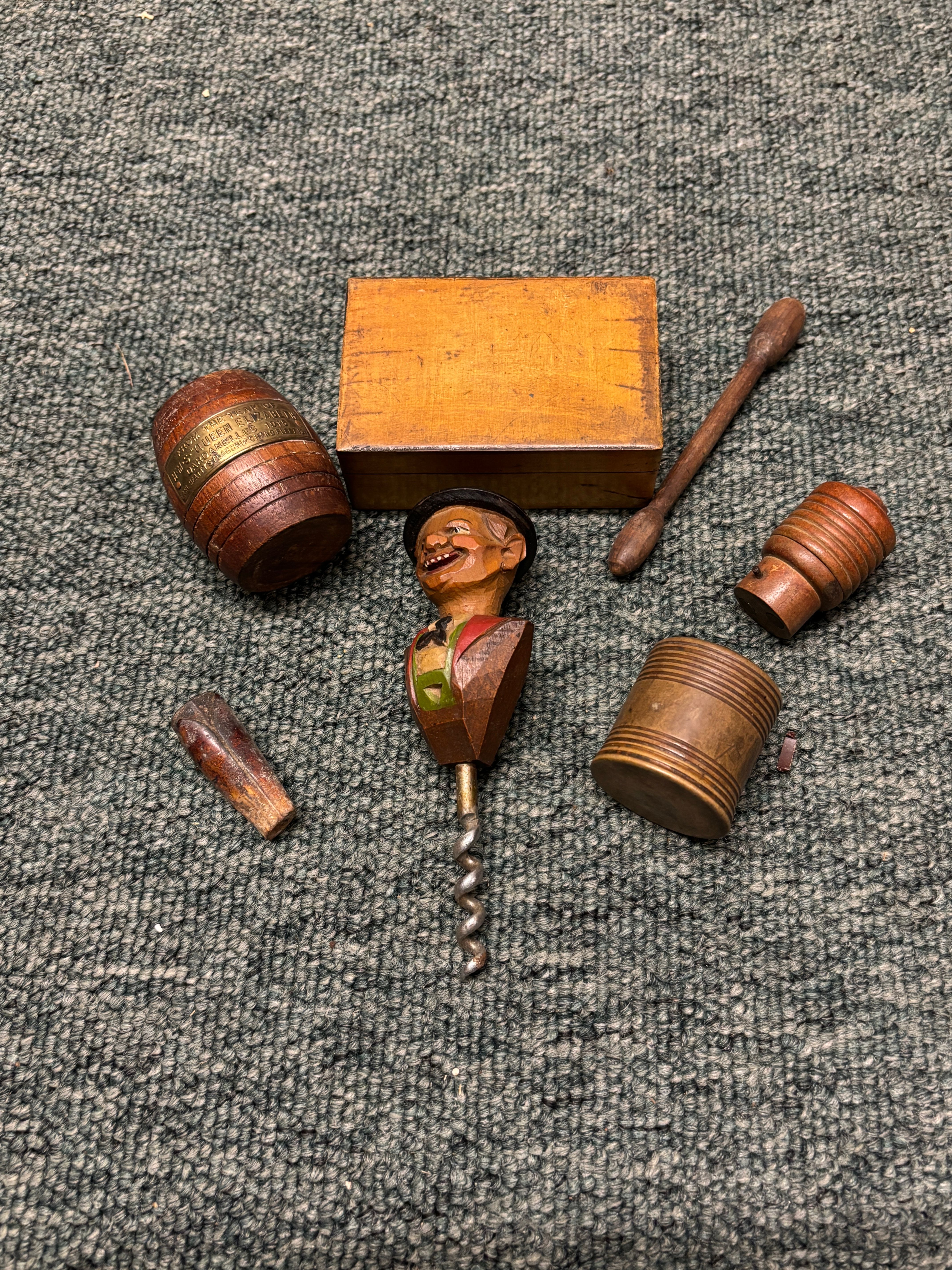 An assortment of treen, wooden objects and corkscrew