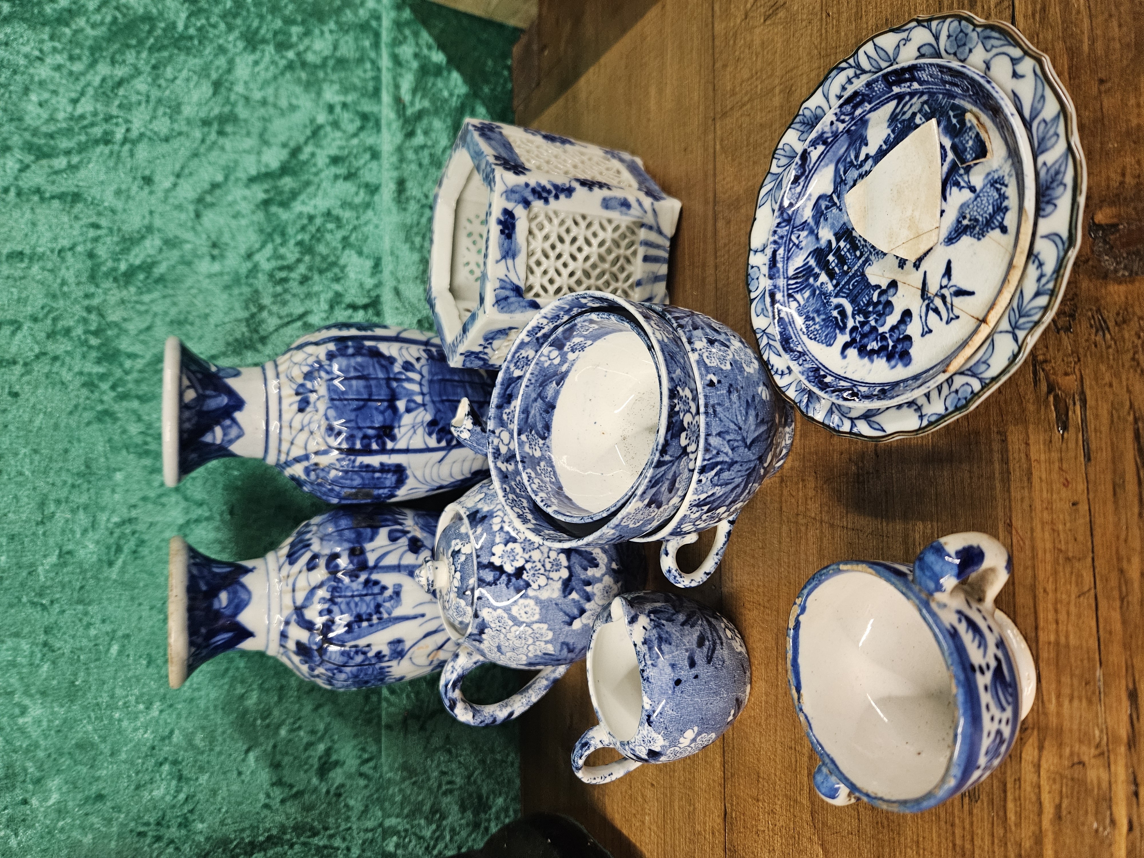 A selection of blue and white ceramics, including a pair of Japanese vases, height 21cm