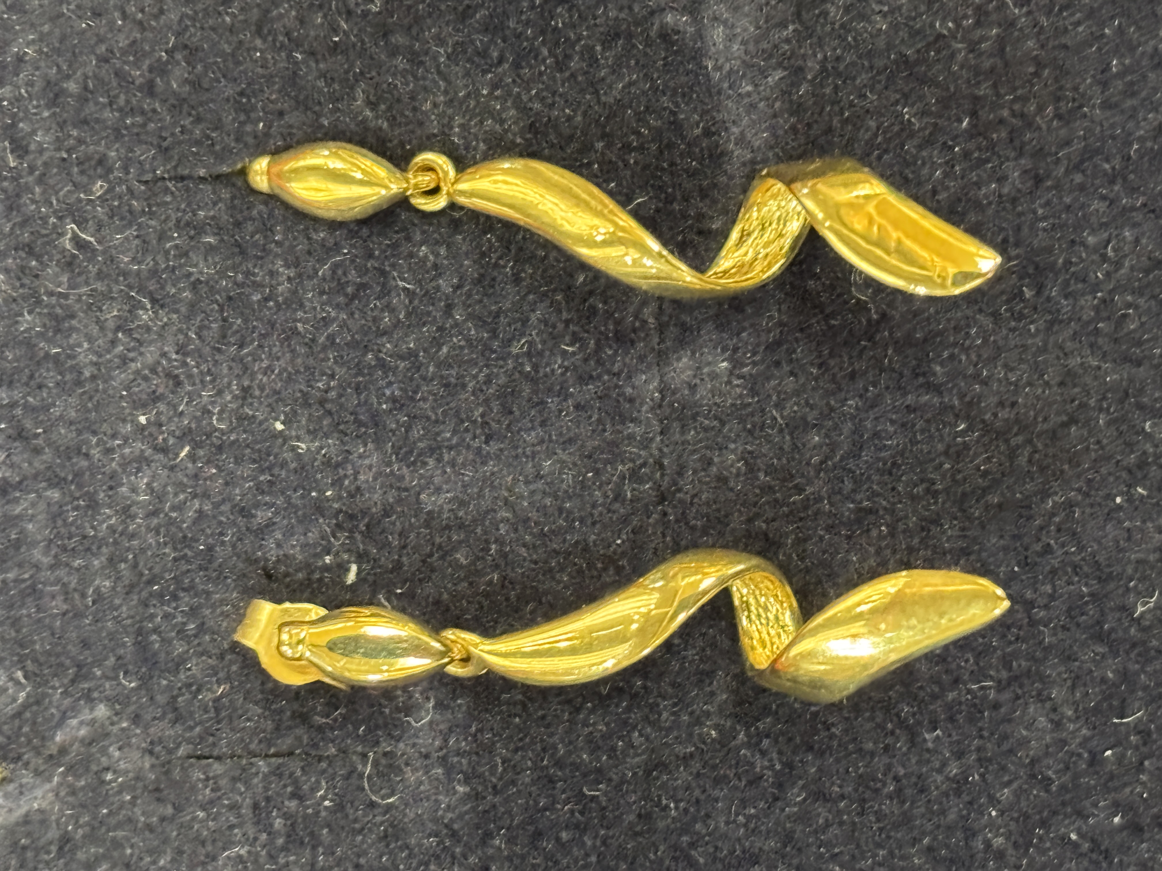A matched pair of drop earrings in 9ct yellow gold (marked 375) with post and scroll backs