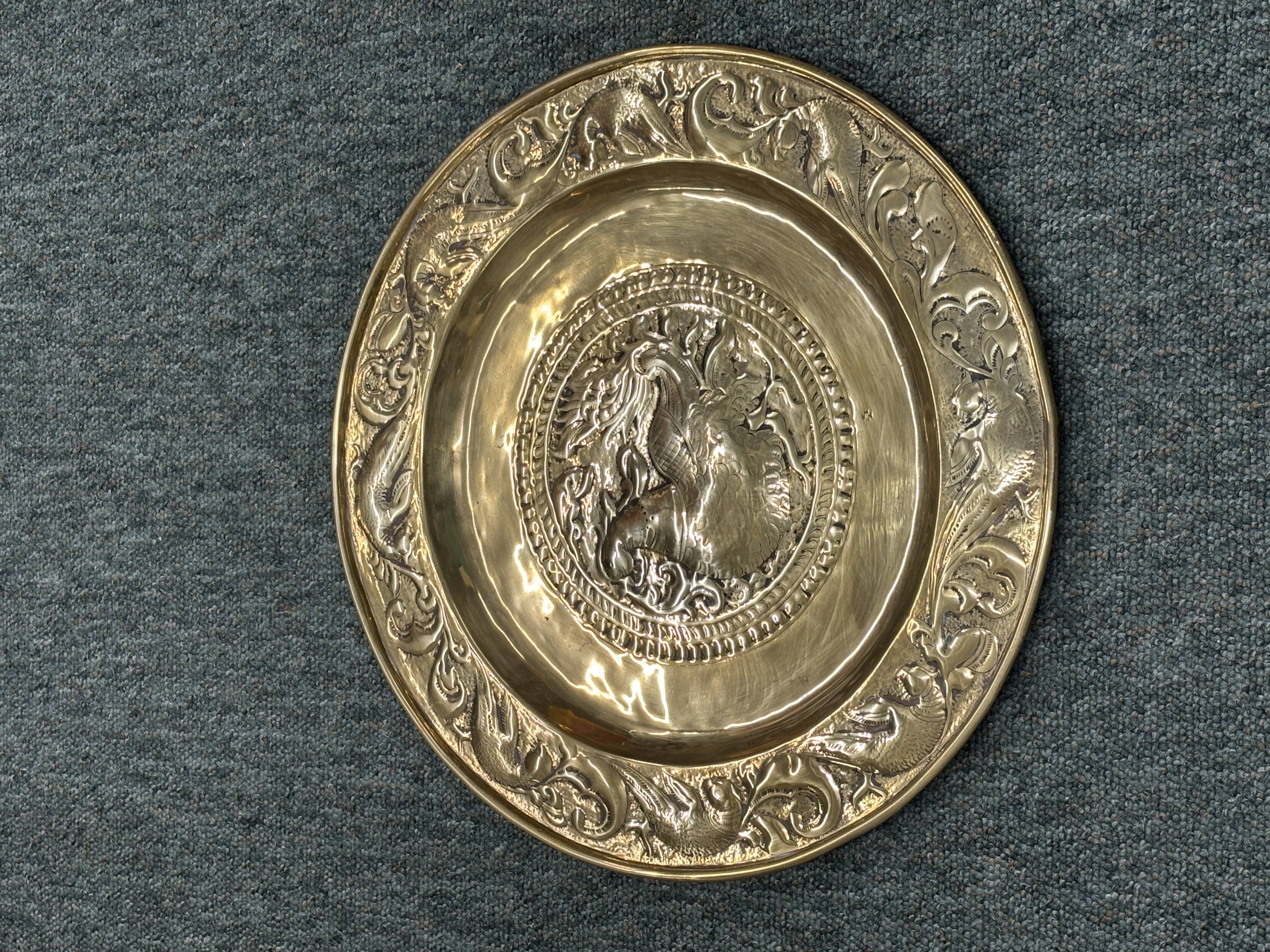 A circular brass charger produced by the Keswick School of Industrial Arts. The piece is constructed from a single sheet of hand-hammered brass using repousse and chasing techniques. The wide, flat rim features a continuous frieze of scrolling foliate motifs interspersed with birds. A deep well leads to a raised central boss depicting a mythological creature, possibly a griffin or dragon, set against a finely stippled ground. 30 cm Diameter