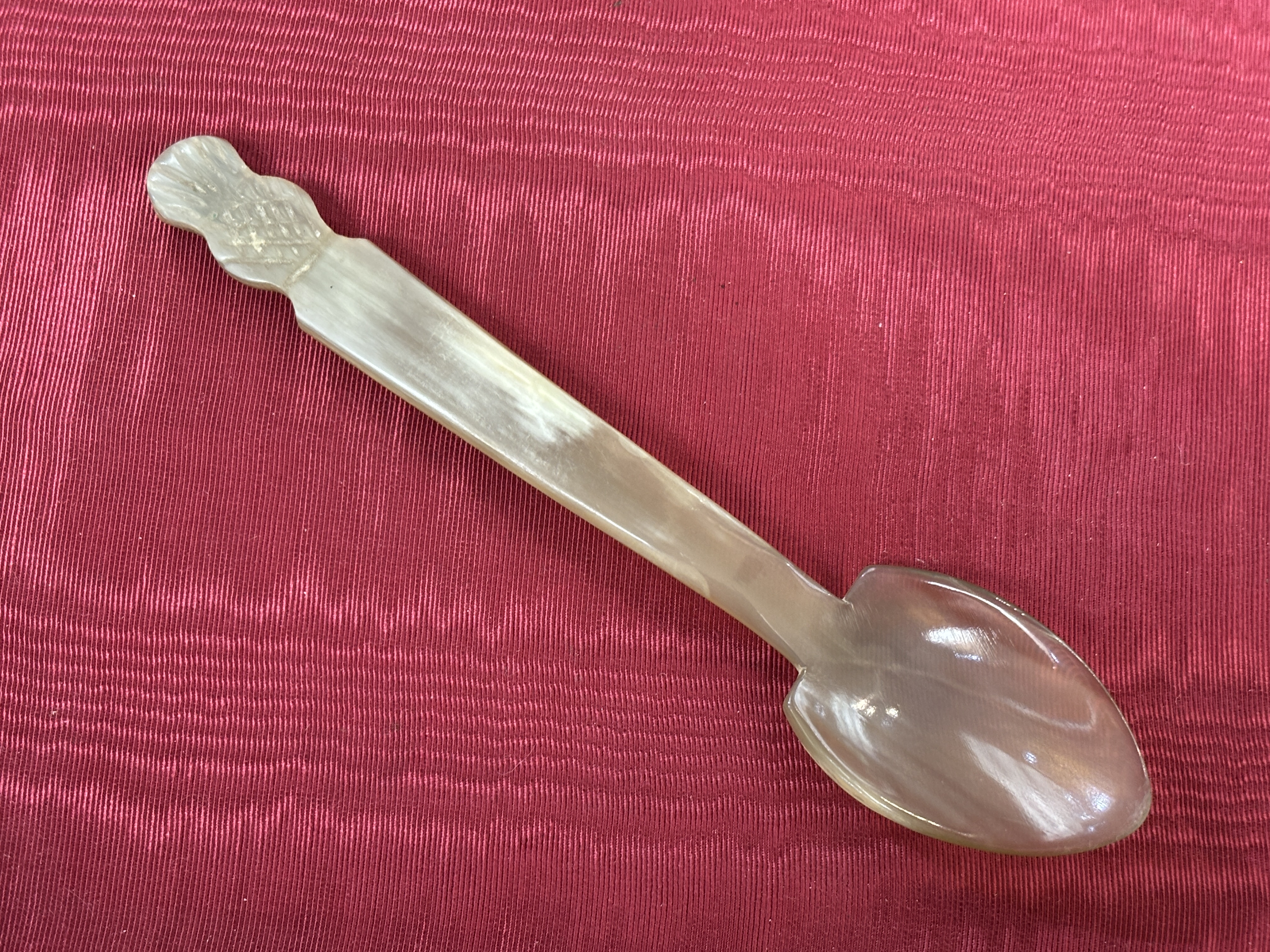 This collection comprises various small vanity and needlework items, including a retractable crochet hook together with a horn egg spoon and shoe horn.