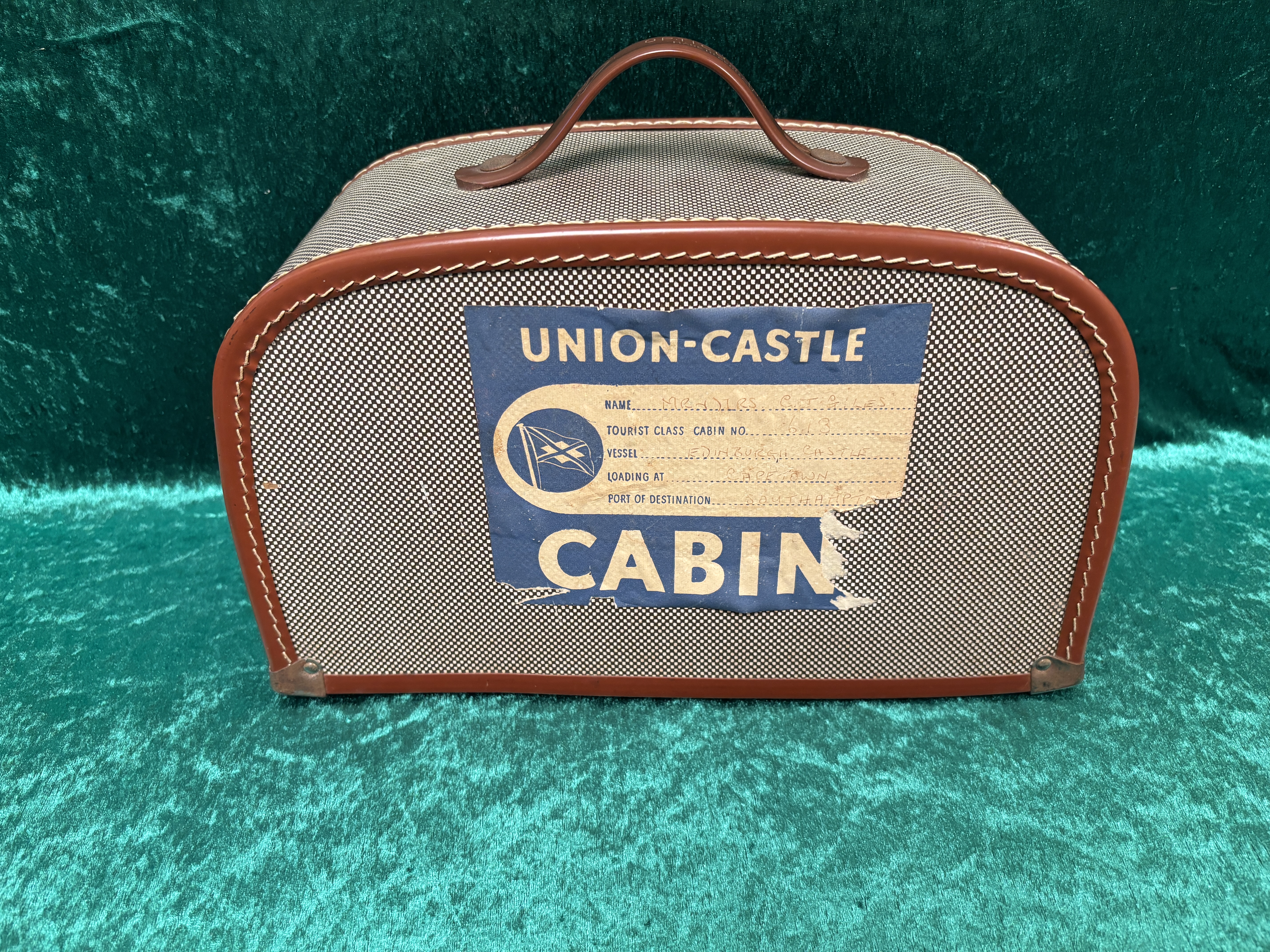 This lot features an Agfa Opticus 100 slide projector, Type 5970, manufactured in Germany. The projector is constructed with a grey crinkle-finish metal body and is mounted upon a wooden baseboard. It displays the Agfa diamond logo on the side and includes an integrated electrical power cord. Accompanying the projector is the original paper instruction manual titled Directions for Use Agfa Opticus 100. The set is housed in a fabric-covered transport case designed as a small suitcase with brown trim, white stitching, and metal corner protectors. The case bears a prominent blue and tan Union-Castle Line cabin luggage label. This label contains handwritten provenance for Mr and Mrs C. T. Giles, who travelled Tourist Class in cabin 613 on the vessel Edinburgh Castle from Cape Town to Southampton.