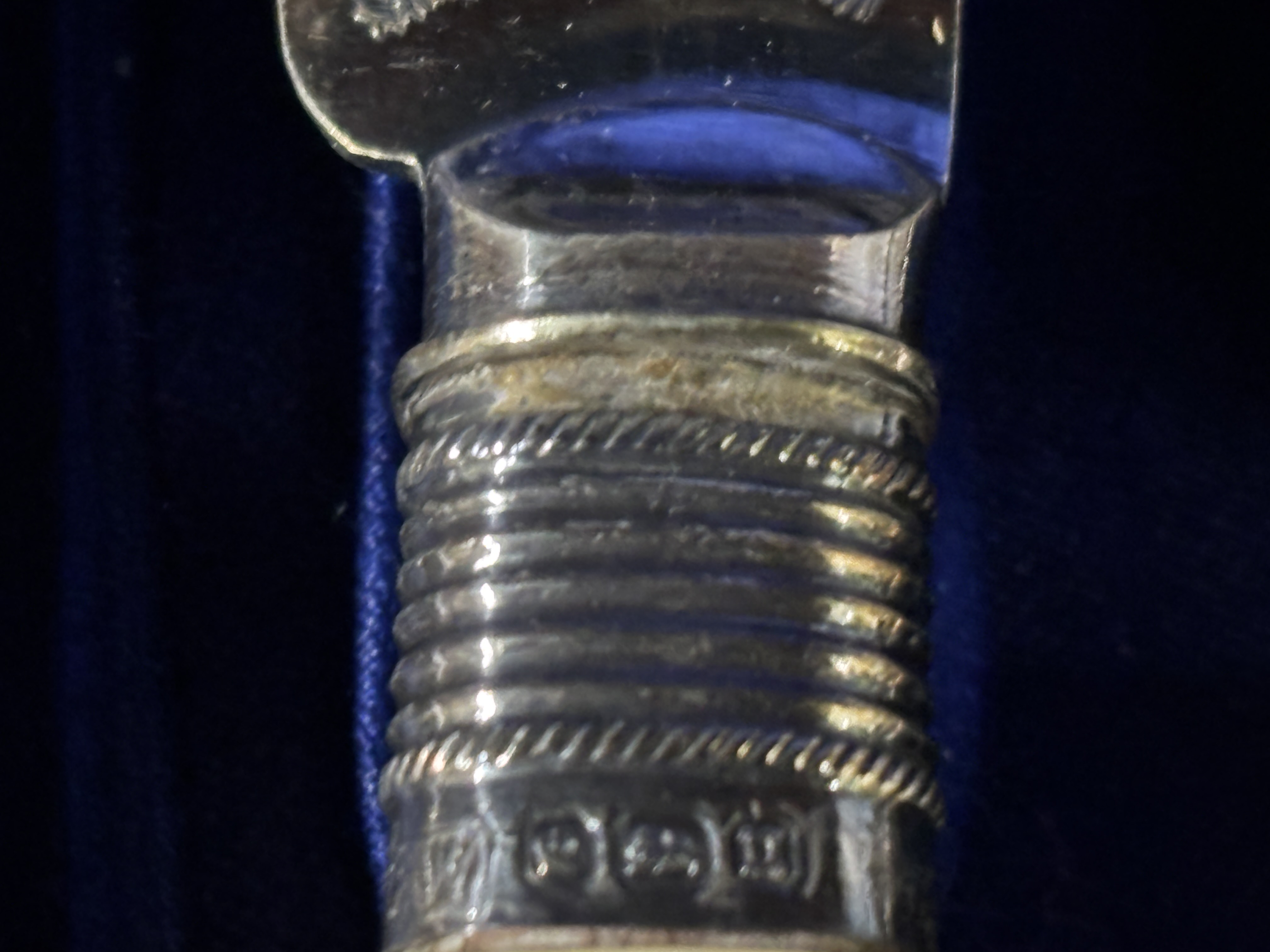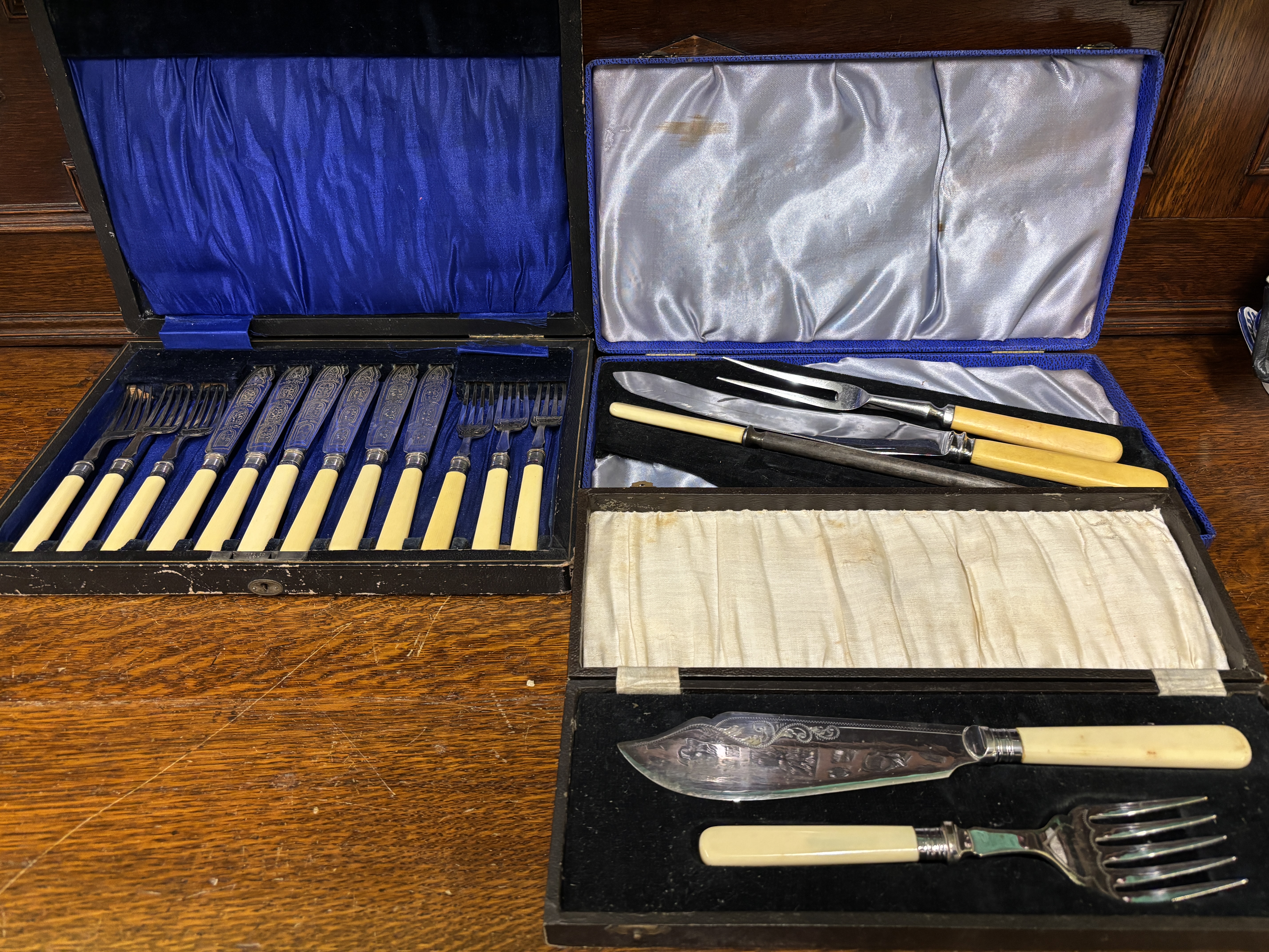 Three boxed sets of flatware, one set having HM Silver ferrules