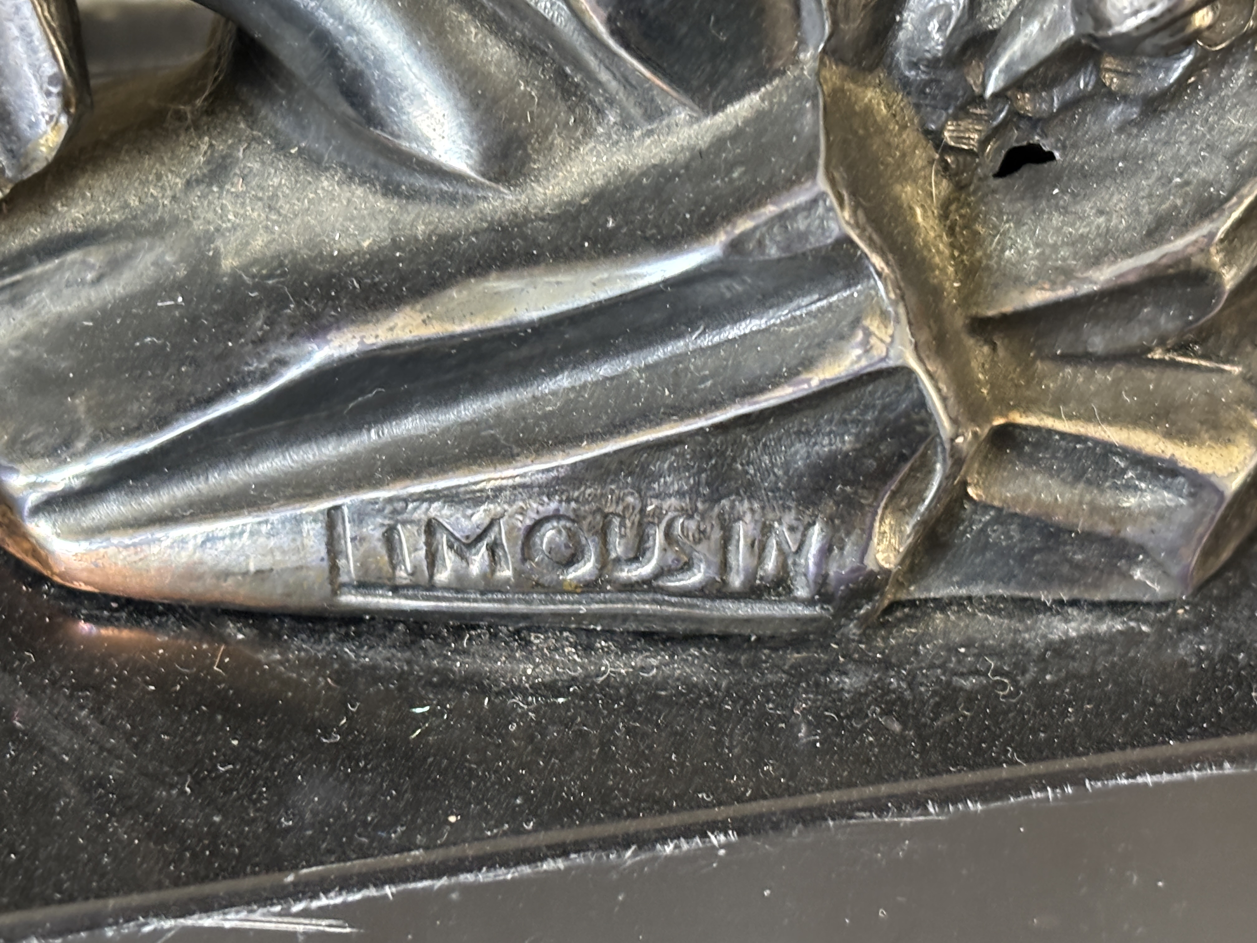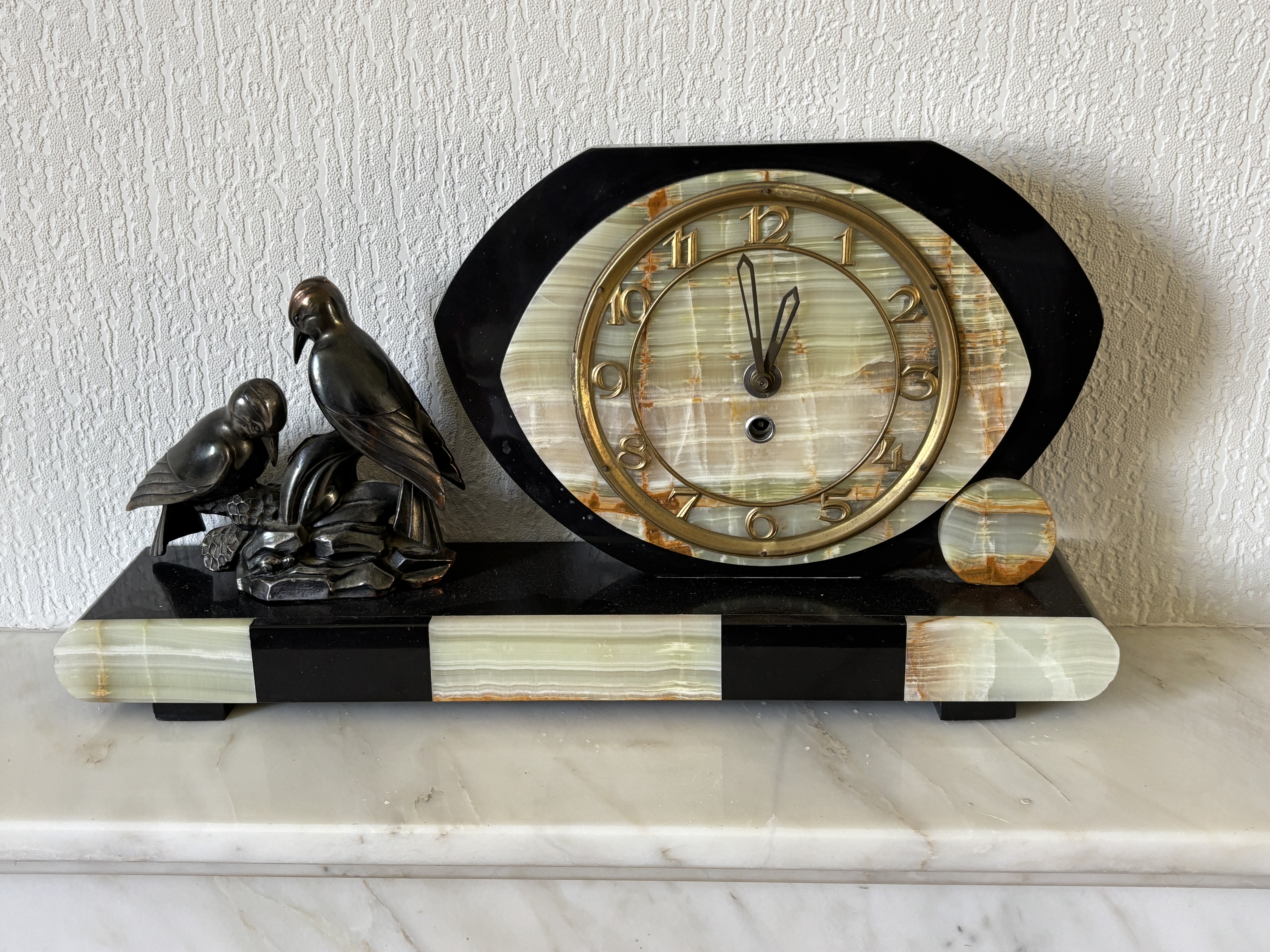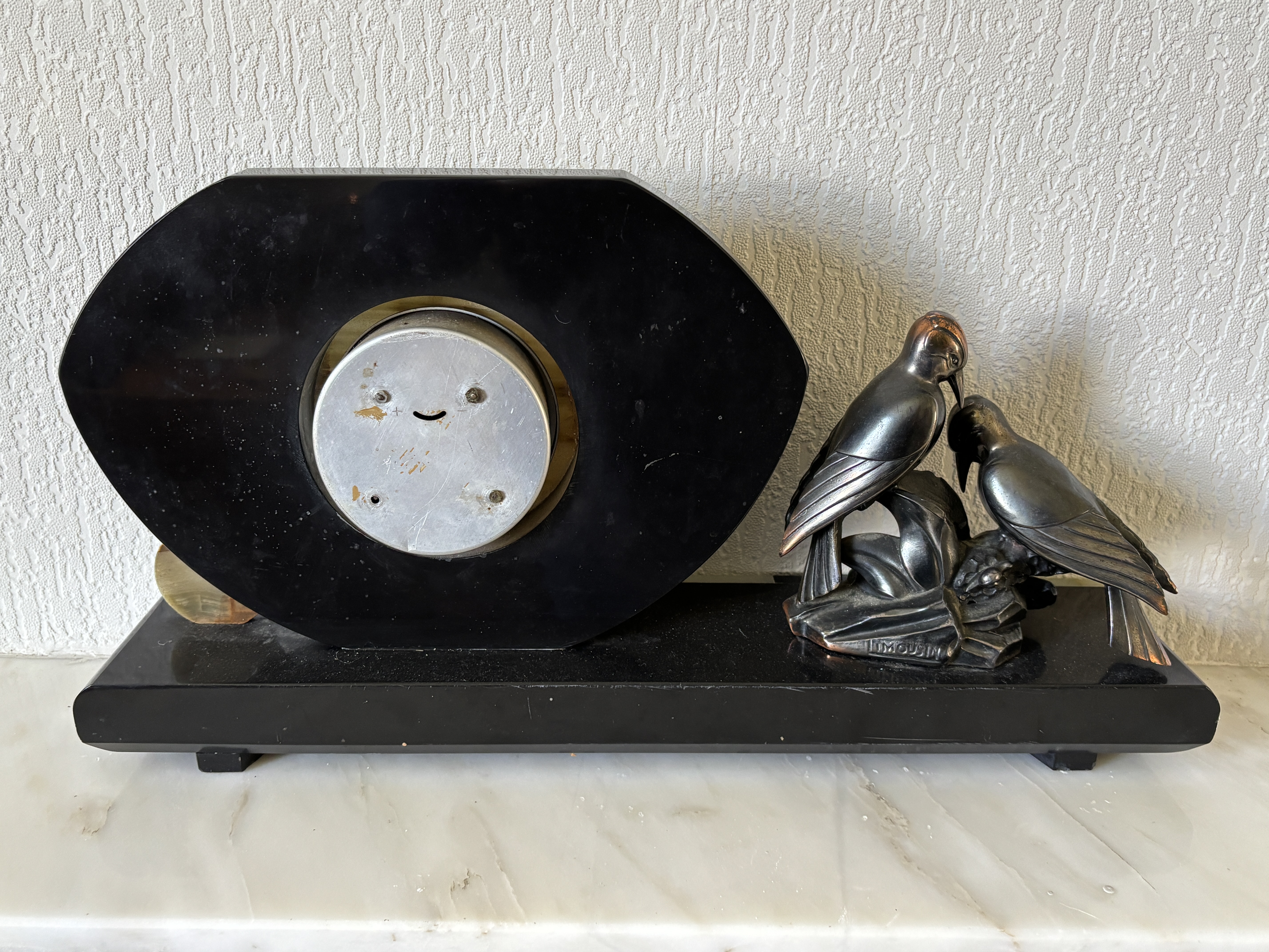 This Art Deco mantel clock in the style of the French artist Jacques Limousin. The piece is constructed with an architectural base composed of alternating blocks of black marble and green banded onyx. The clock movement is set within an oval black marble panel featuring a central onyx face and a small circular onyx decorative disc to the right. To the left of the clock is a patinated metal sculpture depicting two birds perched upon a rocky outcrop. The sculpture bears the embossed mark LIMOUSIN on the lower front edge of its base. The clock face includes a gilt metal chapter ring with stylised Arabic numerals and two simple hands, with a winding aperture located below the central spindle. The reverse of the clock shows a circular metal movement housing with an adjustment slot for regulation. Measurement 50 cm wide and 26 cm high.