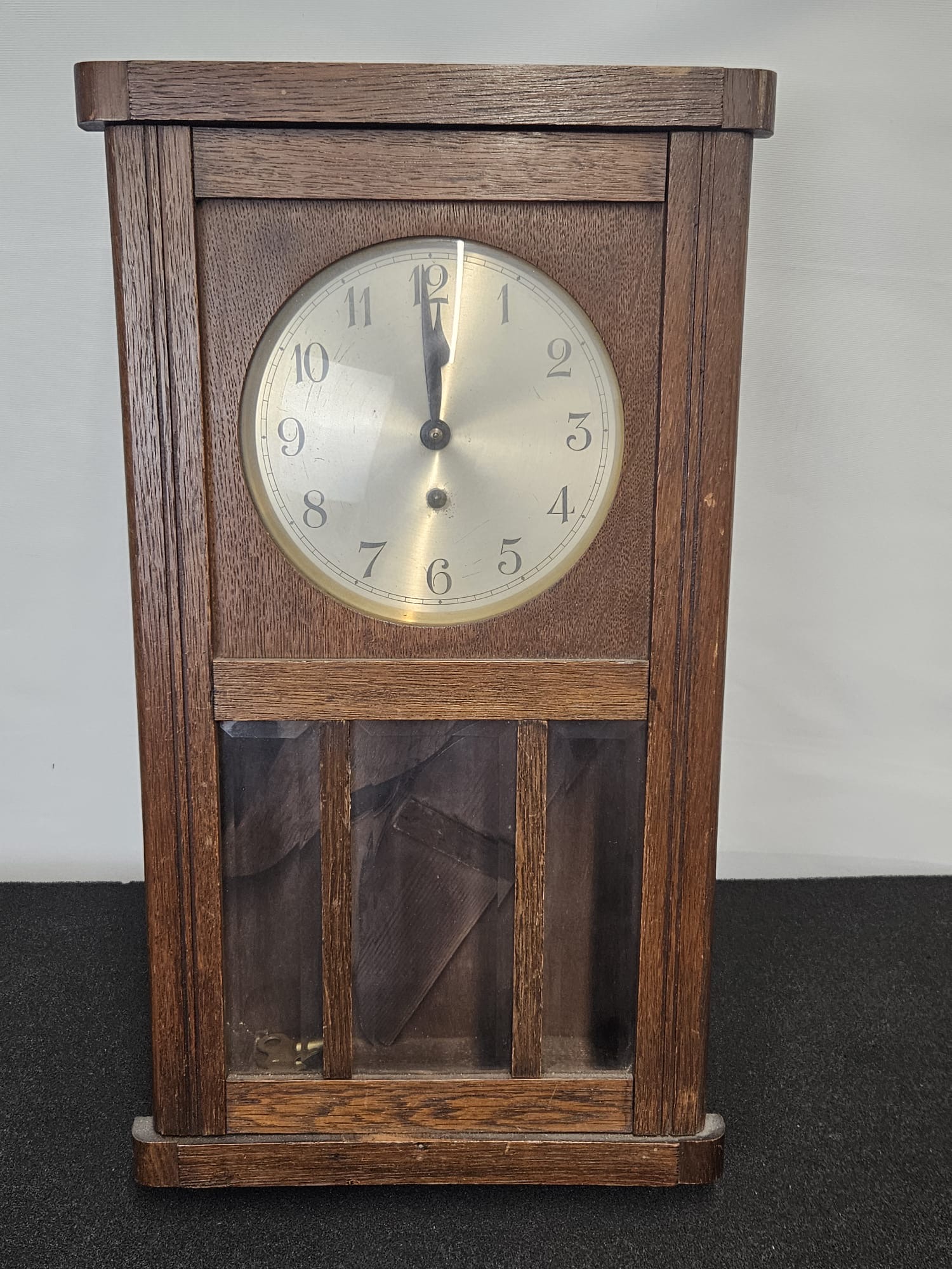 An early 20th century oak case wall clock having bevelled triple glass panel to front. 49 cm high