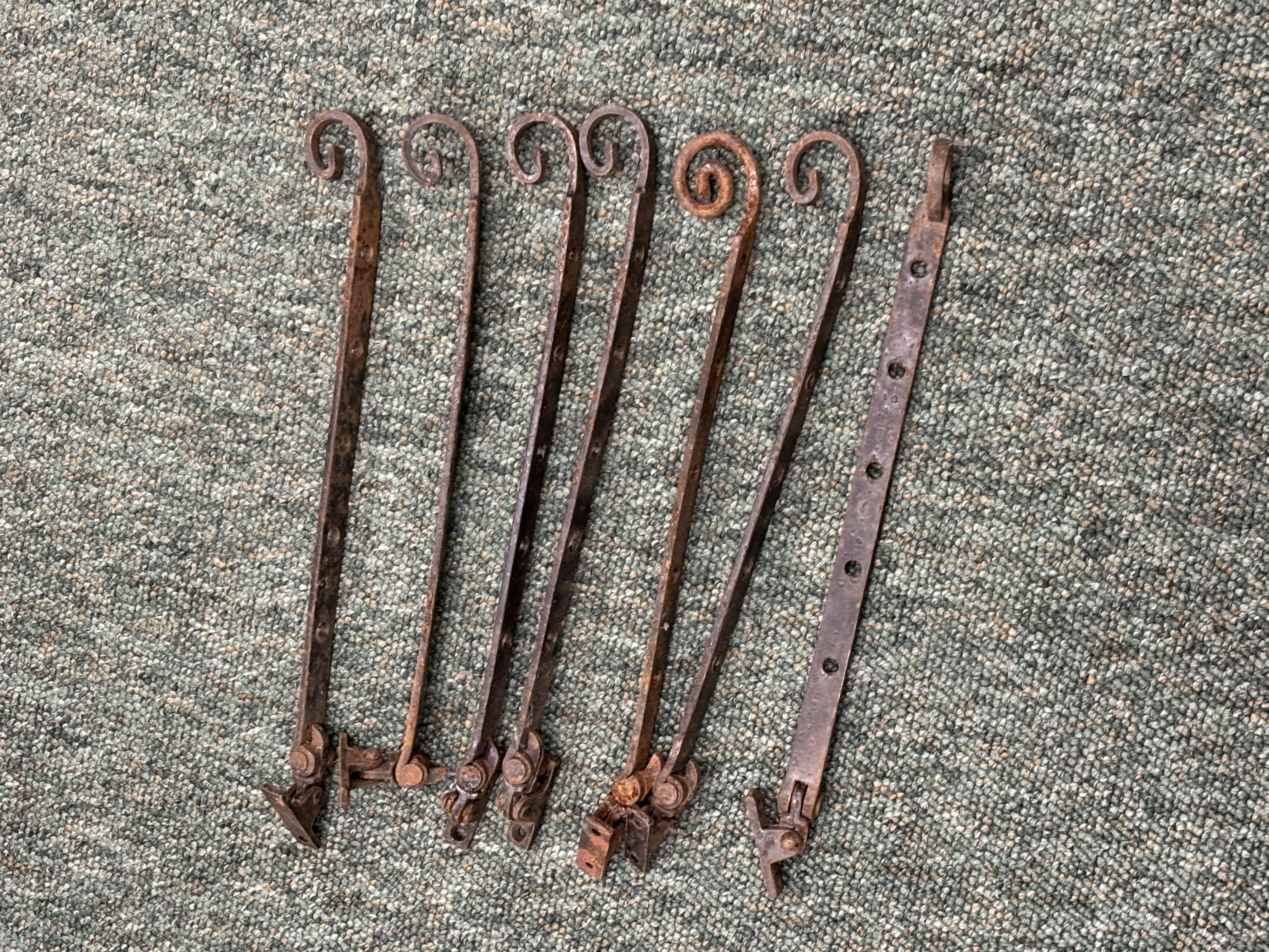 Seven iron casement window stays in a traditional English period style being 30 cm long