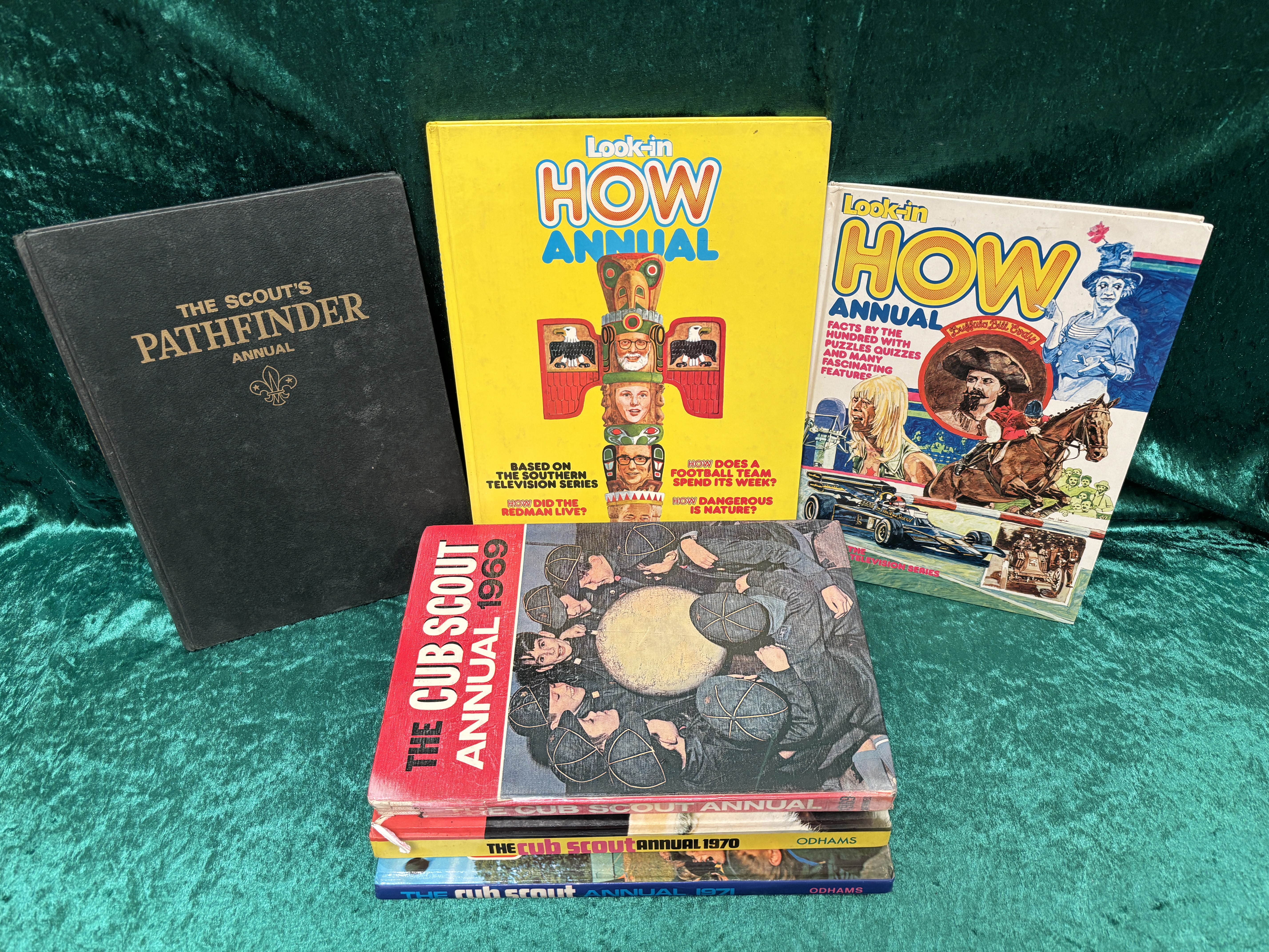 This collection comprises seven vintage children’s annuals relating to the Scout movement and the Southern Television series How. The group includes The Scout’s Pathfinder Annual, featuring textured cloth boards with gilt-stamped lettering and the Scout fleur-de-lis logo to the front cover. Two Look-in HOW Annuals are present, based on the Southern Television series; one volume features a yellow pictorial cover with a totem pole illustration, while the other features a white pictorial cover with illustrations of Buffalo Bill Cody and a racing car. The collection further includes four Cub Scout Annuals: the 1969 edition with red pictorial boards showing Cub Scouts around a drum; the 1970 edition with a yellow spine published by Odhams Press; the 1971 edition with a blue spine published by Odhams Press; and one additional Cub Scout volume positioned within the stack.