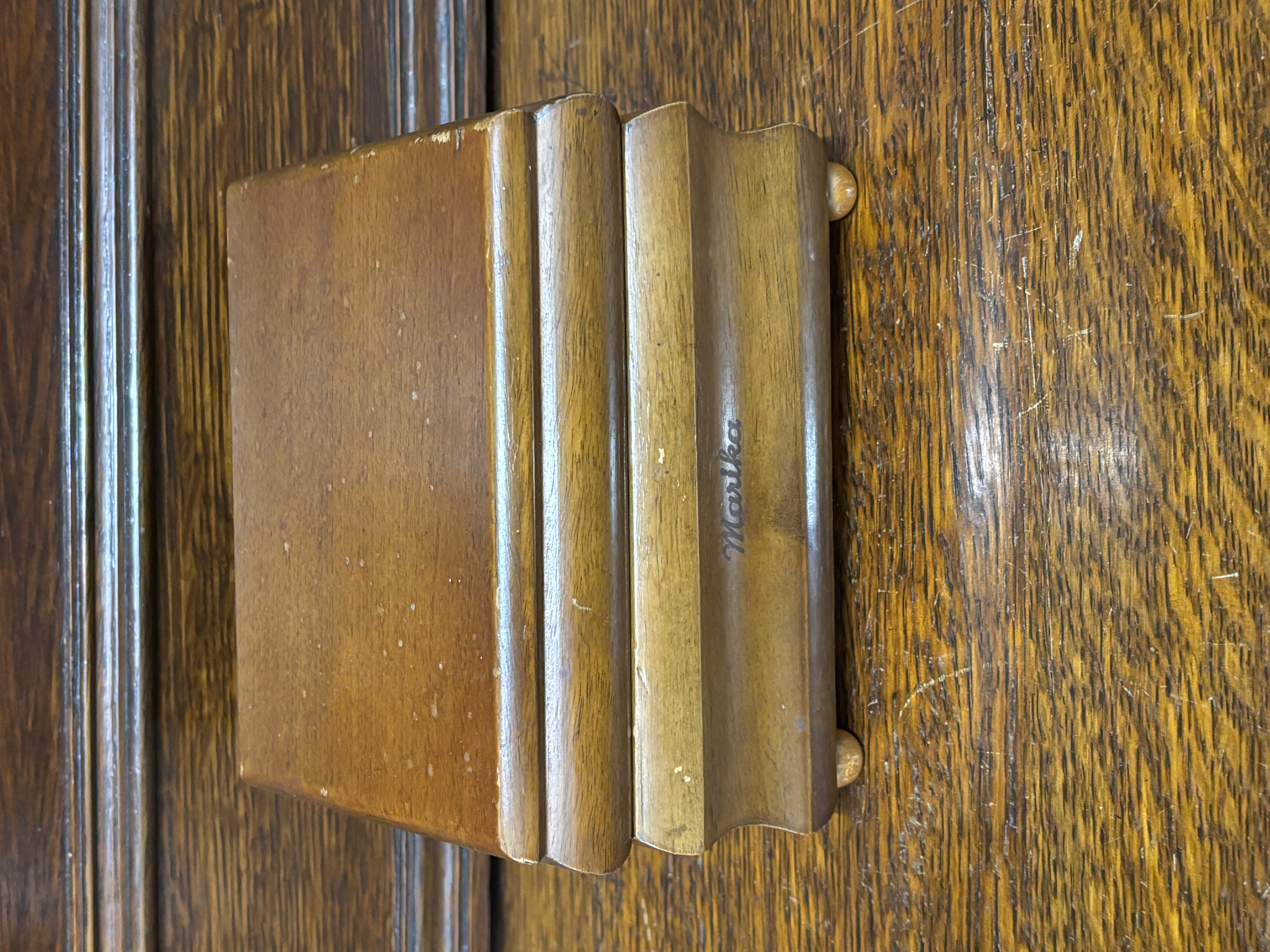 A mid-20th century wooden jewellery and music box featuring a tiered, stepped lid and base design supported by small bun feet. The front face is inscribed with the name Martha in a dark script. The hinged lid opens to an interior lined with blue velvet-effect fabric, partitioned into three horizontal compartments. The underside of the lid contains a multi-panelled mirrored insert with a blue corded border, designed to reflect a central mechanical ballerina figurine in a white tutu.