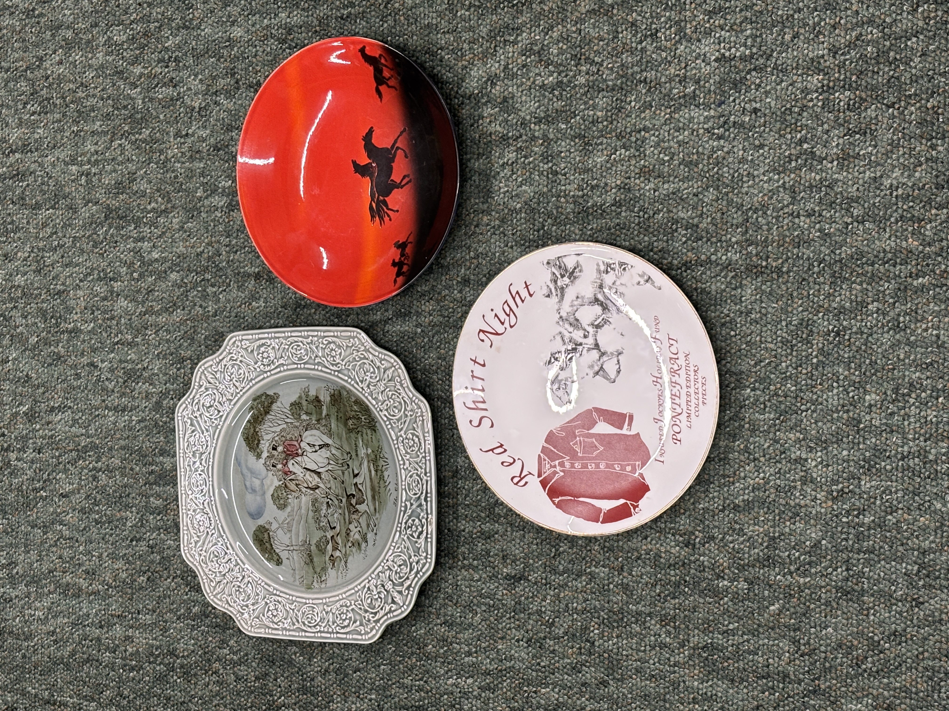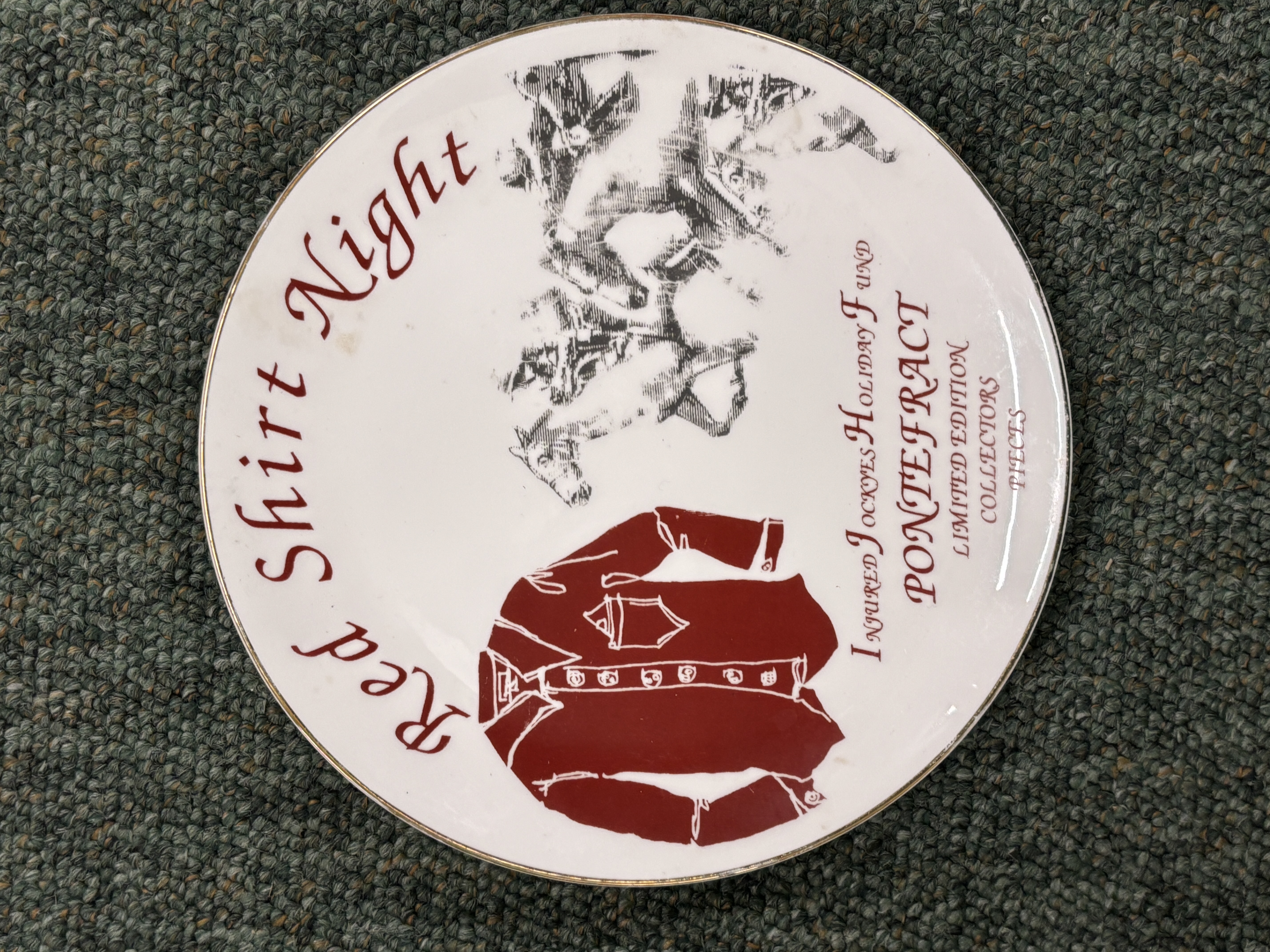 A trio of decorative ceramic items featuring equestrian themes. The collection includes a Crown Ormonde fine bone china commemorative plate for Red Shirt Night at Pontefract Racecourse, produced in aid of the Injured Jockeys Holiday Fund. The decoration features a transfer-printed stylised red shirt and a sketch of jockeys on horseback. The reverse is marked with a crown and ribbon backstamp for Crown Ormonde, Staffordshire, established 1995, and is hand-inscribed as number 46 of a limited edition of 2000. Also included is a circular glazed ceramic plate with a gilded rim, featuring black silhouettes of galloping horses against a graduated red and orange background. The final item is a rectangular earthenware plate with scalloped corners and a wide border heavily embossed with floral and scroll motifs, containing a central transfer-printed and hand-coloured scene of a traditional English fox hunt.