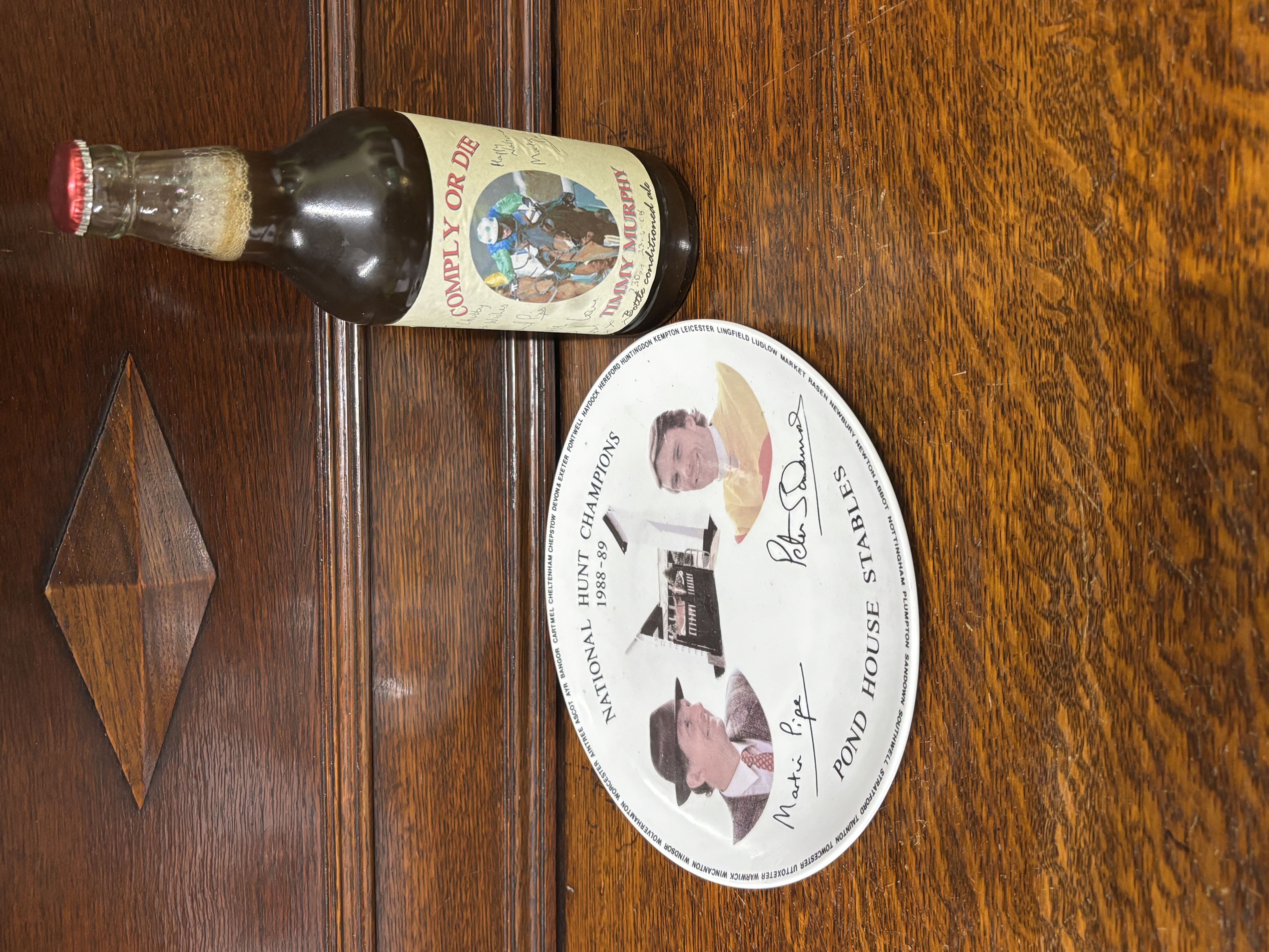 Two items of National Hunt horse racing memorabilia to include a signed commemorative bottle of ale and Astbury China Limited Edition Plate