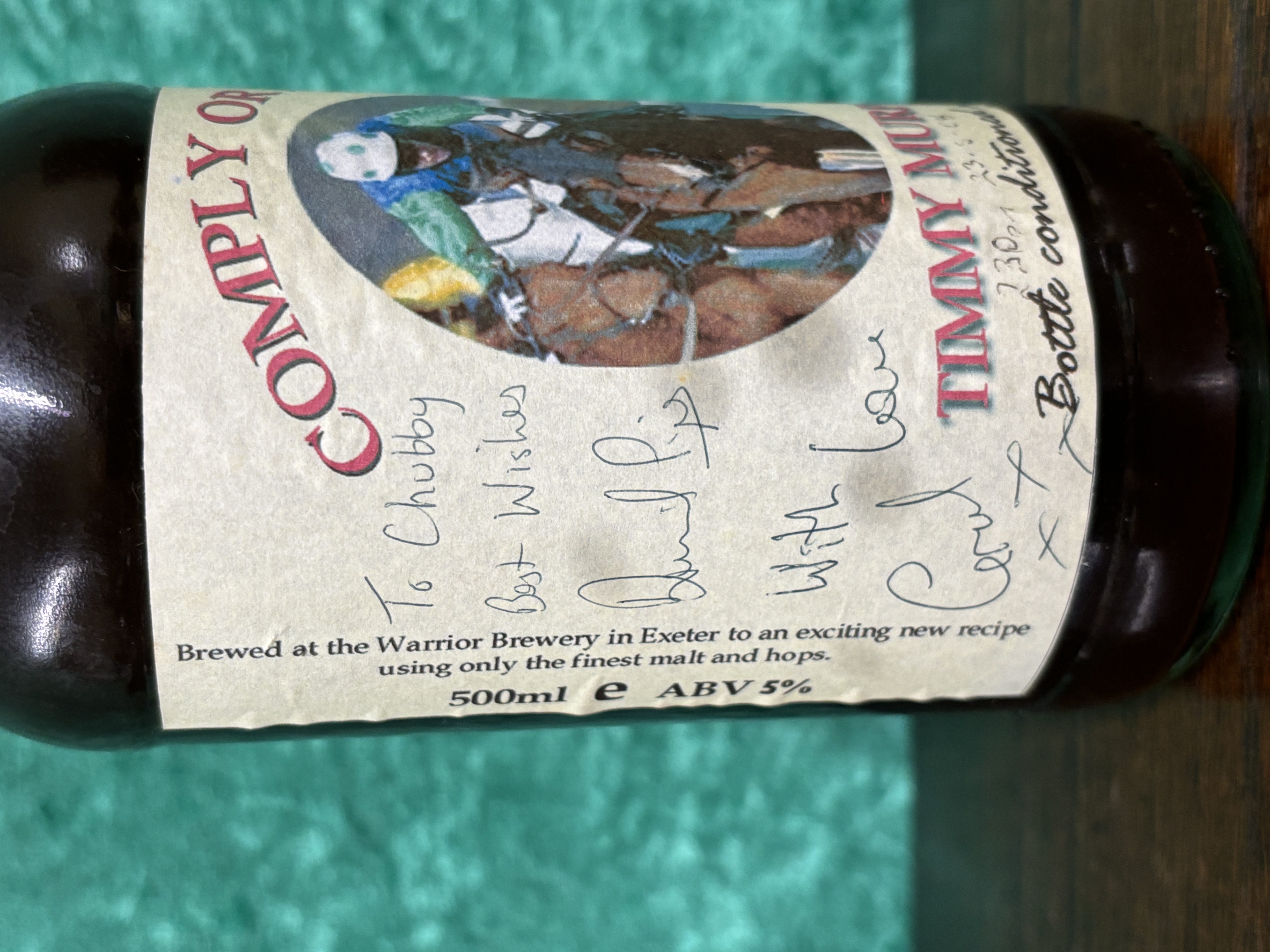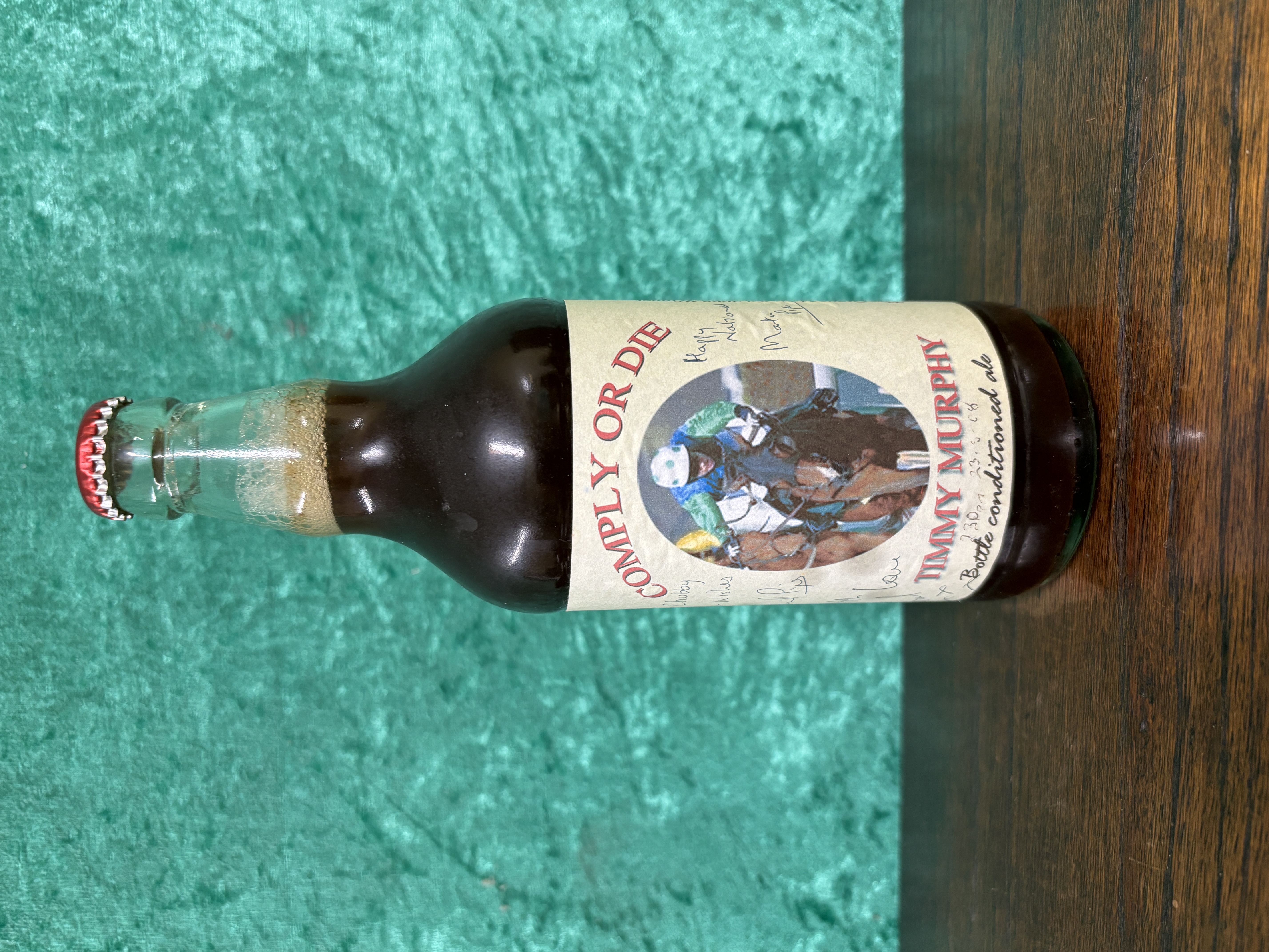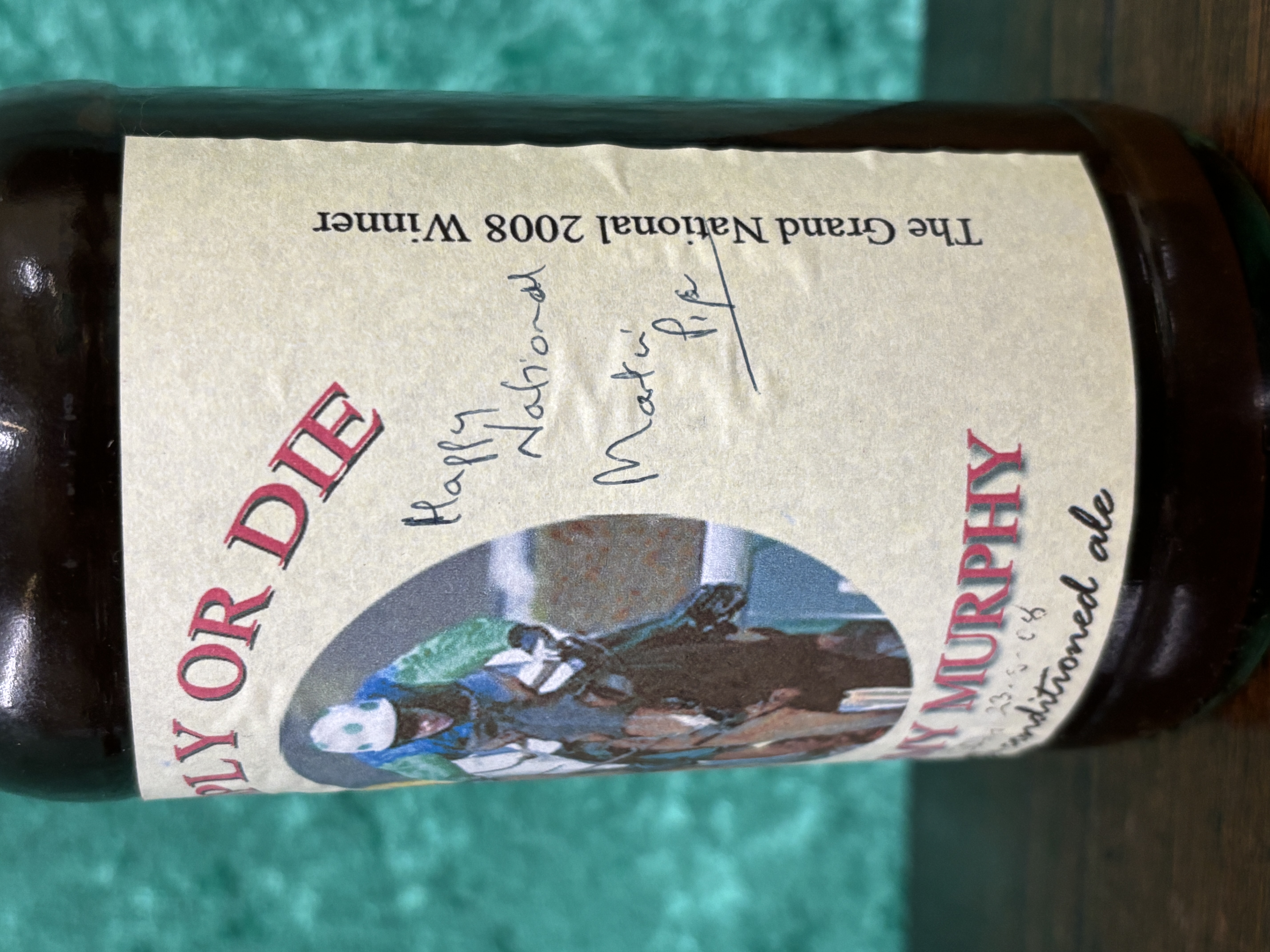 The second item is an unopened 500ml bottle of conditioned ale from the Warrior Brewery, Exeter, celebrating Comply or Die, the winner of the 2008 Grand National. The label identifies the horse and jockey Timmy Murphy and has an ABV of 5%. The label bears several handwritten ink inscriptions and signatures including Happy National Martin Pipe from the legendary trainer Martin Pipe CBE, and To Chubby Best Wishes David Pipe from the trainer of Comply or Die. It also features a personal inscription with love Carol x and a handwritten date and time of 7.30pm 23.5.08. The bottle is sealed with its original red crown cap.
