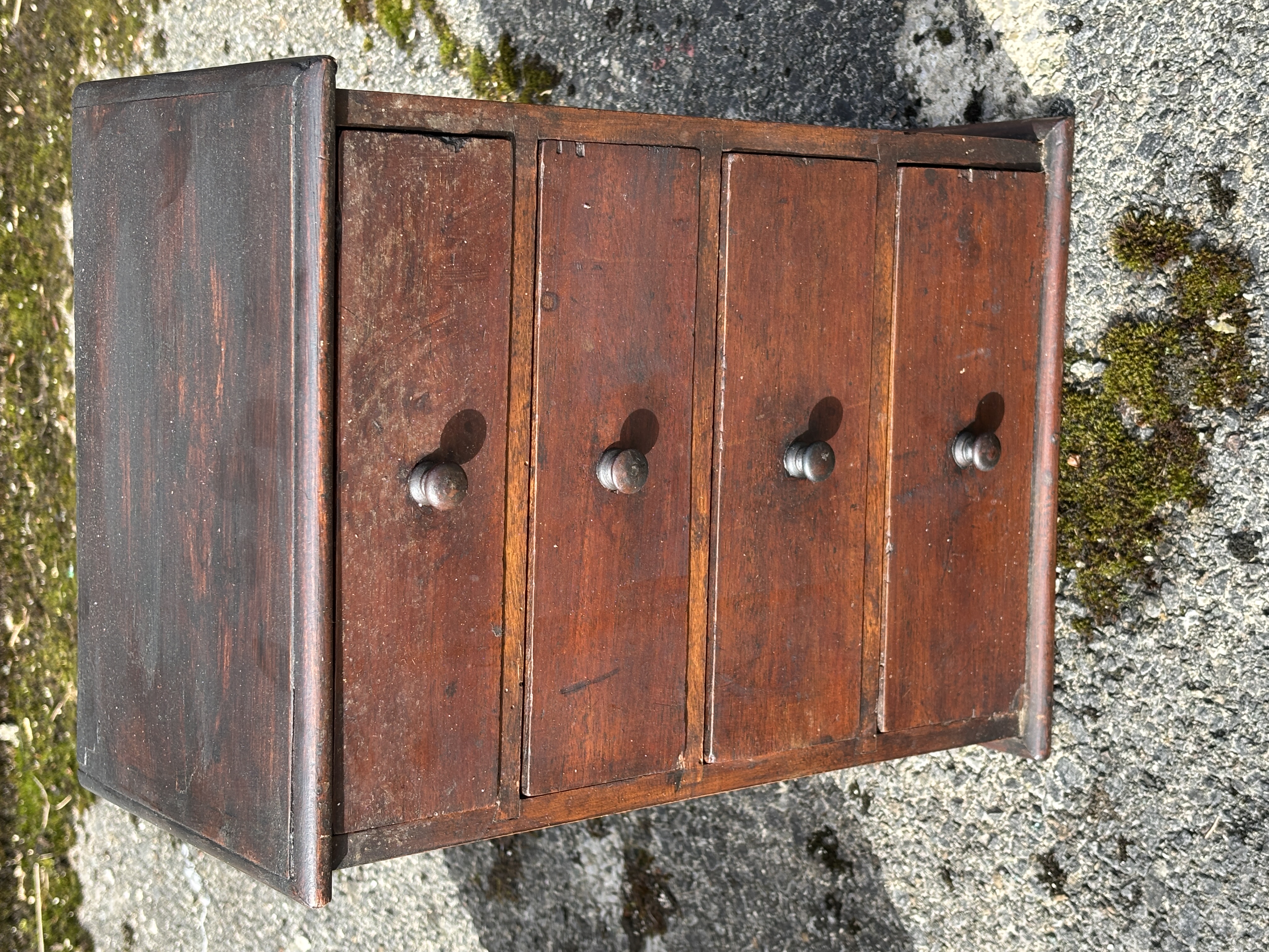 A 19th-century miniature mahogany chest of four drawers, of the type traditionally identified as an apprentice piece, specimen cabinet, or small apothecary chest measuring 38 cm high, 28 cm wide and 19 cm deep