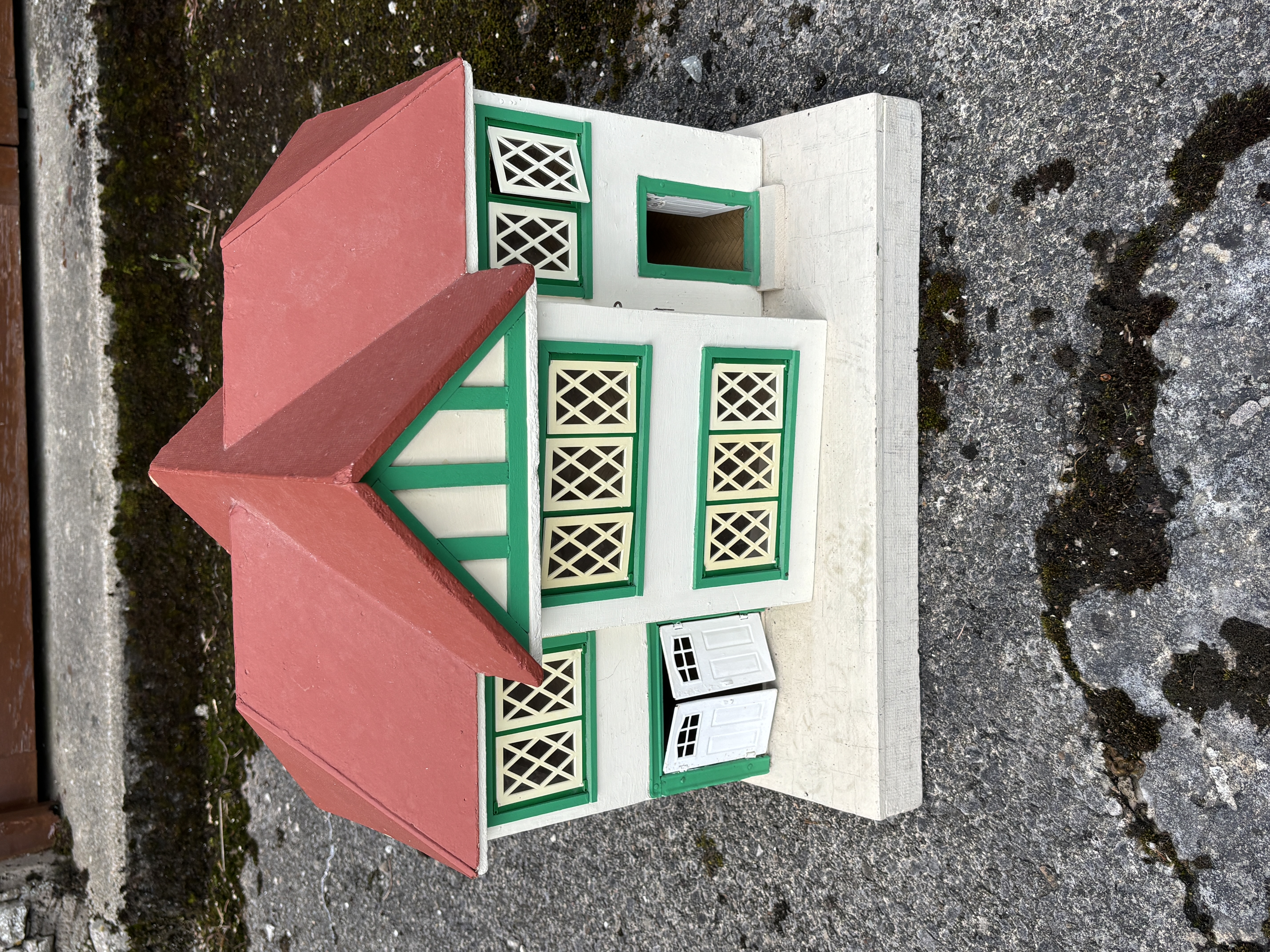 A vintage two-storey wooden dollhouse of British manufacture, designed in a traditional cottage style with Mock-Tudor architectural influences. The structure is primarily constructed from plywood and solid wood, featuring a red-painted pitched roof and a front-facing gable with green-painted faux timber framing. The exterior is finished in off-white with green-painted window frames and trim. The house is mounted on a rectangular white-painted wooden base. The facade includes multiple lattice-work windows, with several opening casements featuring diamond-pane detailing. A large hinged front panel opens to reveal a two-room interior. The rooms are decorated with vintage patterned floral wallpaper, and the floors feature a parquetry-effect design in a herringbone pattern. A small internal door is located on the ground floor. No maker marks are present, though the design is consistent with mid-20th-century manufacturers such as Tri-ang or Gee-Bee.