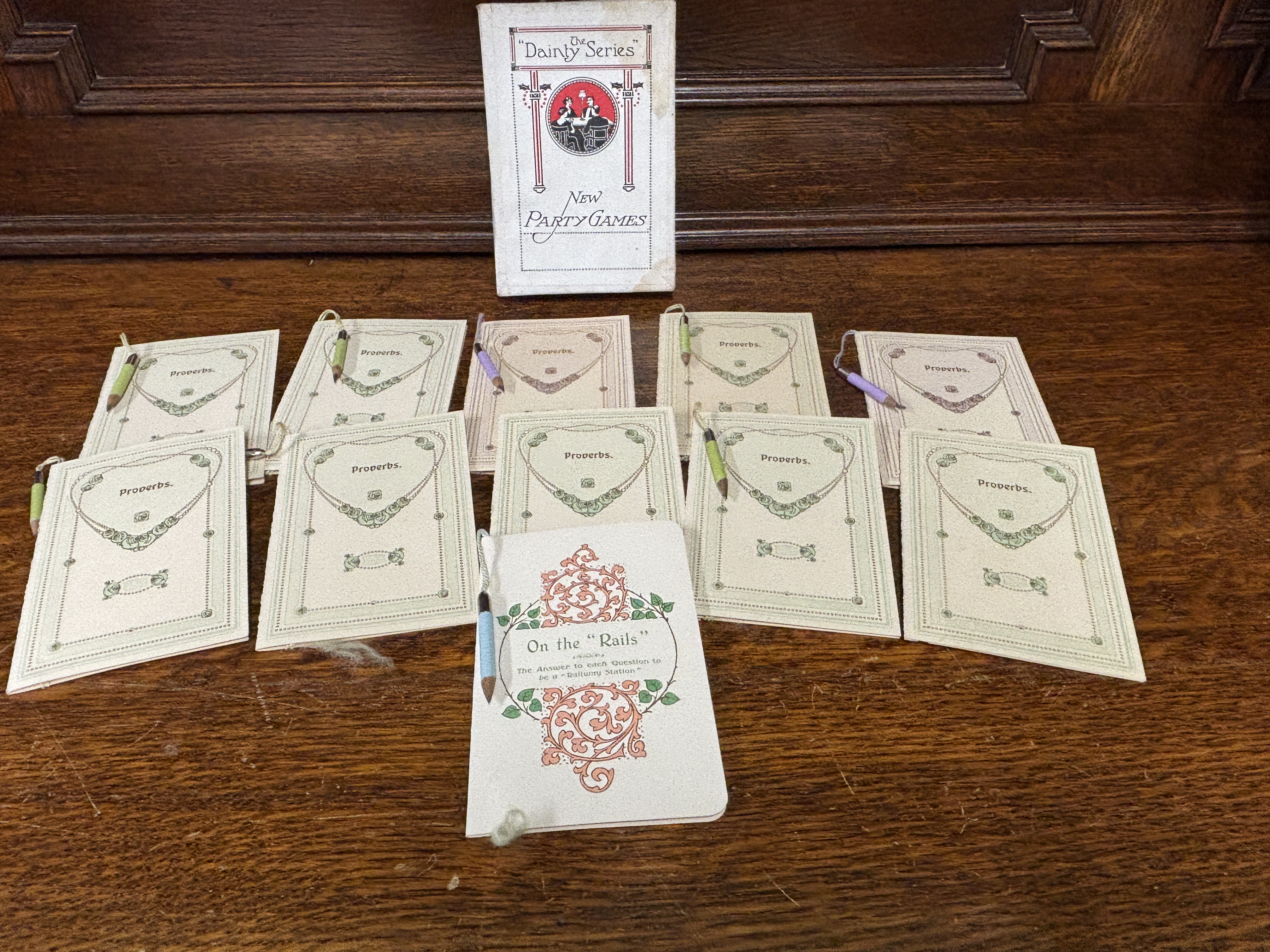 The Dainty Series – ten Proverbs cards, seven with attached pencils together with another entitled “On the Rails” with attached pencil
