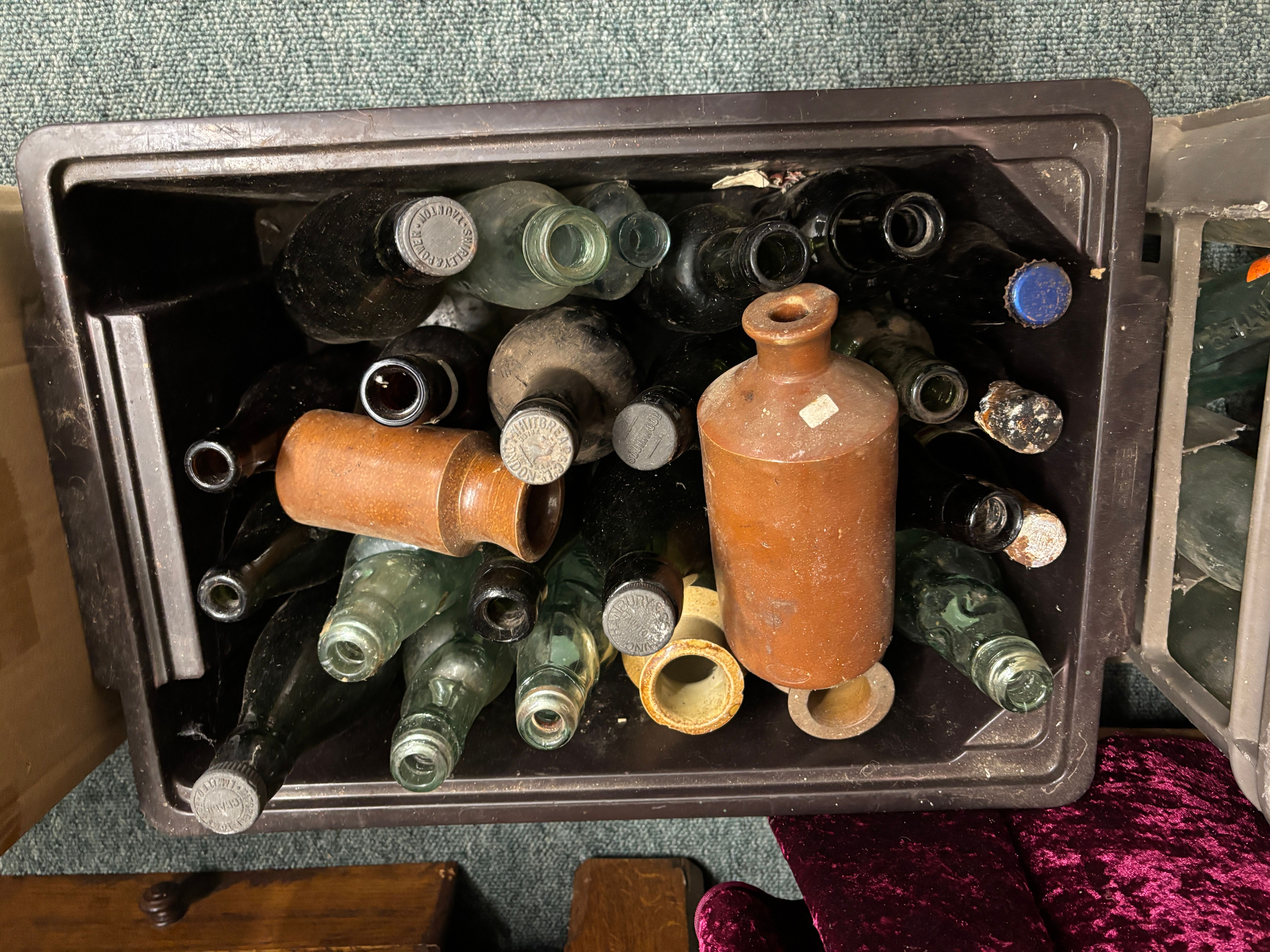 A quantity of glass and stoneware bottles in black crate