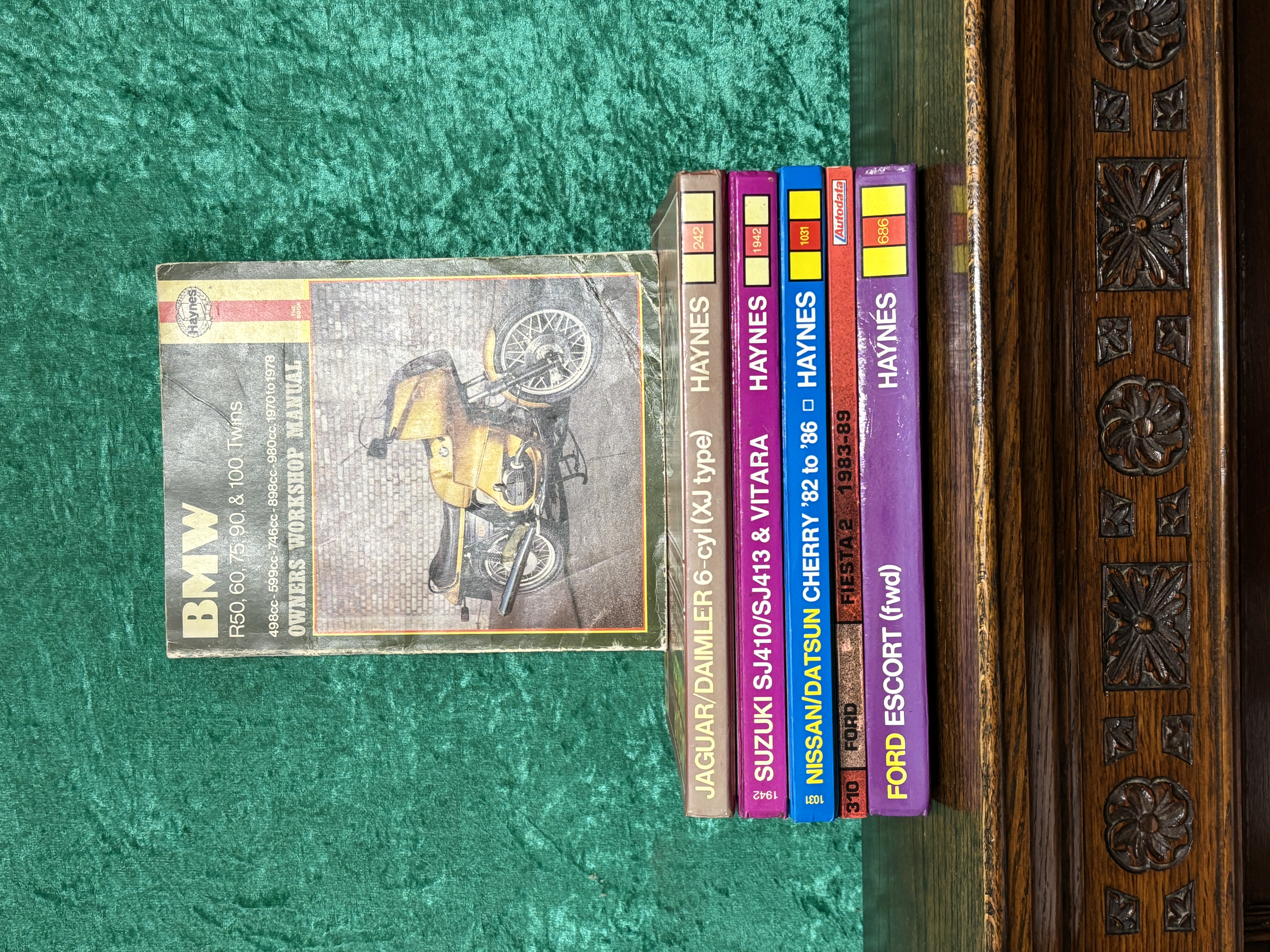 A collection of six automotive workshop manuals comprising five Haynes Owners Workshop Manuals and one Autodata Service and Repair Manual. The Haynes titles include a softcover manual for BMW R50, 60, 75, 90, and 100 Twins (1970-1978) covering 498cc, 599cc, 746cc, 898cc, and 980cc models. The remaining Haynes manuals are hardcover editions including Jaguar/Daimler 6-cylinder XJ type (Manual No. 242), Suzuki SJ410/SJ413 and Vitara (Manual No. 1942), Nissan/Datsun Cherry 1982-1986 (Manual No. 1031), and Ford Escort front-wheel drive (Manual No. 686). The Autodata manual is a hardcover Service and Repair Manual for the Ford Fiesta 2 1983-1989 (Manual No. 310). The manuals feature printed covers with technical diagrams and photographic illustrations.